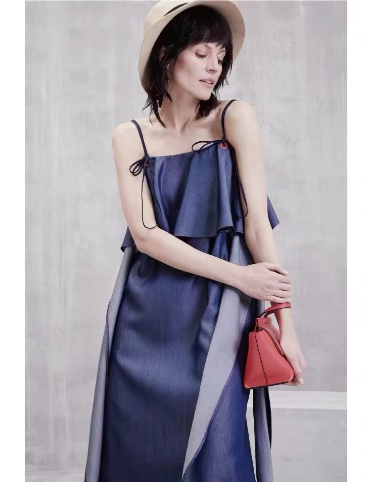 牛仔蓝色连衣裙,吊带系绳设计,H版型齐胸荷叶边,时尚休闲,采用高科技精梳棉,舒适柔软透气