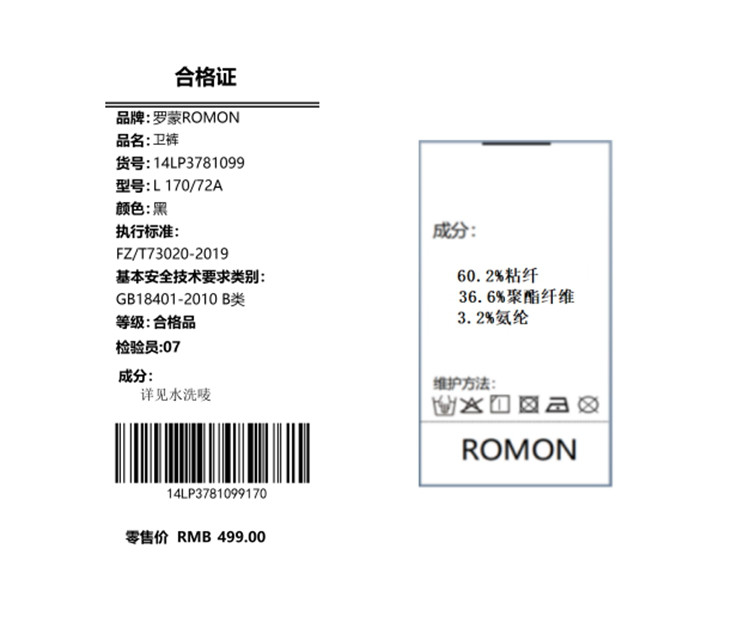 面料:60.2%粘纤 36.6%聚酯纤维 3.2%氨纶