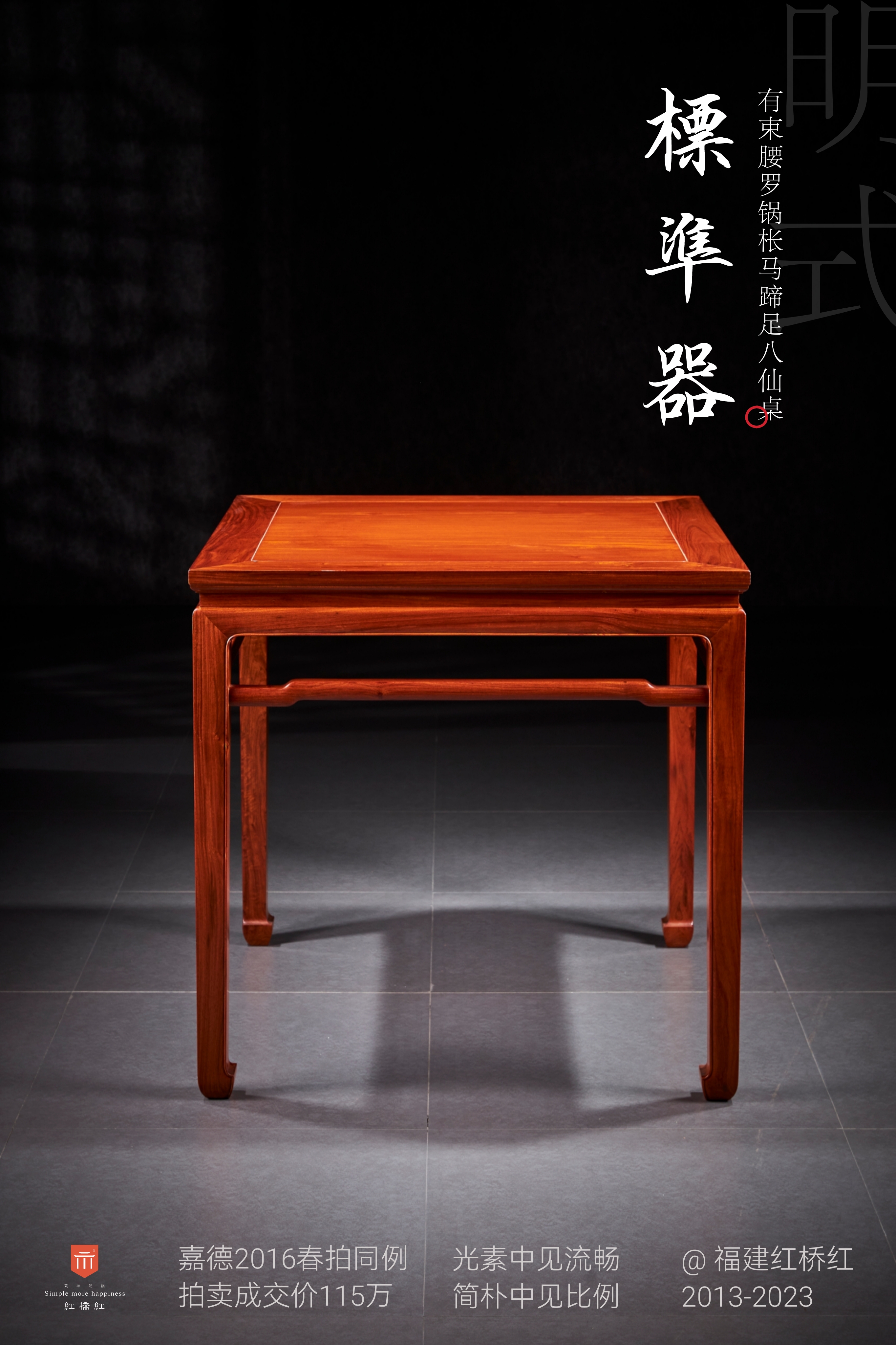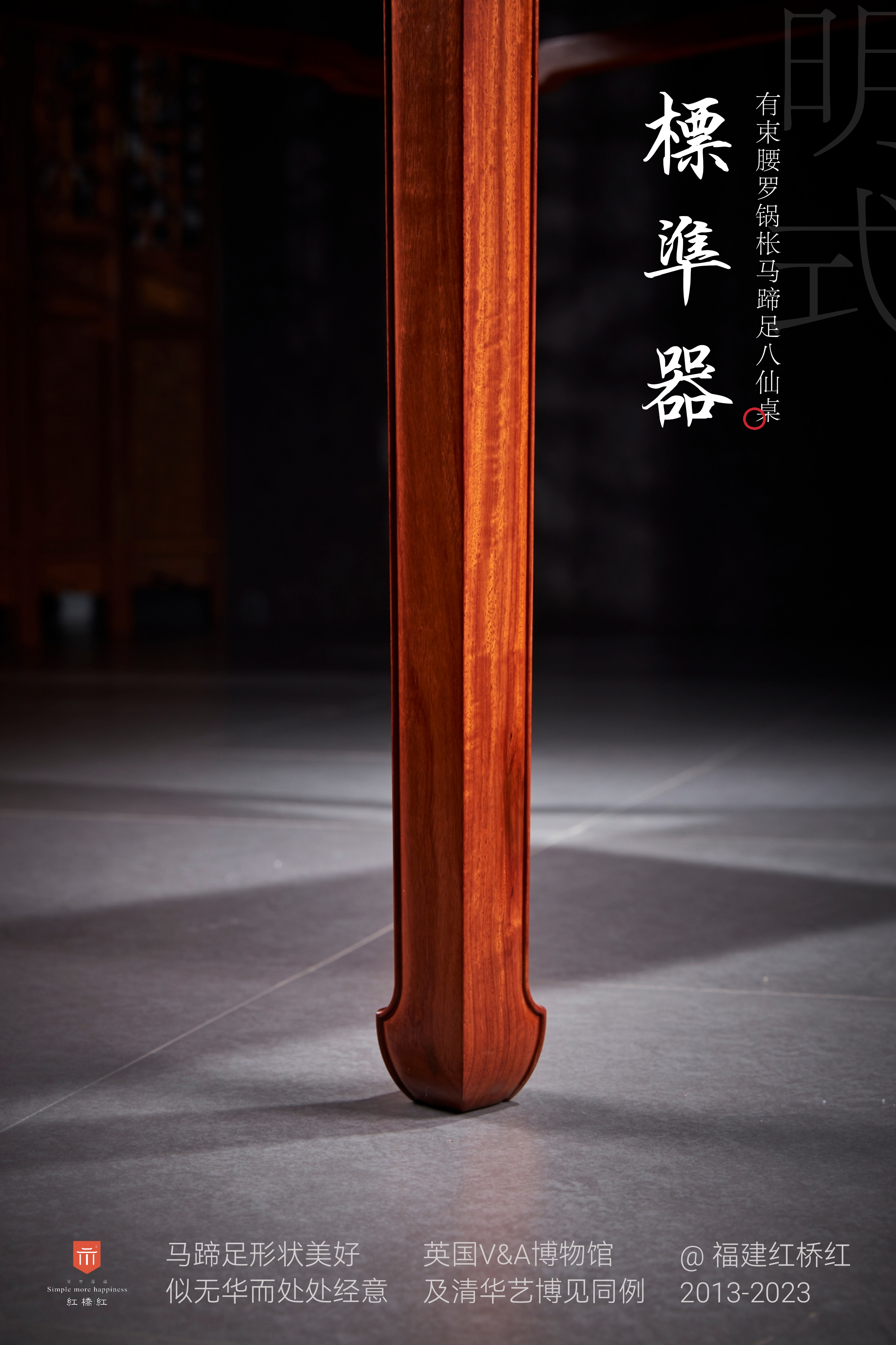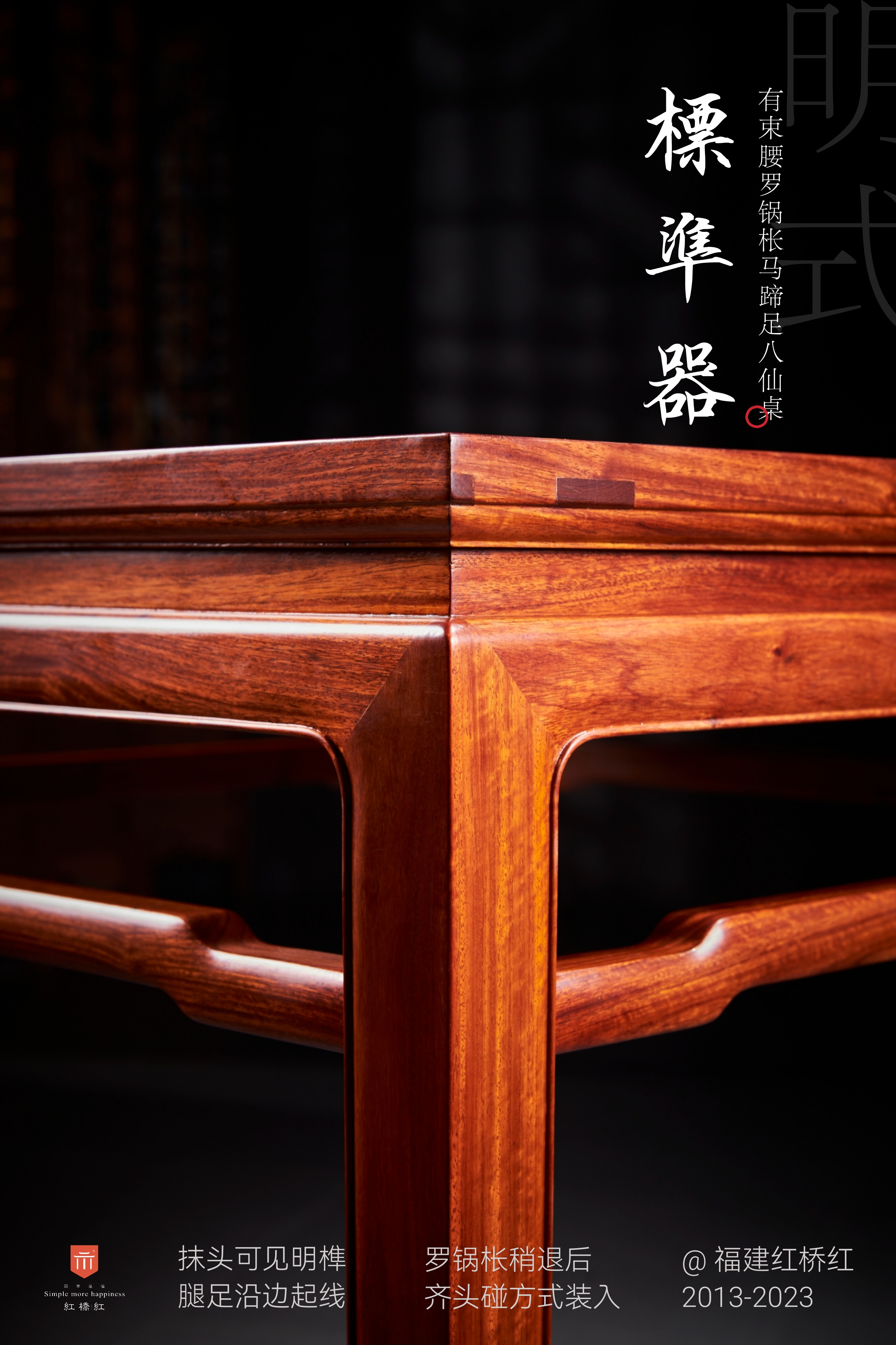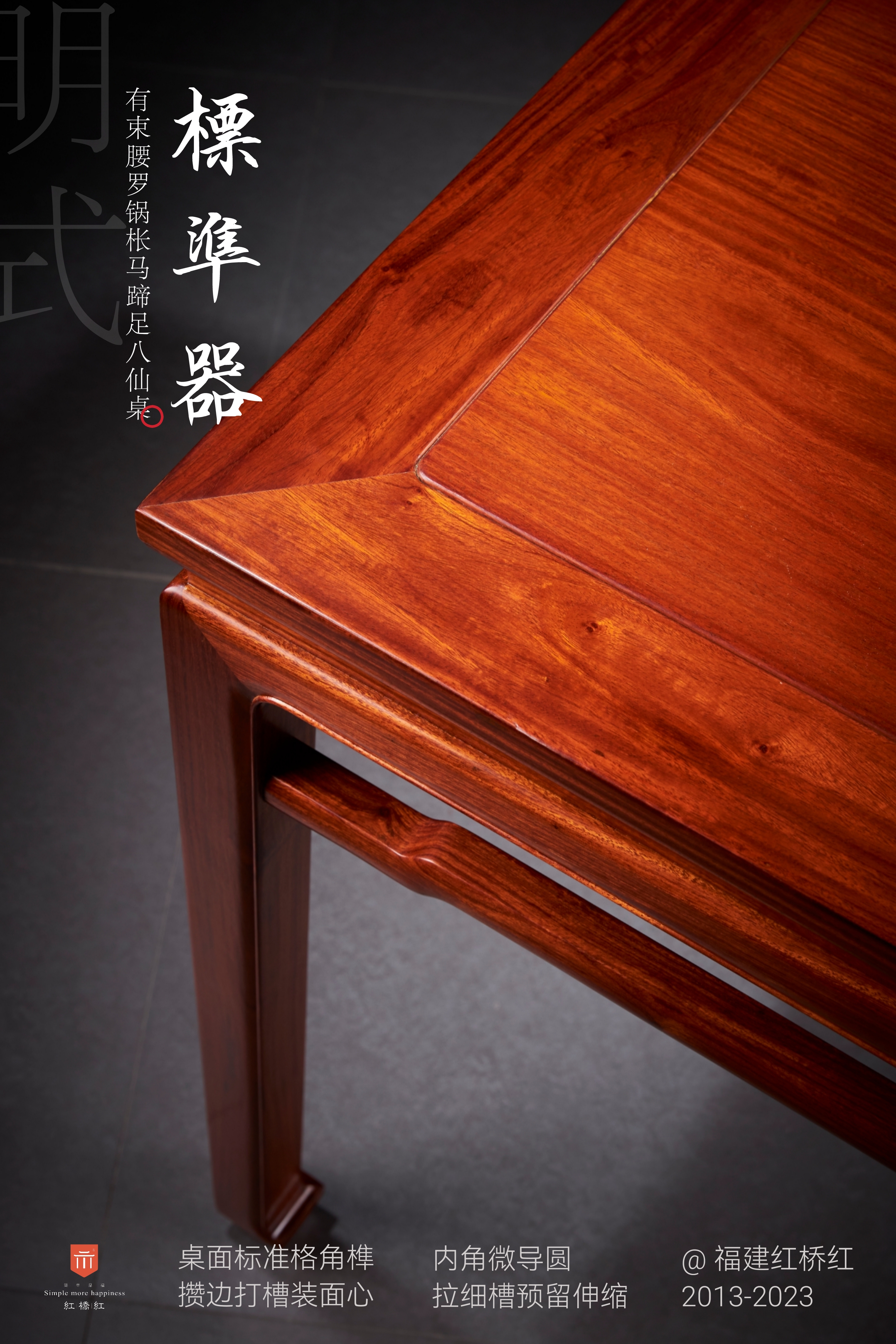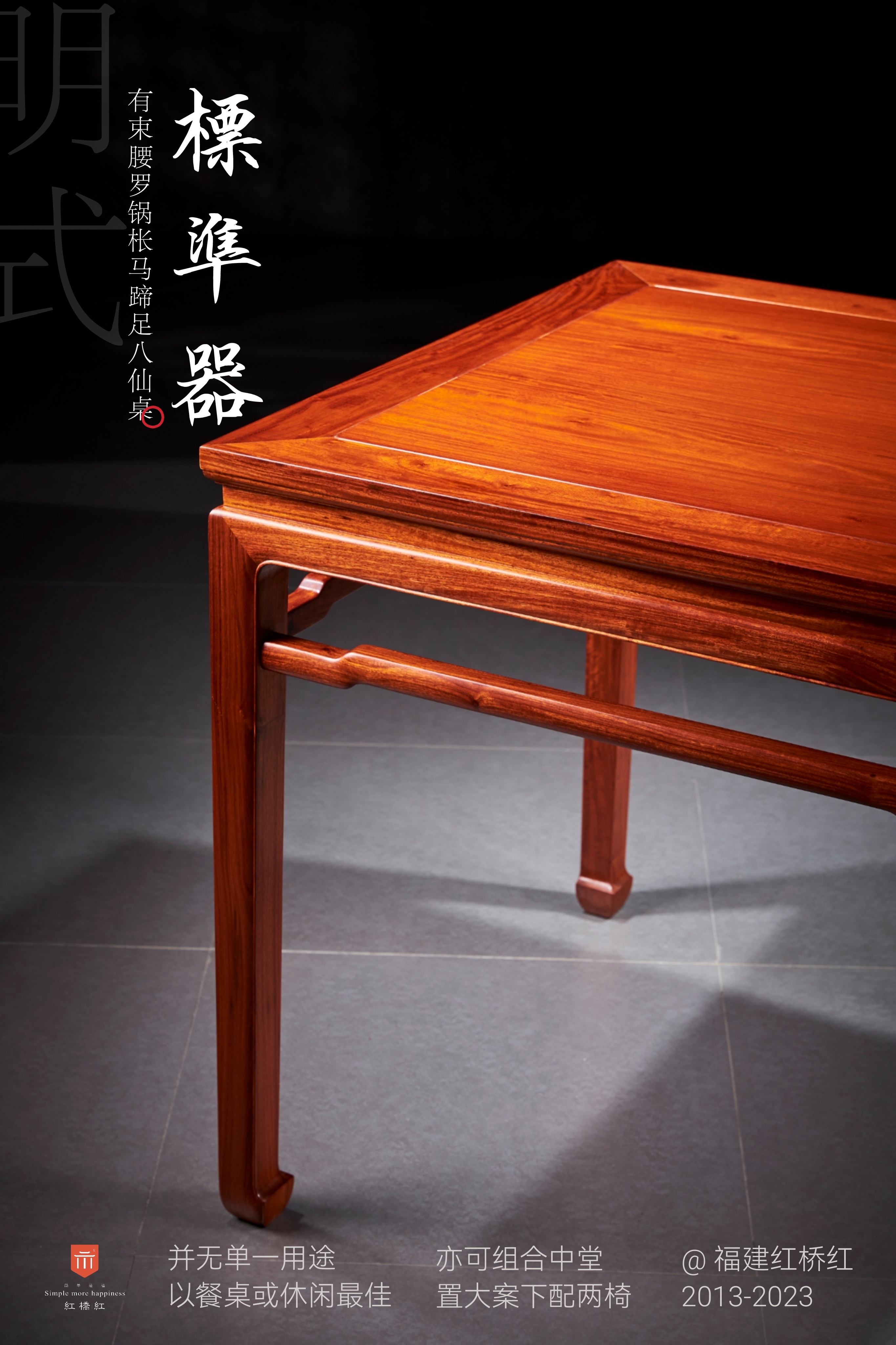 此款明式八仙桌,为缅甸花梨制,有80、88、98三规格同款在售。四边等长,桌面以格角榫攒边镶面芯板,下置穿带,抹头见透榫,边抹冰盘沿上舒下敛;矮束腰,束腰与直牙条以抱肩榫与腿足结合;腿间安一木整挖罗锅枨,中间高拱、两头低弯,四足方材,微侧脚,沿边起阳线自牙板顺足而下,内翻马蹄足,兜转有力。整器可谓为明式八仙桌之标准器。
