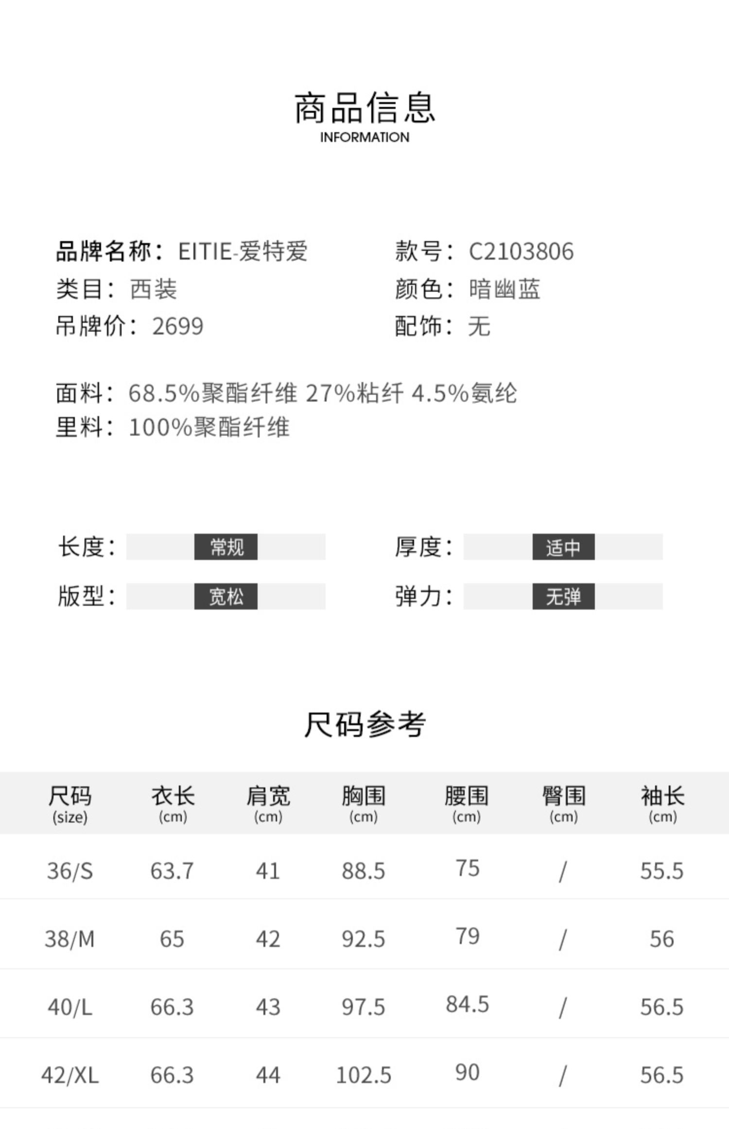 EITIE爱特爱秋季新款时尚帅气中性百搭显瘦收腰职业西装外套C2103806