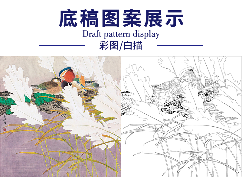 周彦生花鸟工笔画白描底稿《雪景鸳鸯》四尺斗方临摹勾线高清打印稿A667