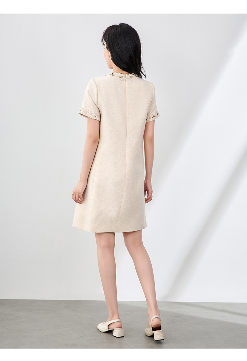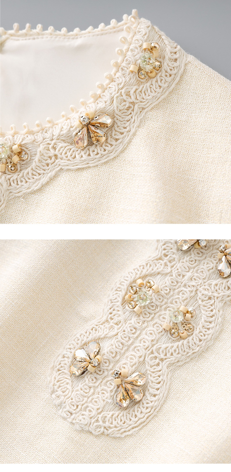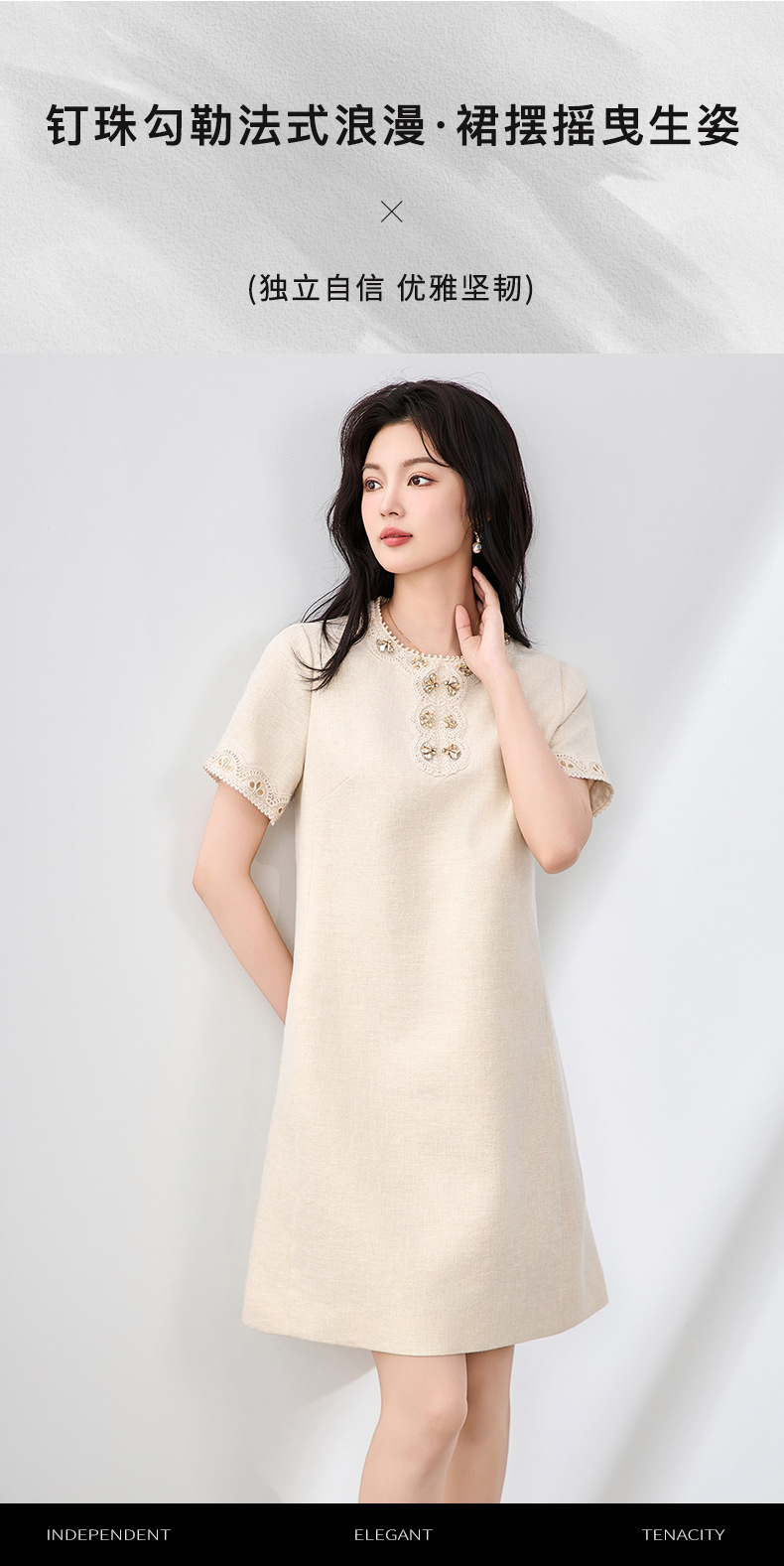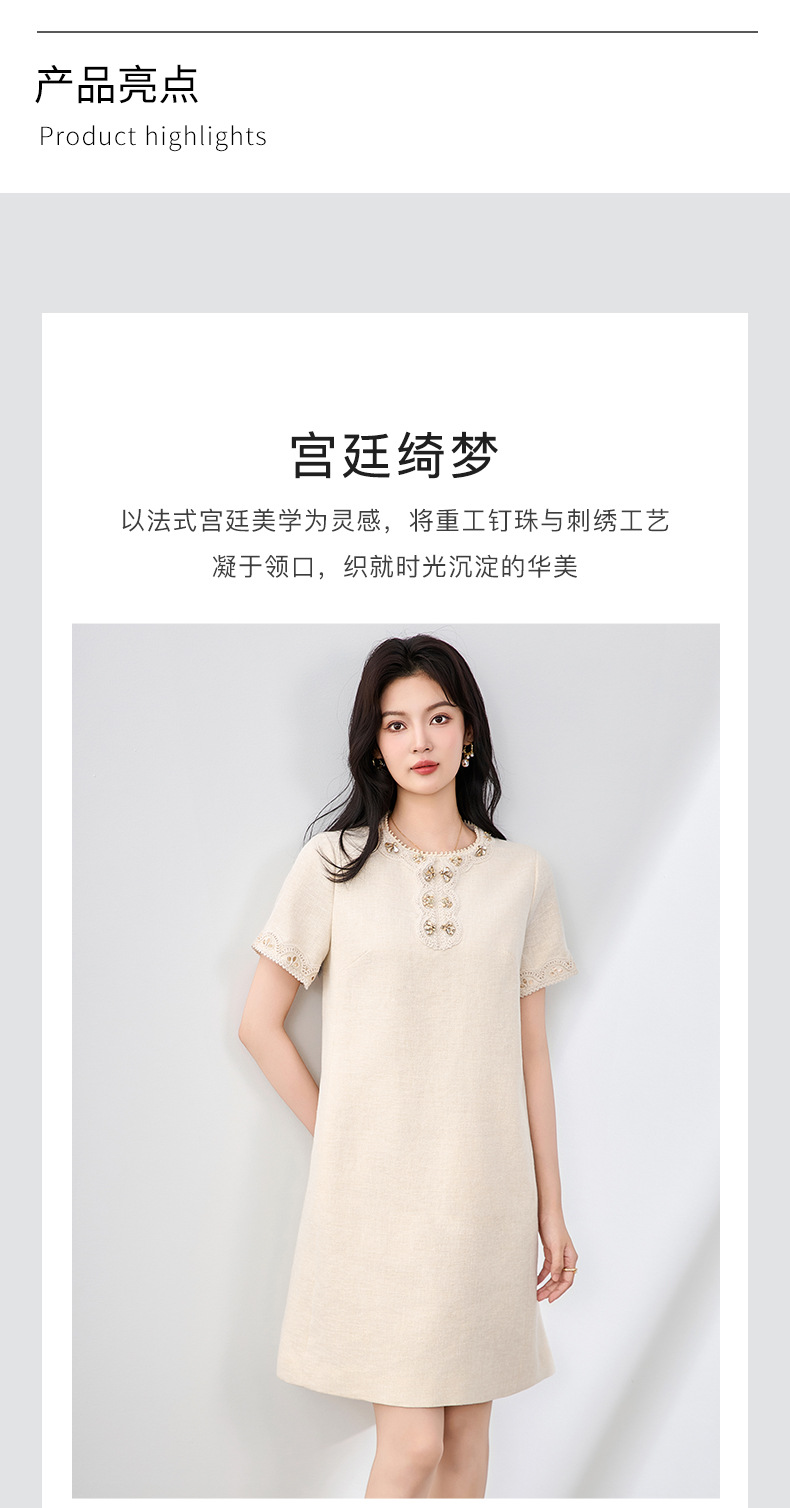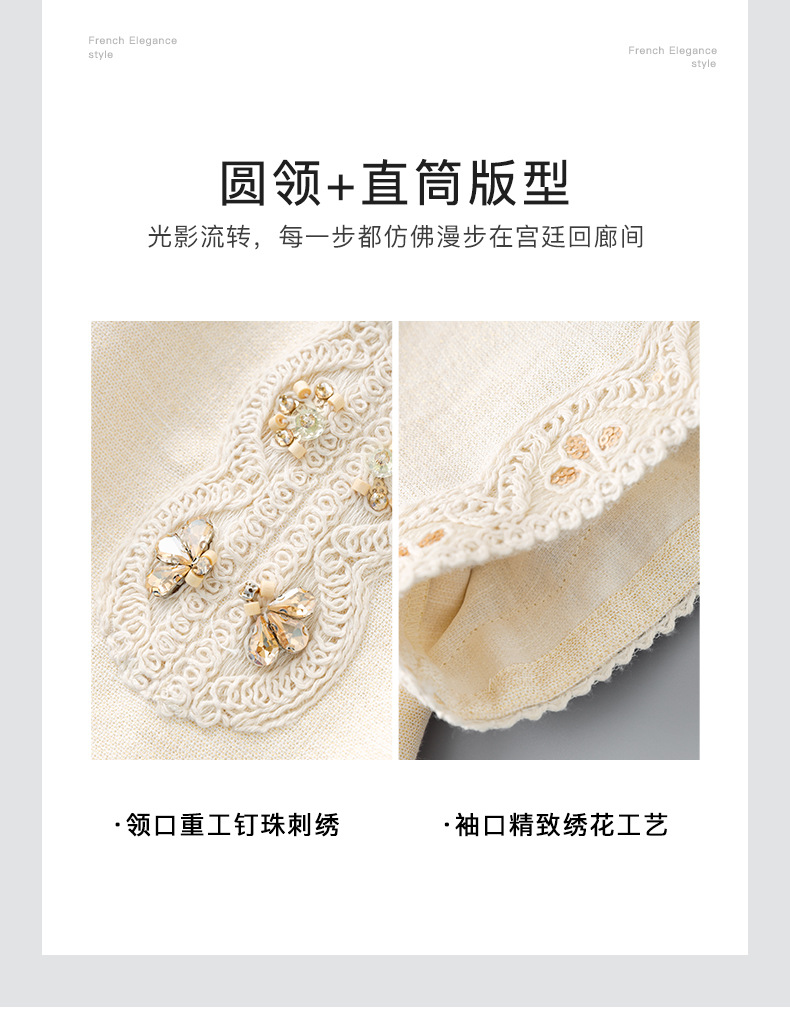 「高货wl」全新升级【铂金会员367/天猫489/差价122】(92656)洛诗琳法式宫廷风重工钉珠刺绣花边金丝麻显瘦A字连衣裙