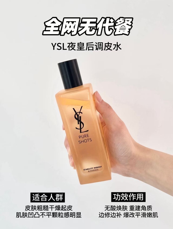 👑️YSL 圣罗兰夜皇后调皮水 150ml 💥毛孔里的精华水—无酸焕肤! 🌺核心:仙人掌花精粹、高浓度SP-3修护因子 💎有效:加速老废角质代谢、修复受损角质层,对皮肤非常温和 ✨9:1水油配比,用前摇匀,肤感清爽不粘腻,上脸吸收超快 👏坚持使用,肌肤焕亮很光滑 💦适合:干/油皮,混干/油皮,熬夜后暗沉、皮肤粗糙人群,敏感肌慎用 🎈【可含酒精,敏感肌需耳后测试无反应,再上脸】