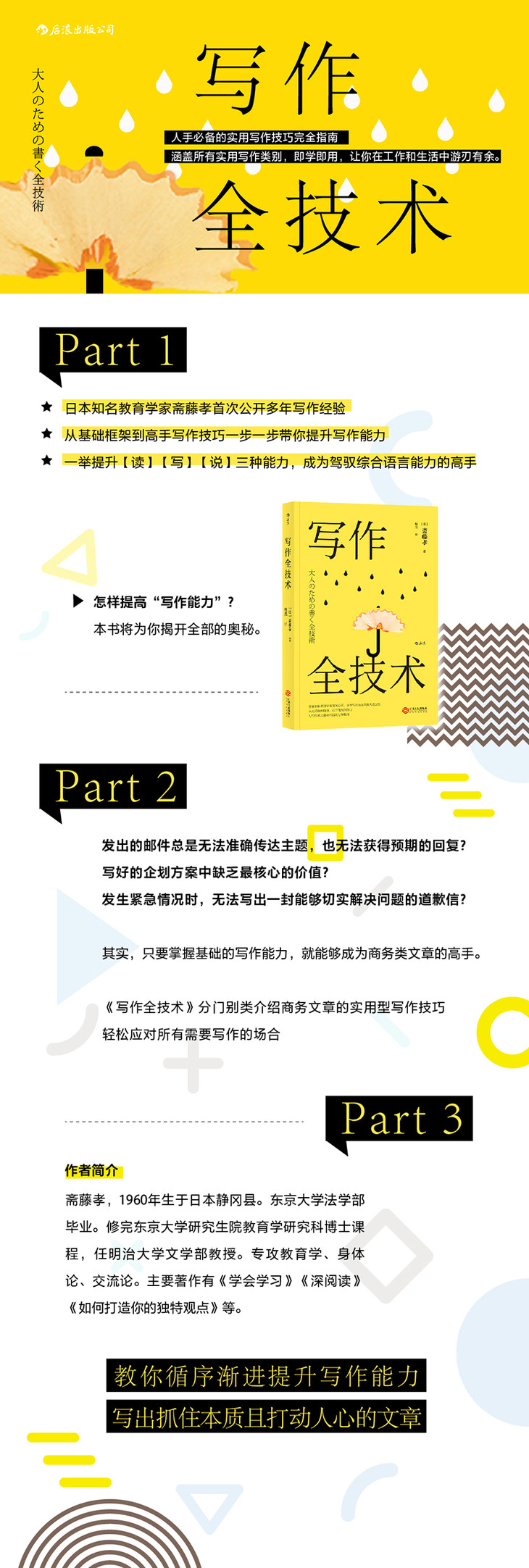普通的商务人士,在工作中的写作量极少有能抵得上写一本书的。即便如此,他们还是不得不在各种场合写作,比如每天的邮件、信函、企划方案,等等。