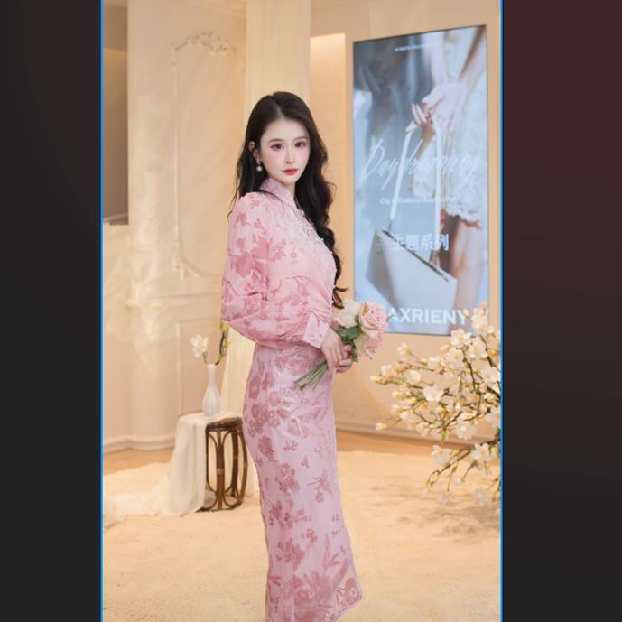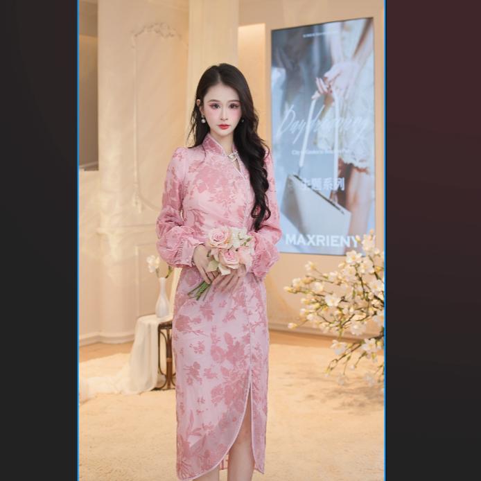 MAXRIENY2024年烧花丝绒显百粉色新中式连衣裙连衣裙碎花显瘦气质(货号:MF85DR753)