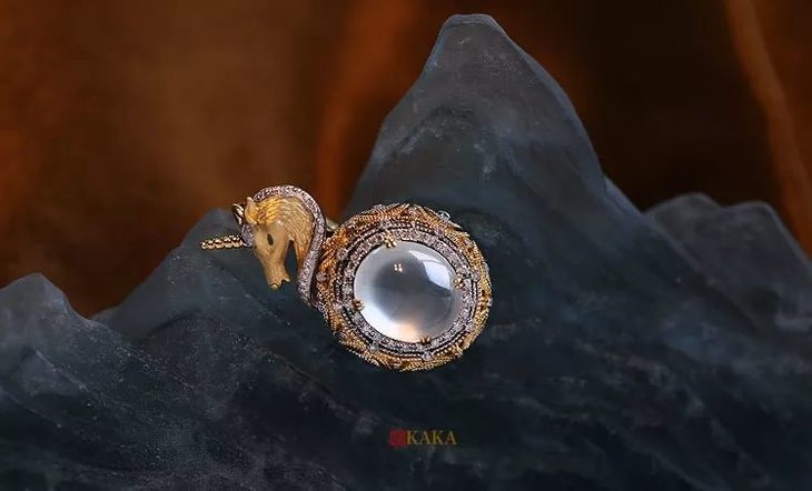 它冷峻高傲,带着贵族的血统,英勇而智慧,翩翩如极有教养的王子,那白马一般丰神俊朗的身姿,那独特的螺旋角,一出场就闪耀万丈光芒。传说中的它勇猛,然而喜欢纯洁和天真,易受美丽少女诱惑,而正是这不完美,才让它更有了真实的力量,让人心中一动。每每读到独角兽出场的章节,心中就平静下来,知道它一定能解救众人,它的角能解万毒。如果说,珠宝已经被人们在如今,当作一种记事的珍贵而恒久的工具,而越是珍贵的珠宝,它也更容易受到珍视,常伴身侧,起到提示作用。这次因为疫情,我们都隔离在家,很多情侣之间的相处,白玻璃种双圈荧光,茅台级别翡翠大圆蛋来做独角兽的设计,作为挂坠和胸针两用,它在佩戴的时候,可以有几种搭配方式,更为灵活。 外形尺寸:33.7x18.5x10.5(mm)