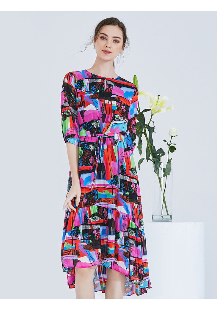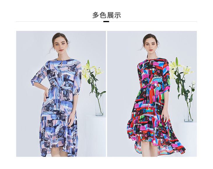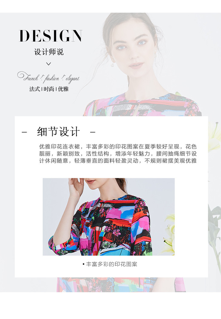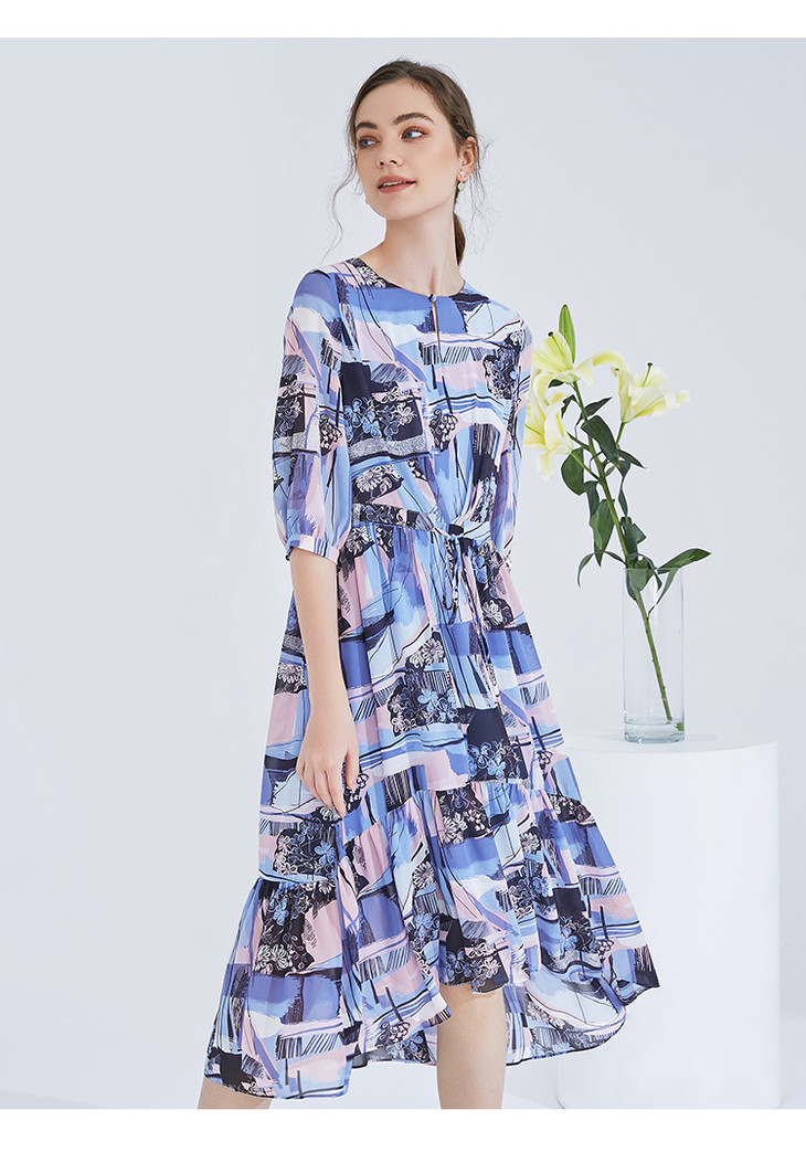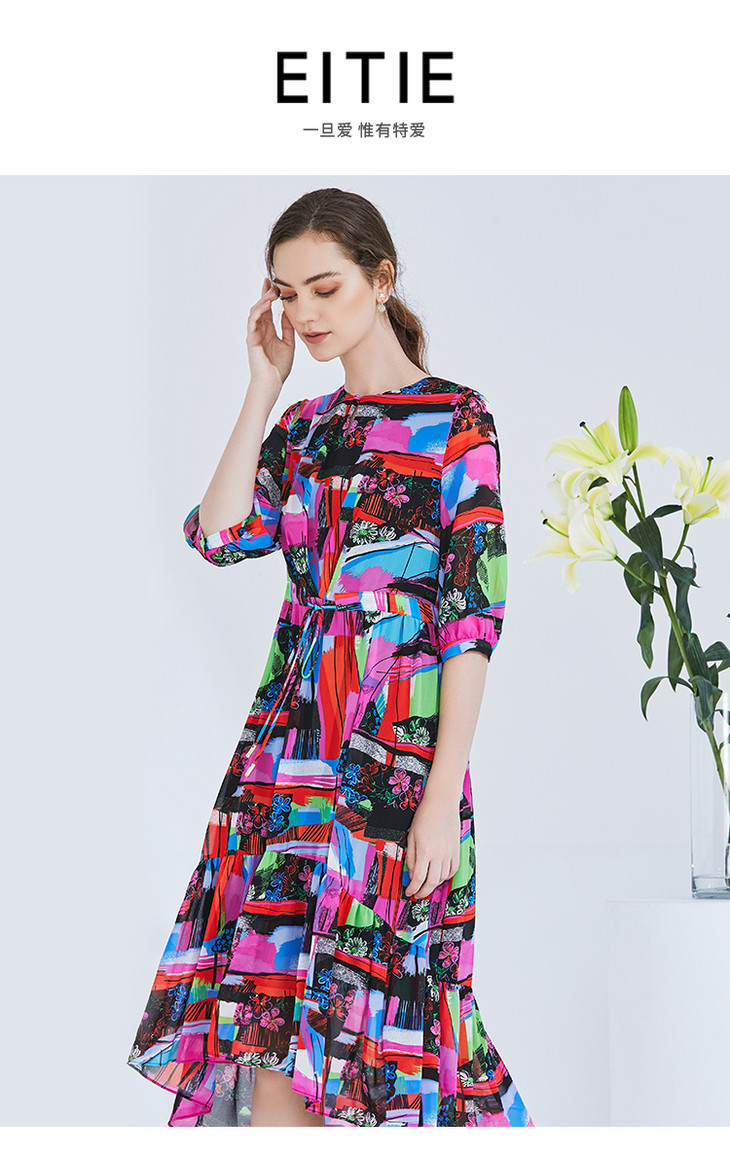 EITIE爱特爱女装夏季新款五分袖优雅不规则印花连衣裙中长款5907636