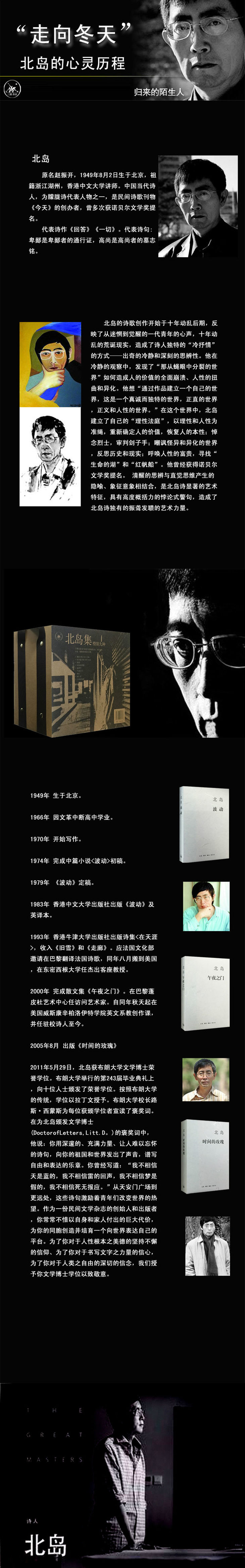 赵振开(1949-),笔名北岛、石默,祖籍浙江,生于北京。汉族,1969年当建筑工人,80年代末移居国外。1978年,北岛和诗人芒克,创办了民间诗歌刊物《今天》。1990年,旅居美国,曾任教于加州戴维斯大学,现为香港中文大学东亚研究中心人文学科讲座教授。北岛的诗歌创作开始于十年动乱后期,反映了从迷惘到觉醒的一代青年的心声。清醒的思辨与直觉思维产生的隐喻、象征意象相结合,是北岛诗显著的艺术特征,具有高度概括力的悖论式警句,造成了北岛诗独有的振聋发聩的艺术力量。著有诗集《太阳城札记》、《北岛诗选》以及散文集<失败之书>等。