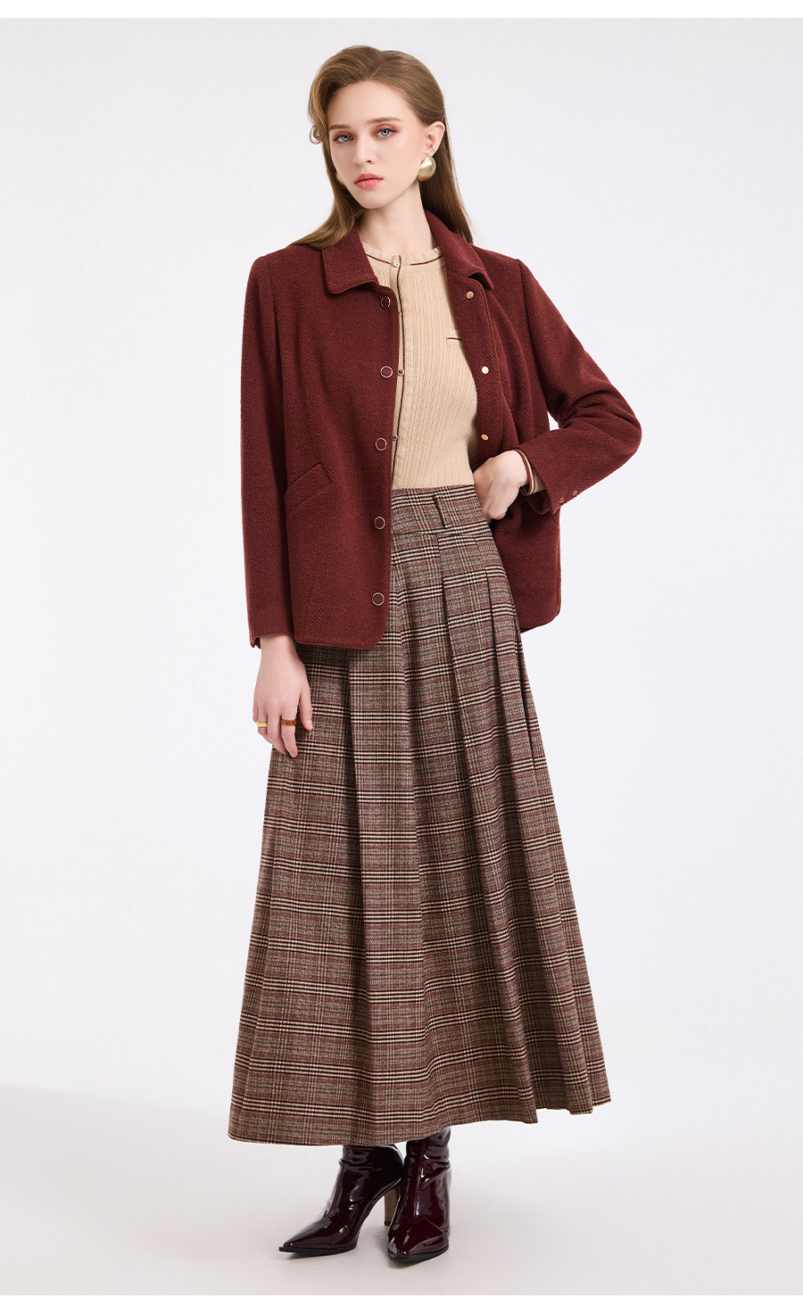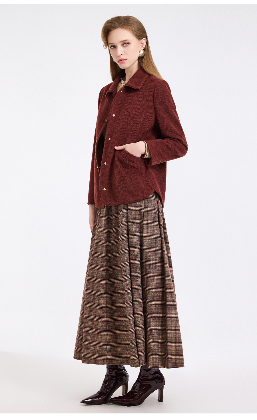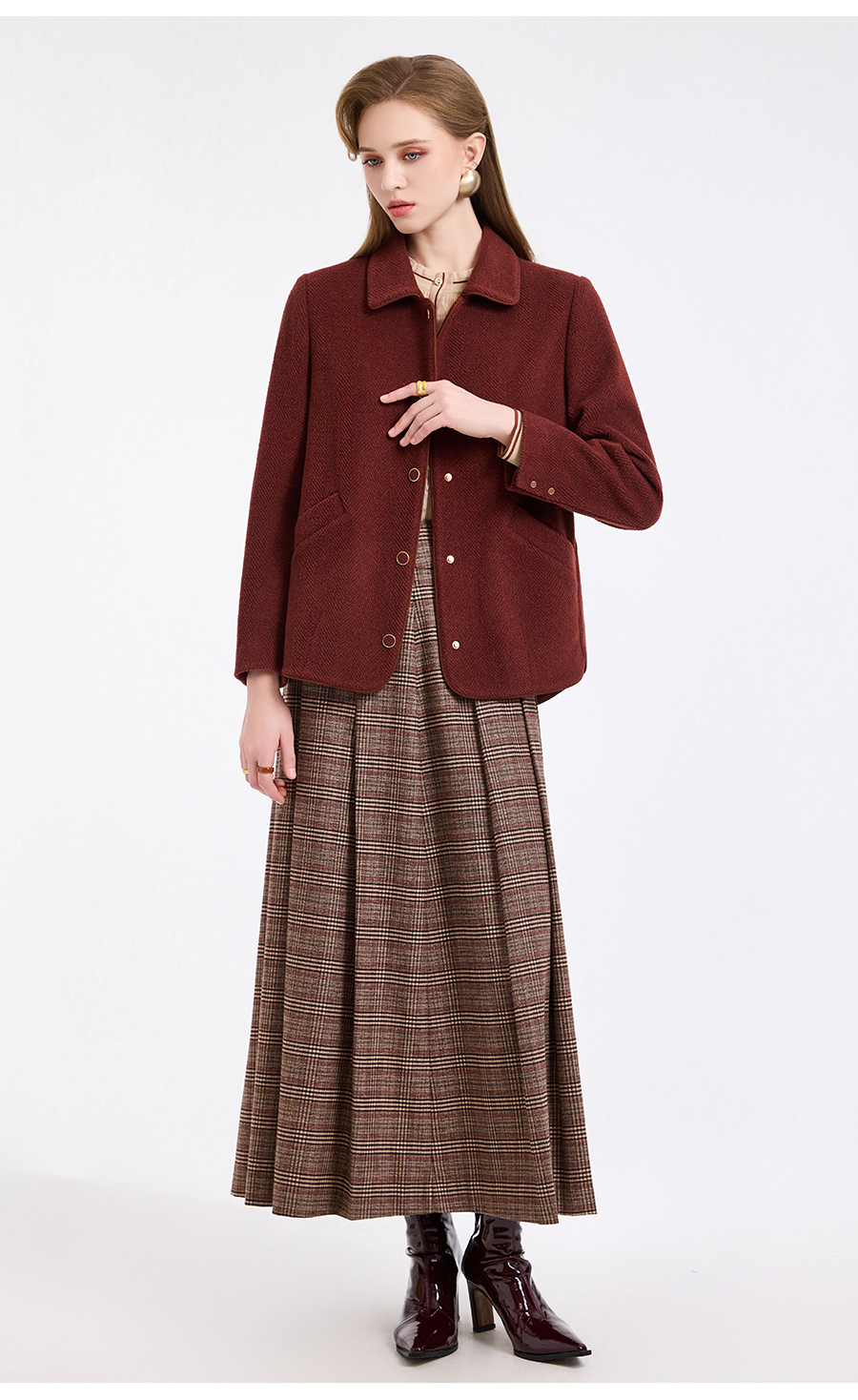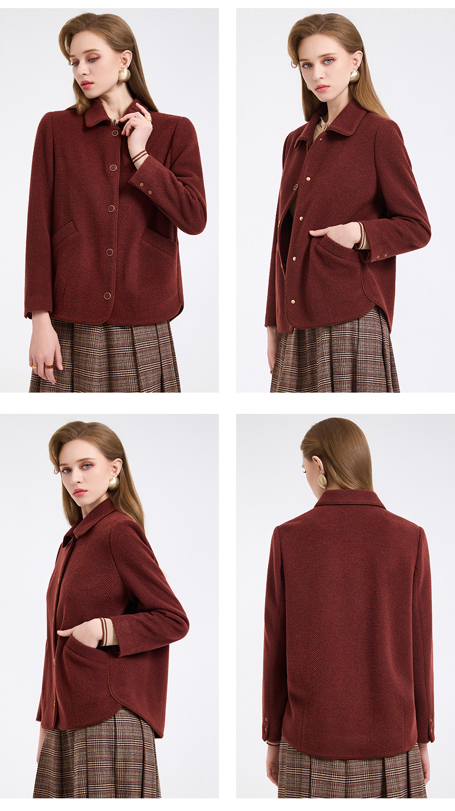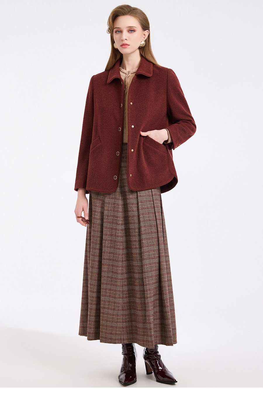乔万尼新品驼绒羊毛混纺高级感烟熏红翻领短款羊毛大衣ED4B752