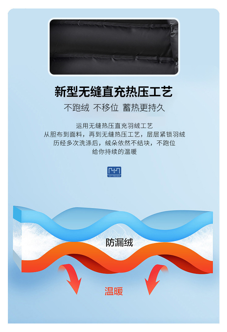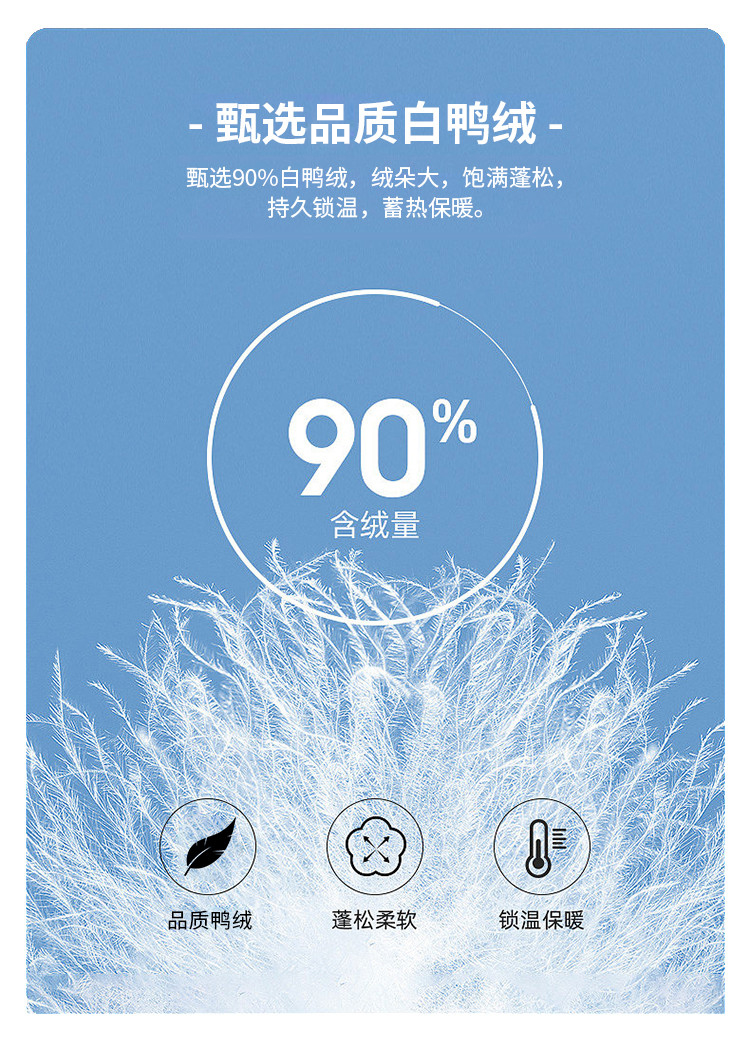 面料上层:100%聚酯纤维(非纤维物质除外) 面料下层:100%聚酯纤维(非纤维物质除外) 里料:100%聚酯纤维(非纤维物质除外) 胆料:100%聚酯纤维(非纤维物质除外) 填充物1:100%聚酯纤维 填充物:白鸭绒(绒子含量90%)