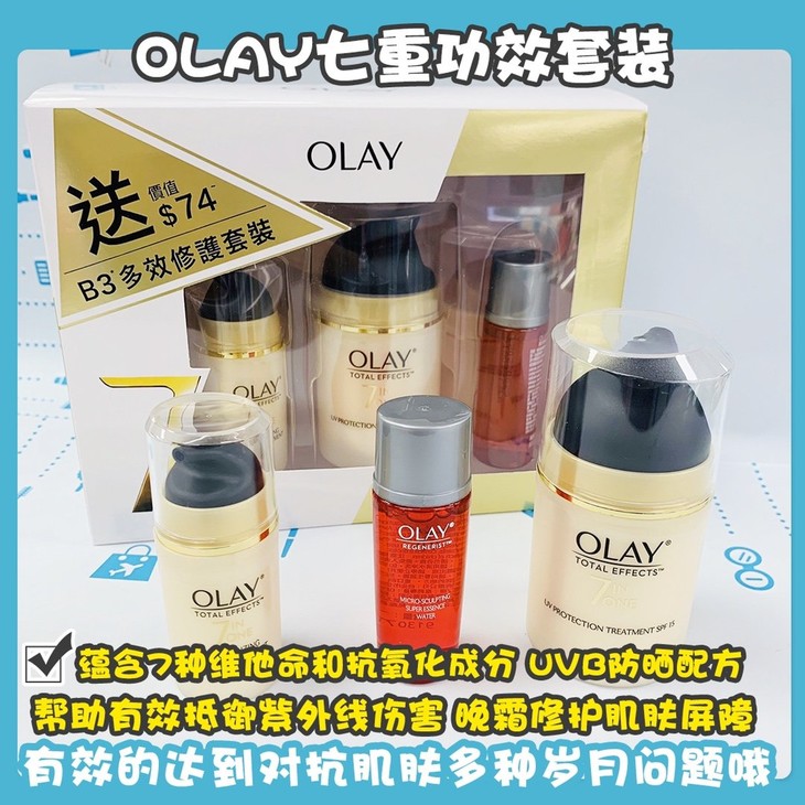 OLAY七重功效套裝 👍玉兰油多效修护防晒霜,蕴含7️⃣种维他命和抗氧化成分,UVB防晒配方☀,帮助有效抵御紫外线伤害👊。晚霜修护肌肤屏障,紧致活肤露还可以水润肌肤💦,提升肌肤的弹性➰。想要改善干燥肌肤🍂、淡化色斑提亮暗沉肤色、抚平细致紧致毛孔效果💆选这个套装绝对ok。配合这个系列的产品使用✔,更加有效的达到对抗肌肤多种岁月问题哦🕔~套装包括:晚霜14g➕防晒霜50g➕高效紧致活肤露18ml