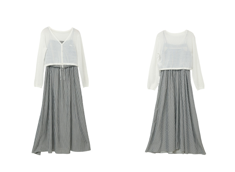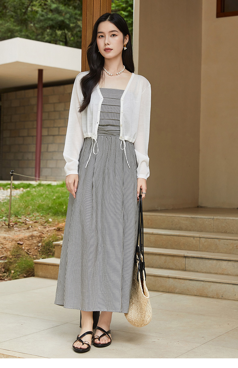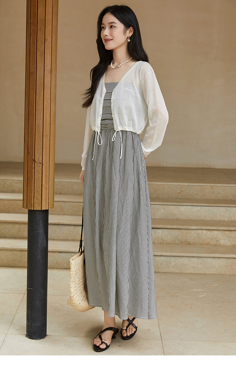 条纹吊带连衣裙 + 防晒开衫两件套女 2026 春夏新款 V 领抽绳短款罩衫 显瘦遮肉长裙