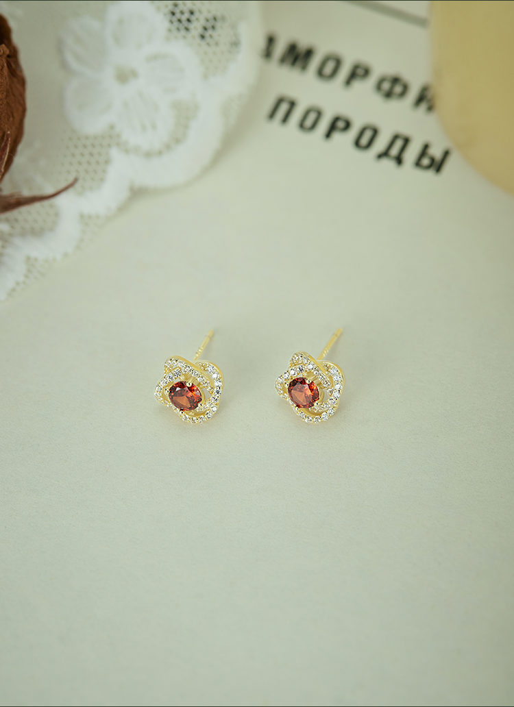 Oflye潮流饰品 S925银红色锆石镶钻耳钉女高级耳饰新款新年轻奢耳环