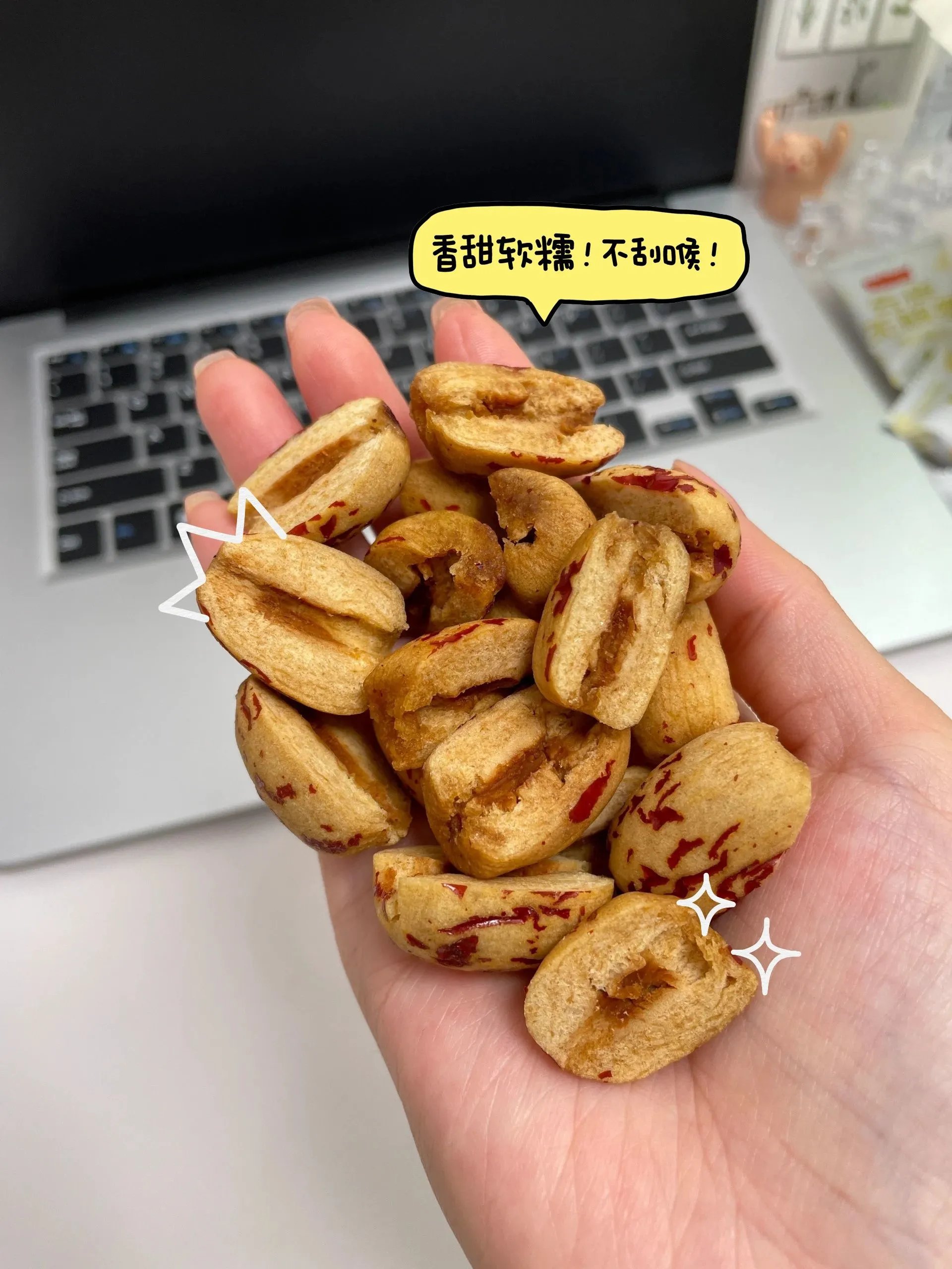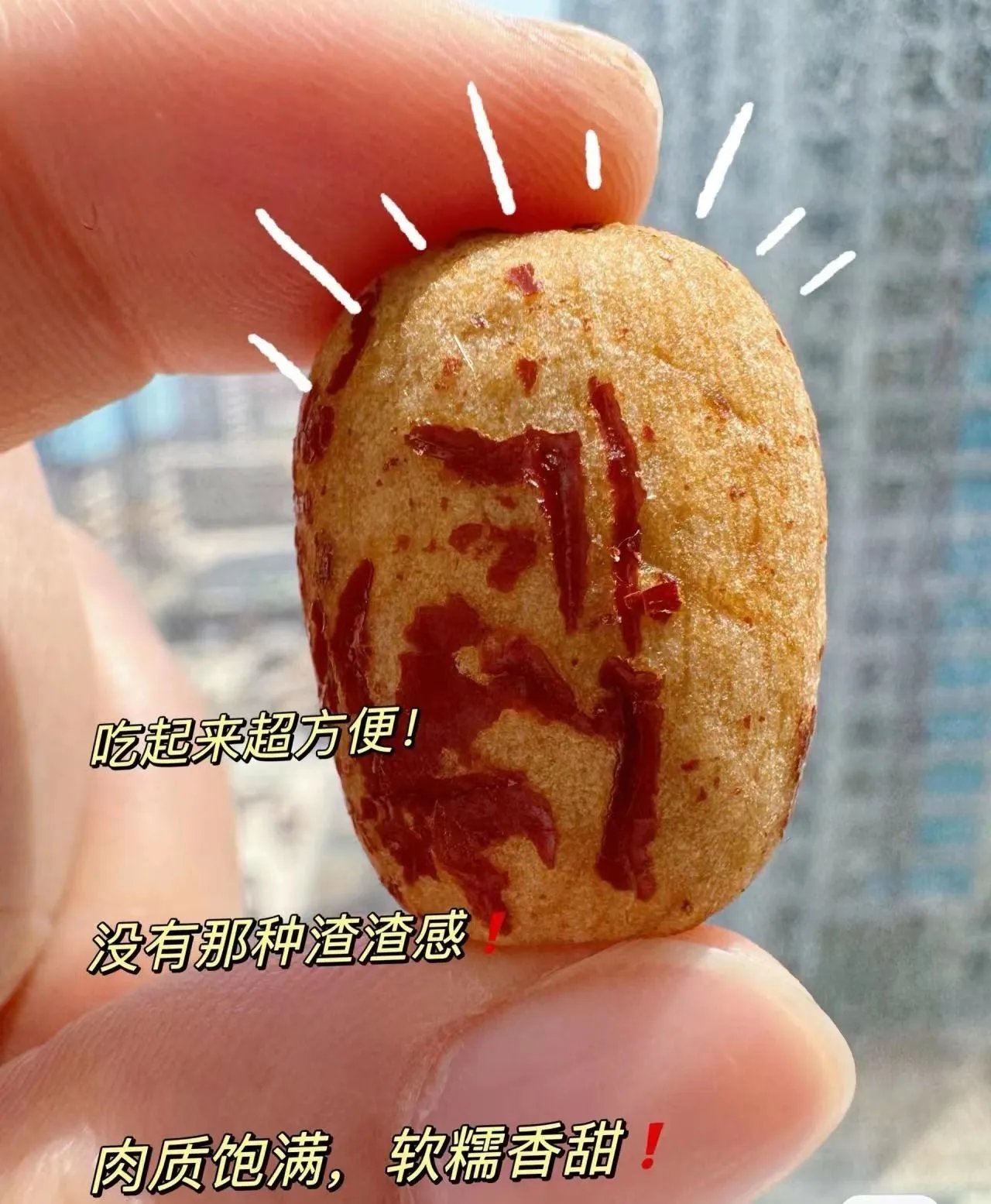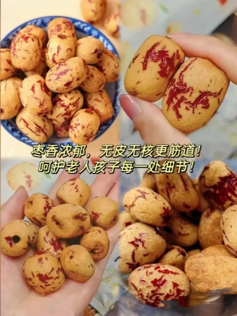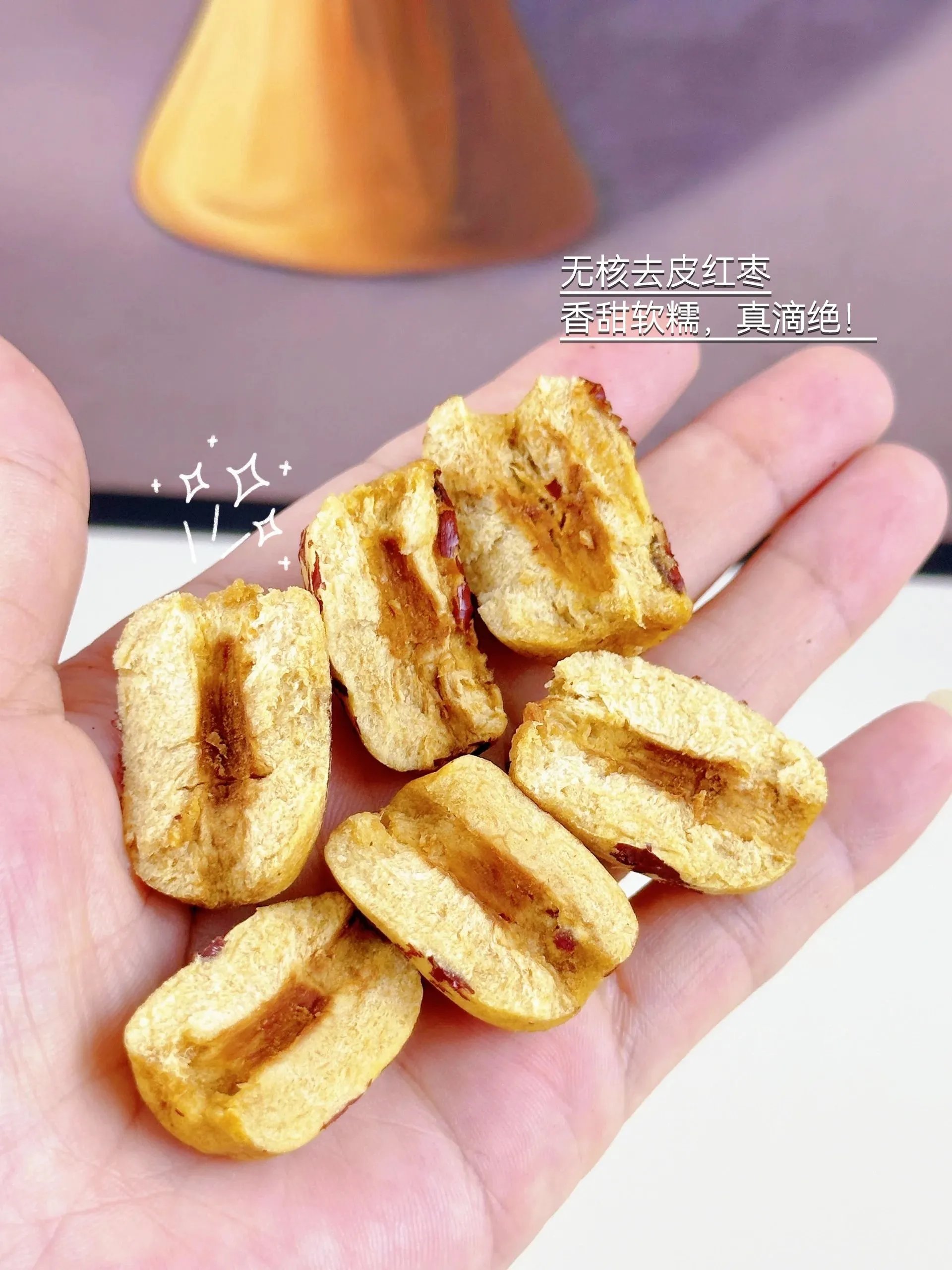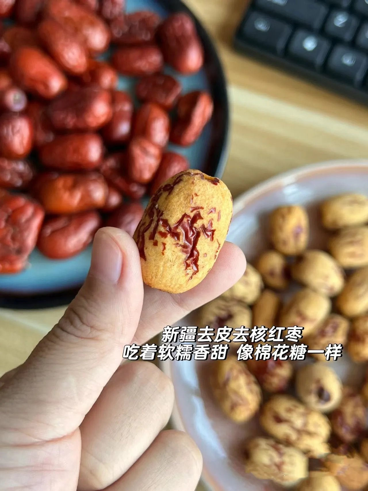 终于找到不被红枣皮卡喉咙的办法了!! 因为没有枣皮 所以吃起来非常软糯 每一颗红枣肉质都很饱满 吞咽时没有带枣皮的那种刮喉感 完完全全就是红枣的香甜感!! 软糯香甜,枣香浓郁, 一口一个就停不下来~