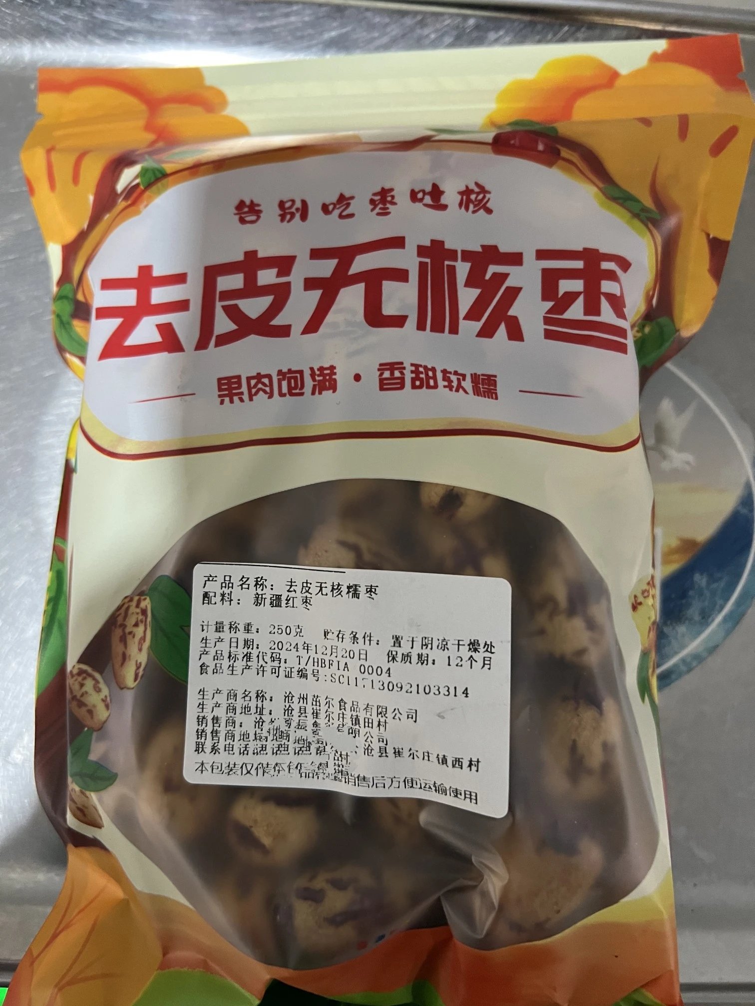 名称:去皮无核枣 原料产地 :新疆 发货地 :河北沧州 生产日期: 2025年1月5日(随批次更新) 保质期: 6个月 不发区域 :新疆西藏青海海南 北京上海➕2 快递 :圆通 售后:产品发出不支持无理由拒收拦截撤单,如出现异常情况,请带面单+产品拍照+产品包装照片与我们联系,我们会第一时间处理,如产品有质量问题可在收货24小时之内,联系客服进行售后或者补发