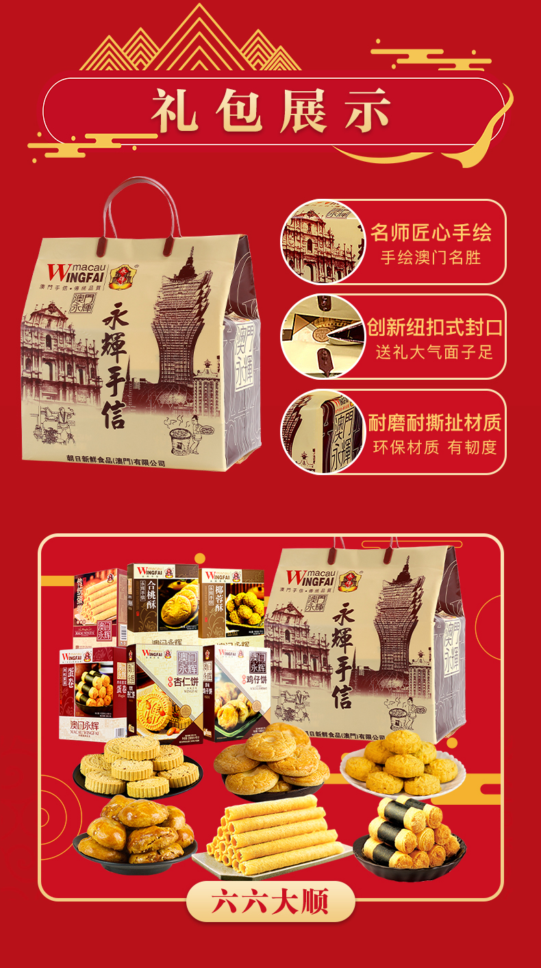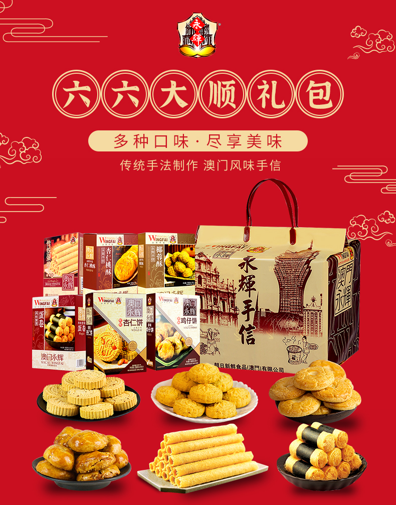 【品名】澳门永辉手信礼盒 【规格】六六大顺礼包1236g*1盒 【保质期】12个月 【储存方法】请置于阴凉干燥处,避免阳光直射 【产地】广东中山 【发货地】广州 【发货快递】圆通/中通 【不发货区域】新疆,西藏,港澳台地区不发 【发货时效】48小时,节假日顺延 |