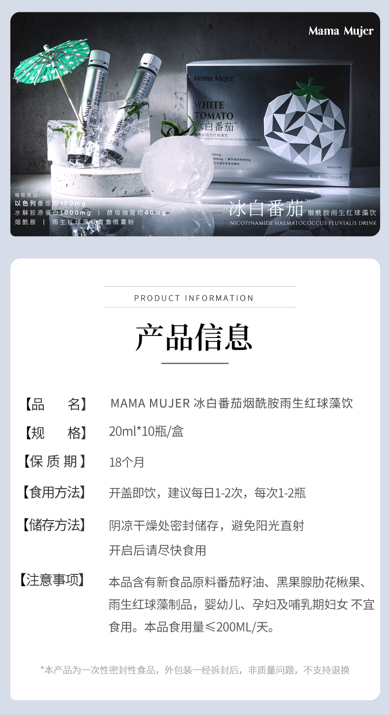 Mama Mujer冰白番茄烟酰胺饮雨生红球藻20ml*10瓶/盒 孕妇不可用 国内发货 mmmj