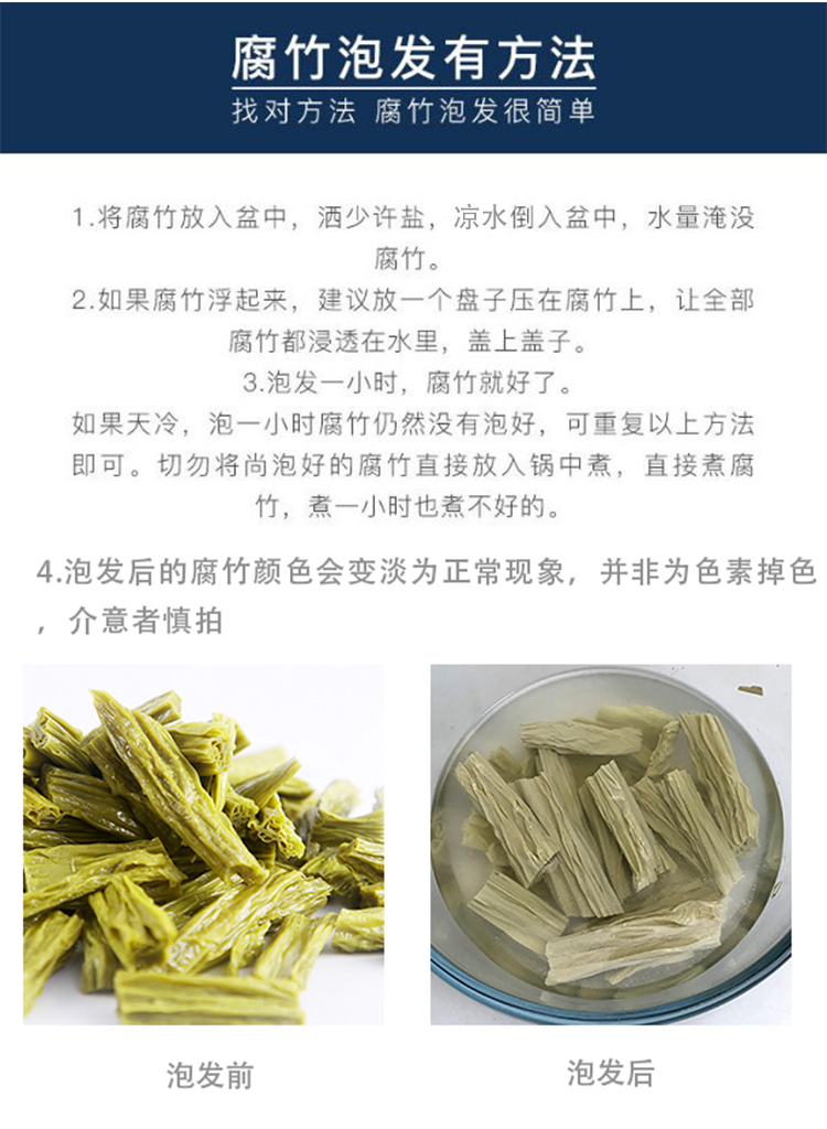 3.泡发后的腐竹颜色变浅,水变色属于正常现象,并非是有添加色素掉色,介意者慎拍