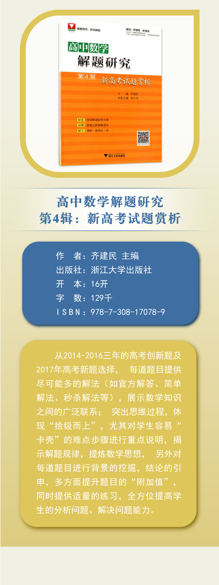 从2014-2016三年的高考创新题及2017年高考新题选择, 每道题目提供尽可能多的解法(如官方解答、简单解法、秒杀解法等),展示数学知识之间的广泛联系; 突出思维过程,体现“拾级而上”,尤其对学生容易“卡壳”的难点步骤进行重点说明,揭示解题规律,提炼数学思想, 另外对每道题目进行背景的挖掘,结论的引申,多方面提升题目的“附加值”, 同时提供适量的练习,全方位提高学生的分析问题、解决问题能力。