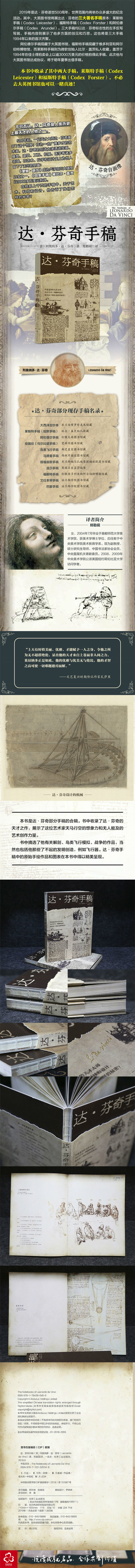 本书为达·芬奇部分手稿的合辑。书中记录了达·芬奇的天才之作,展示了展位艺术家天马行空的想象力和无人能及的艺术创作力量。书中摘选了他有关解剖、鸟类飞行模拟、战争的作品,当然也包括他那些了不起的发明创造,例如飞行器。达·芬奇手稿本中的原始手绘作品和图表都在本书中做了一一呈现。
