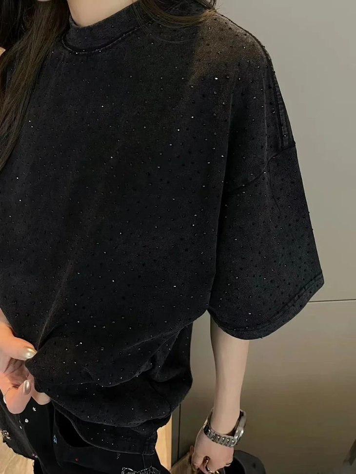 选用32S/1*2精棉双纱平纹300G双纱精梳纯棉高端无尘面料,32针高端纺织螺纹70D超细弹力缝线,接近无感的走线,贴身舒适,将白色胚布进行染洗加砂洗做旧,呈现出原版黑色偏灰色的蓝光效果,特订7000多颗施华洛世奇水钻烫钻,光线下具有天然水晶的bling bling亮闪效果,多切面反光点,制作成本极高,激光制模含电脑雕刻机和激光机 以颗粒为单位分毫不差,最后高温烫定型,烫好后还需反复在烫图上测试牢固度,在灯光照射下可呈现五彩斑斓般反光,领织带包边延伸到肩部加固,衔接处打倒针,下摆与袖口,均采用0.2mm针距双线冚车,高成本精心制作,整件衣服重量达到了1公斤多,放大镜做货的态度还原产品的品质和效果,全套定制辅料,独家客订新版水洗,这种重工的单品,很少有人敢开发!个性的朋友一定要入!