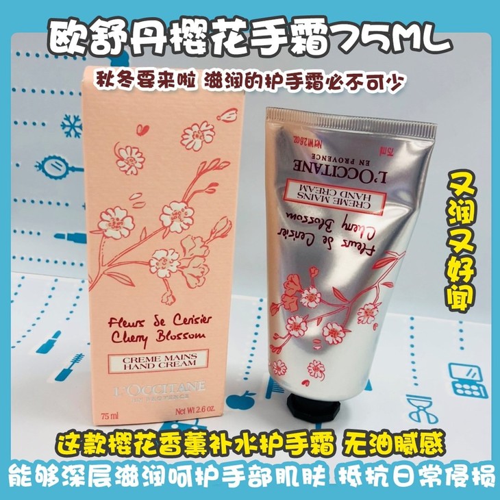欧舒丹樱花手霜75ML👍秋冬要来啦🌬,滋润的护手霜必不可少💦!欧舒丹家的护手霜系列真的没有吹牛🔥,又润又好闻💕!这款樱花🌸香薰补水护手霜,无油腻感❌,快速渗入肌肤质地。蕴含乳木果和樱花萃取物,能够深层滋润呵护手部肌肤😊,抵抗日常侵损☀,使用后手部肌肤更加柔滑舒适☁。还带有淡淡的香气,舒缓身心~这种香味,仙女必备❣