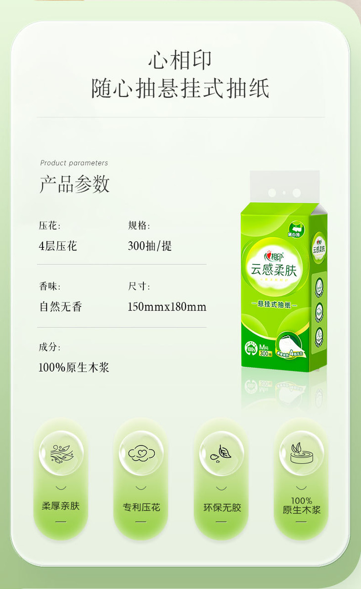 【心相印】云感柔肤系列悬挂式抽纸 300抽*6提装 底部抽四层加厚面巾纸整箱抽纸