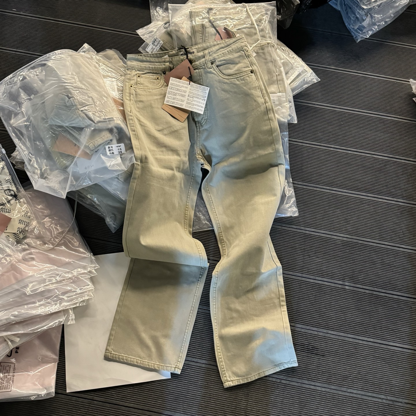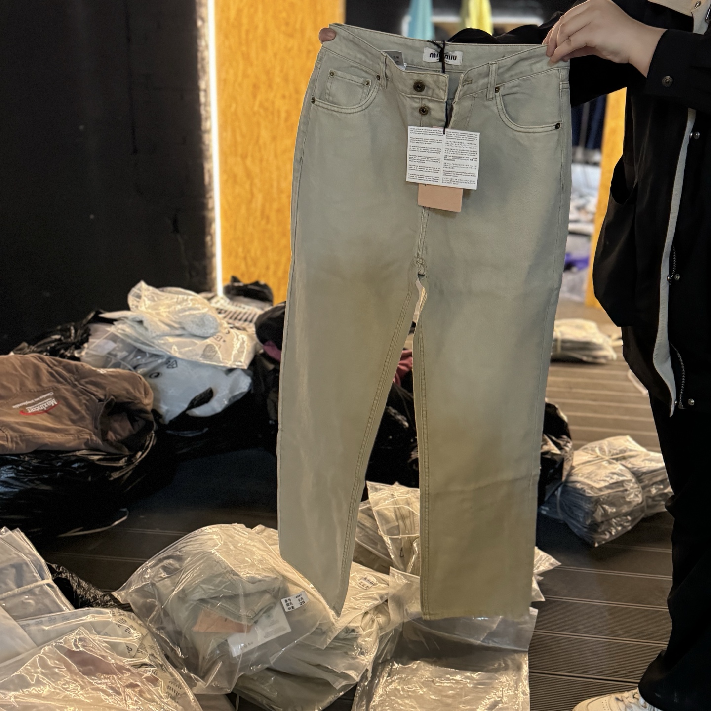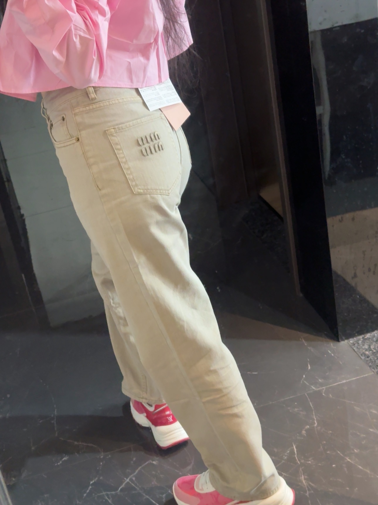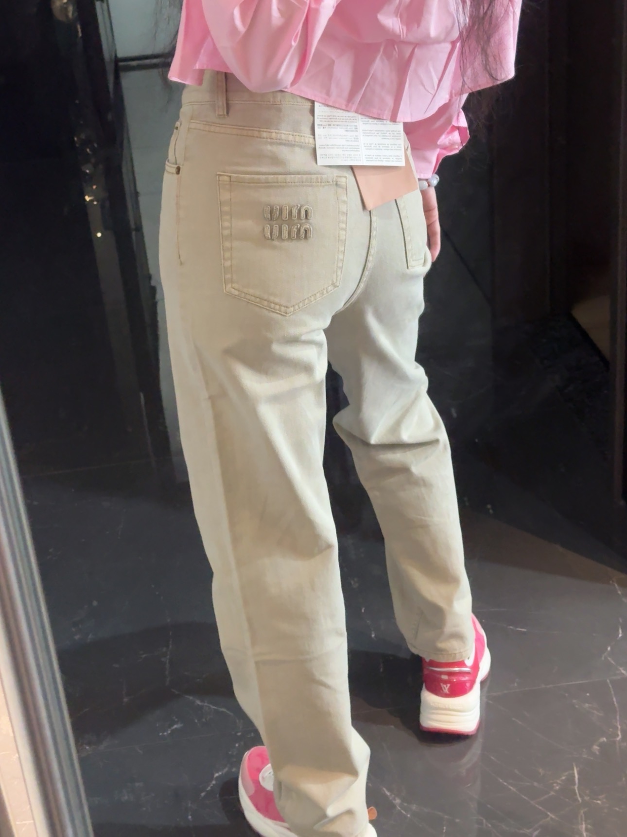 根本不用去专柜了!根本不用!看后屁股细节,一侧口袋miu&miu字母,辨识度极高,高级感拉满!!洗处理丹宁斜纹棉质用料,呈现出刻意打磨的做旧效果,后口袋饰以字母徽标点缀,四季可穿!!自留强推!!正码正拍!S90-110斤!M100-125斤!L110-135斤.以内.S: 腰围68,臀围96,裤长98 M:腰围72,臀围100,裤长99 L:腰围76,臀围104,裤长100.