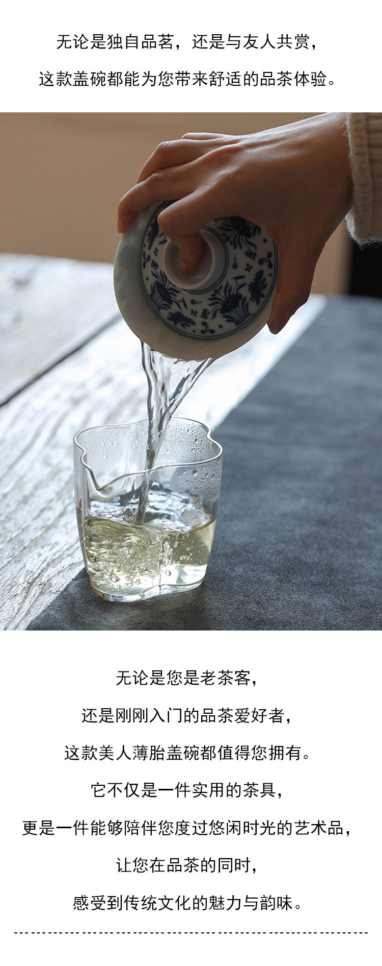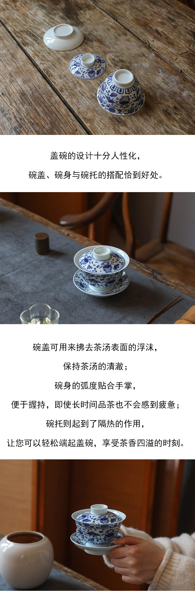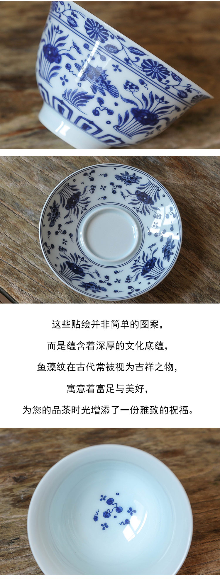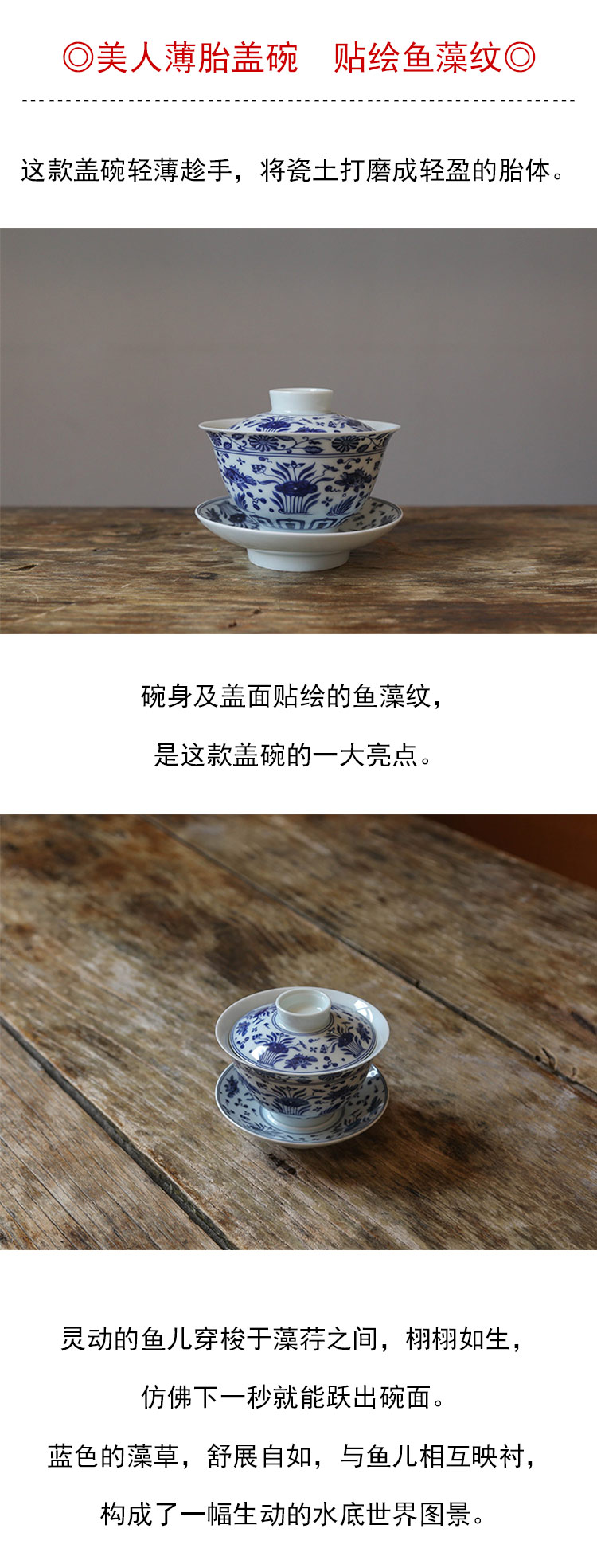 茶香记 美人薄胎盖碗贴绘鱼藻纹120ml景德镇陶瓷青花三才盖碗茶具