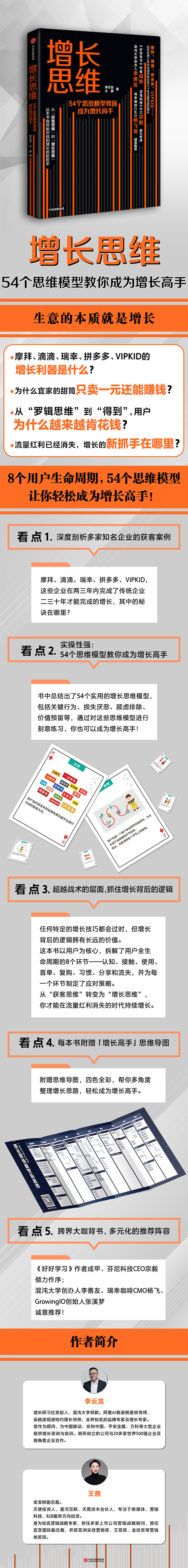 这本书以增长八卦模型为基础,从用户的全生命周期入手,剖析了认知、接触、使用、首单、复购、习惯、分享和流失8个重要环节,列举了大量知名企业的获客案例,深入阐述了实现增长的方法和途径,详细解读了增长思维的内涵。作者认为,任何特定的增长技巧都会过时,但增长背后的逻辑拥有长远的价值。他还在书中总结出了54个增长思维模型,包括AARRR模型、关键行为、损失厌恶、顾虑排除等,通过对这些思维模型进行刻意练习,你也可以成为增长高手!
