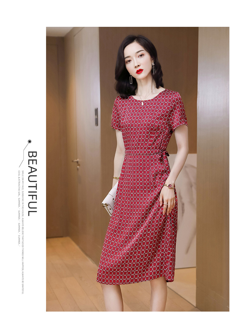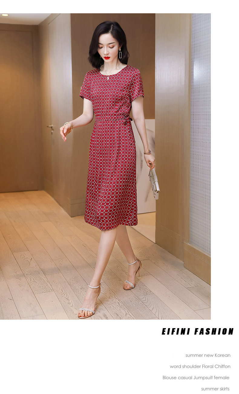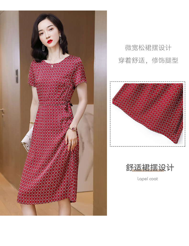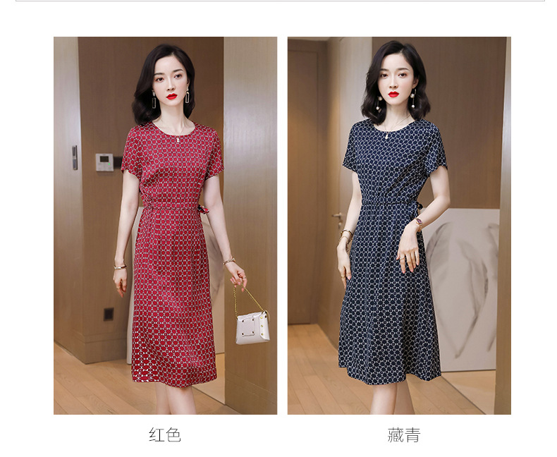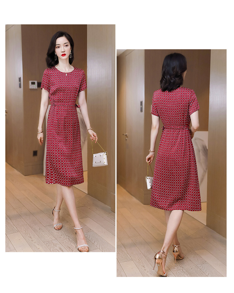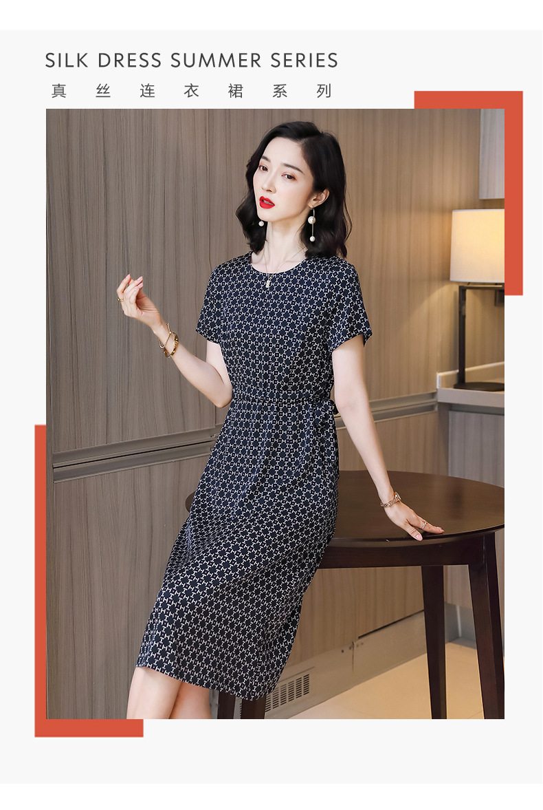 上海旗袍厂ASE-9116真丝连衣裙夏款新款格纹短袖长款收腰显瘦气质桑蚕丝