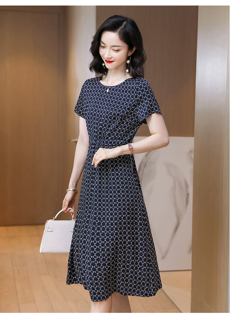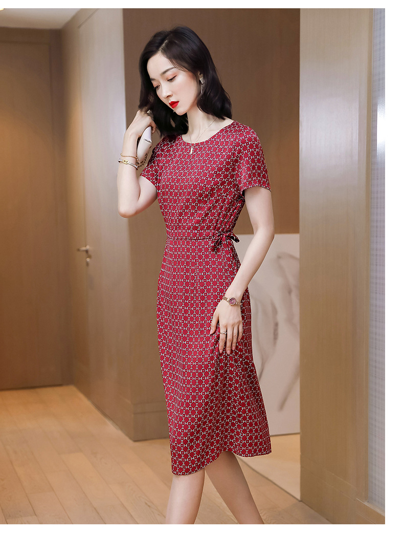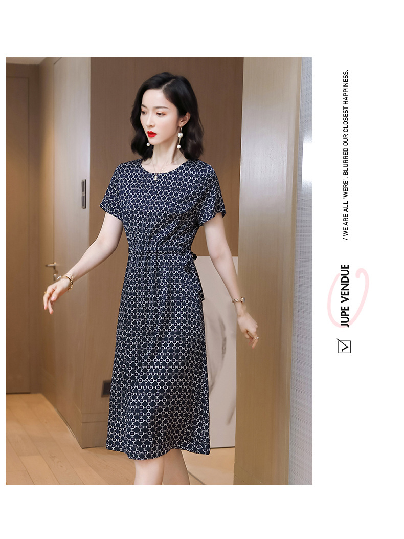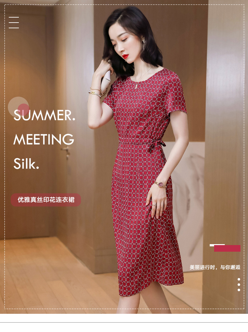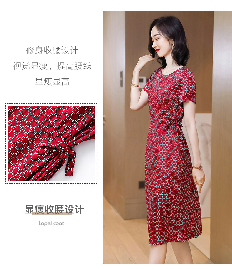 上海旗袍厂ASE-9116真丝连衣裙夏款新款格纹短袖长款收腰显瘦气质桑蚕丝