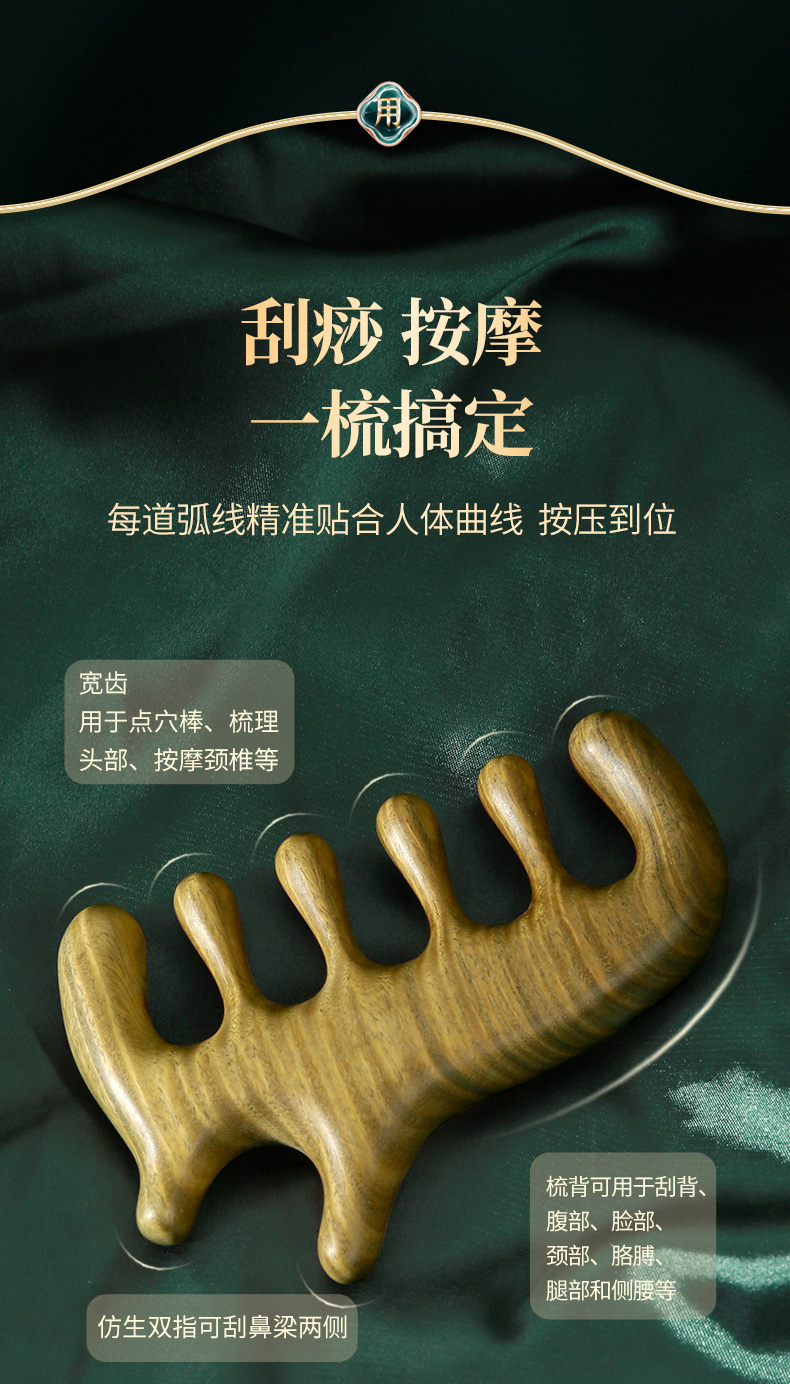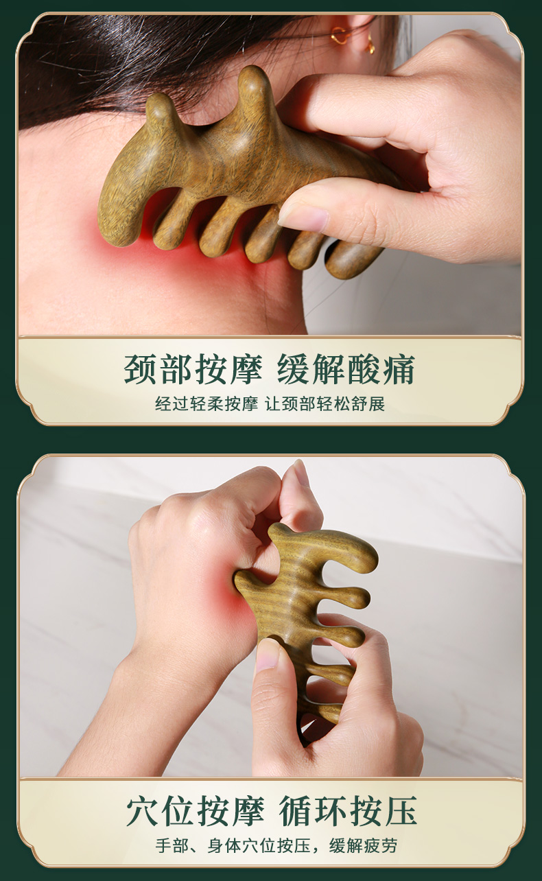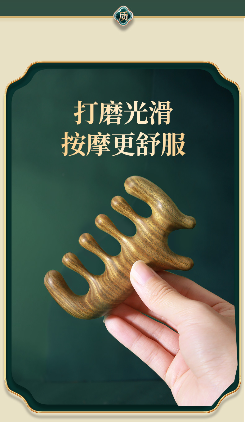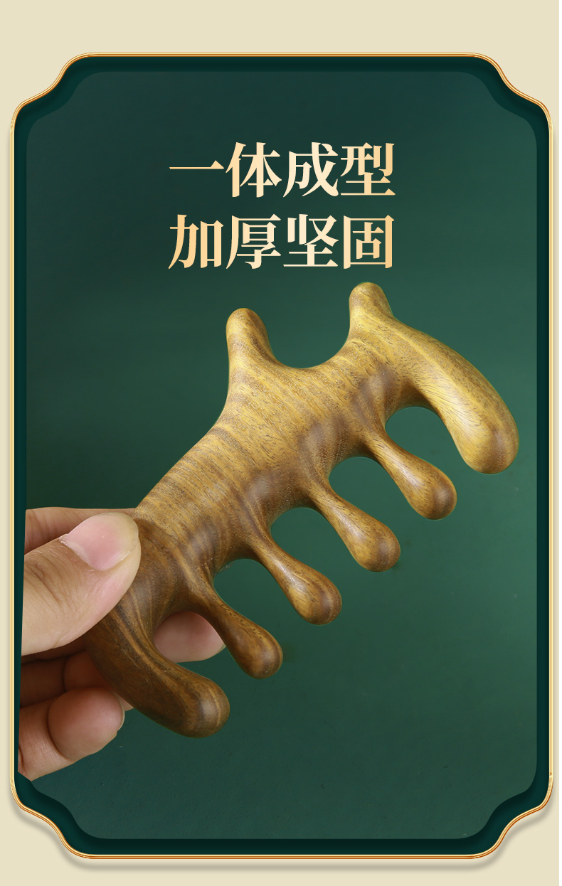 2【可按摩】一共有6个齿,每个齿都打磨很光滑圆润,3种使用方式:第一,点揉身体上比较酸酸的点,用这两头最大的位置,这个按摩梳点揉下去,力度非常缓和舒适,不伤皮肤;第二就是刮,用这6个齿梳合并起来刮,比如说哪个地方有酸疼,都可以用6个齿来回刮一刮;最后就是齿背面,这个圆圆胖胖的位置,可以当做一个按摩工具,上下轻轻滑动,如果皮肤太干燥,可以搭配精油或者乳霜一起刮。宽齿用于点穴按摩、梳理头部、按摩肩颈等等,梳背可用于刮背、腹部、脸部、颈部、胳膊和侧腰等,提拉咱们的脸部,刮一刮咱们的肩颈部位都是可以的哦。仿生双指可刮鼻梁两侧,点揉鼻梁部位和眼周,可以缓解酸痛,疏通疲劳。