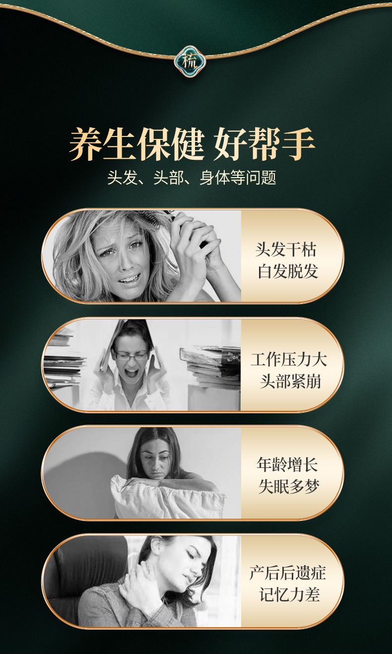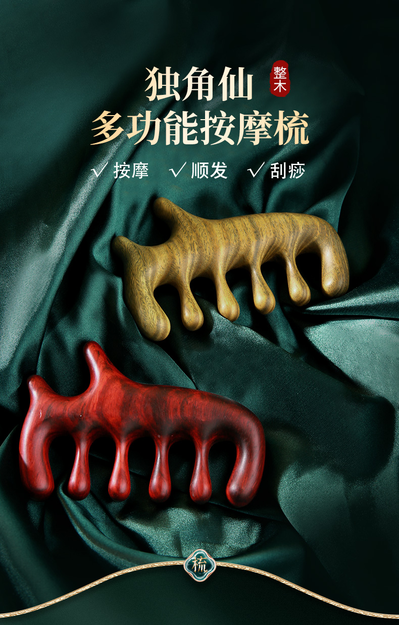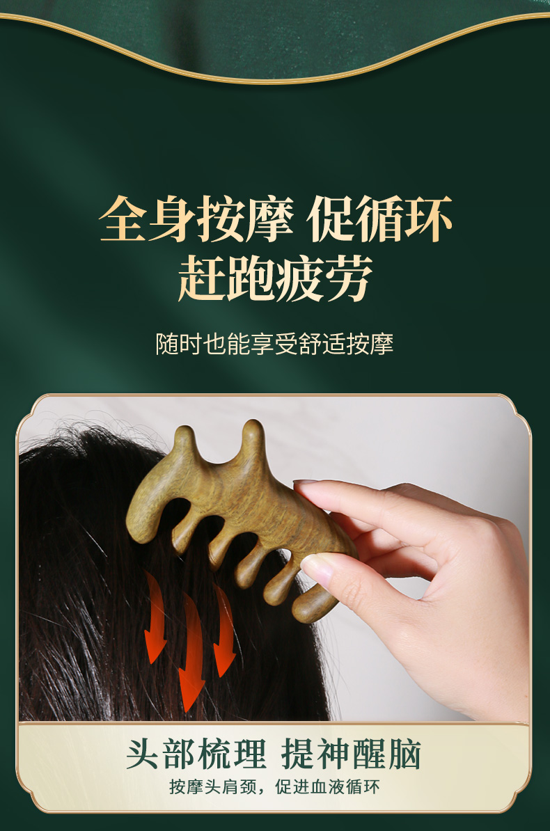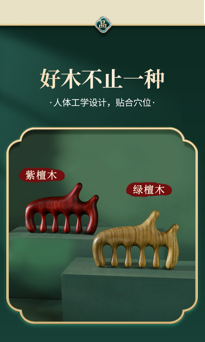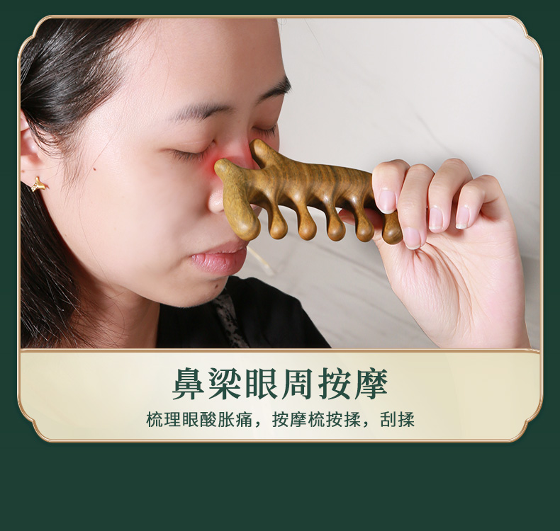 2【可按摩】一共有6个齿,每个齿都打磨很光滑圆润,3种使用方式:第一,点揉身体上比较酸酸的点,用这两头最大的位置,这个按摩梳点揉下去,力度非常缓和舒适,不伤皮肤;第二就是刮,用这6个齿梳合并起来刮,比如说哪个地方有酸疼,都可以用6个齿来回刮一刮;最后就是齿背面,这个圆圆胖胖的位置,可以当做一个按摩工具,上下轻轻滑动,如果皮肤太干燥,可以搭配精油或者乳霜一起刮。宽齿用于点穴按摩、梳理头部、按摩肩颈等等,梳背可用于刮背、腹部、脸部、颈部、胳膊和侧腰等,提拉咱们的脸部,刮一刮咱们的肩颈部位都是可以的哦。仿生双指可刮鼻梁两侧,点揉鼻梁部位和眼周,可以缓解酸痛,疏通疲劳。