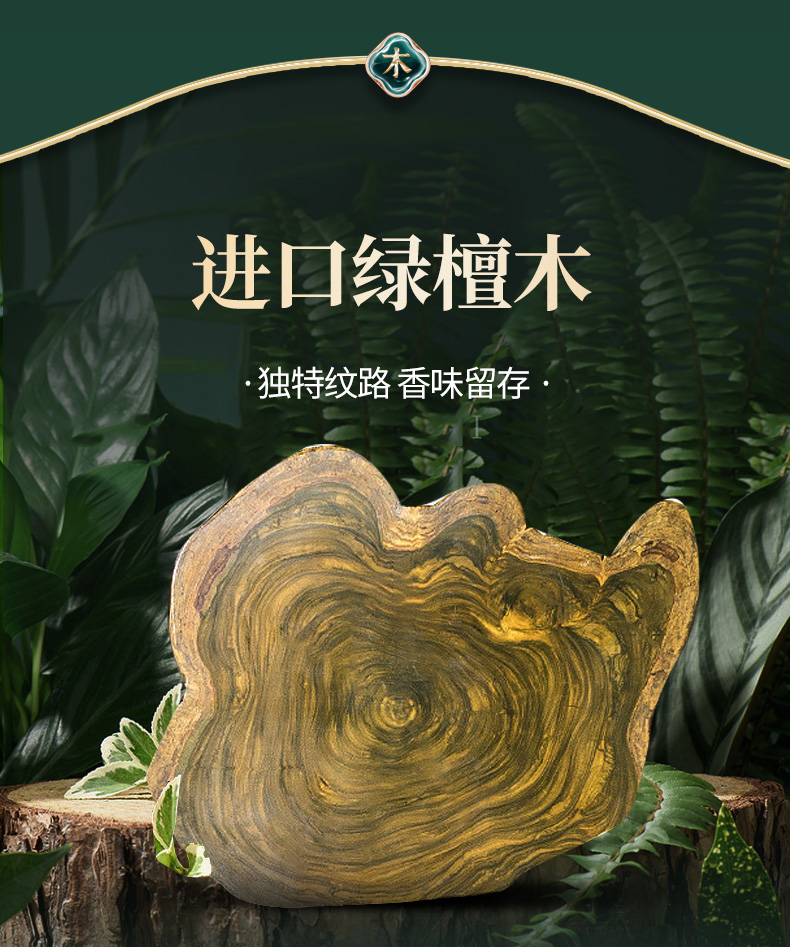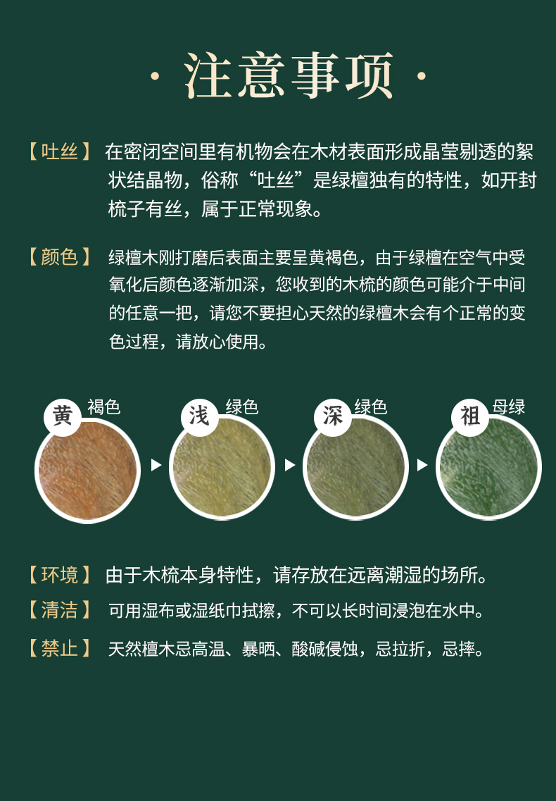 3【材质】都是进口的整木制作,人工手工打磨制成。绿檀木木材选用南美洲阿根廷,坚硬且重,非常耐磨损,而且自带香气。刚打磨的表面是黄褐色,会显得比较干,用久了相对光滑并且在使用过程中,颜色逐渐加深,从黄褐色、浅绿色、深绿色、祖母绿的变色;紫檀木木材选自非洲,坚硬细密,心材红色,表面比较光滑靓丽。