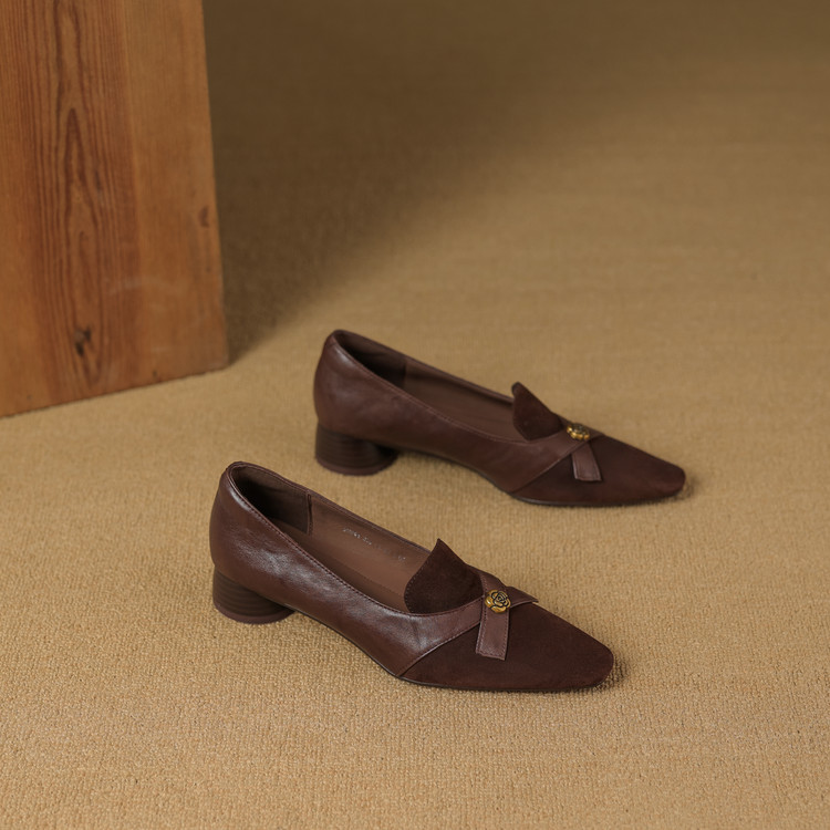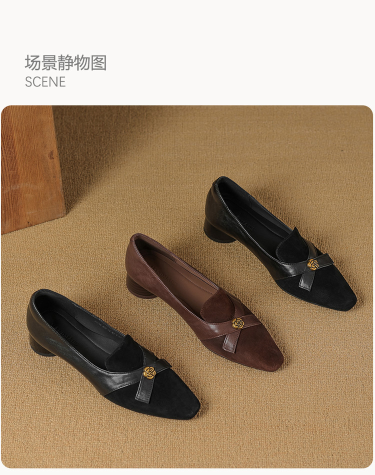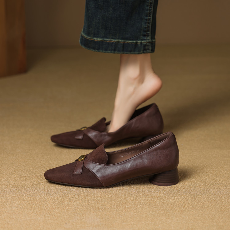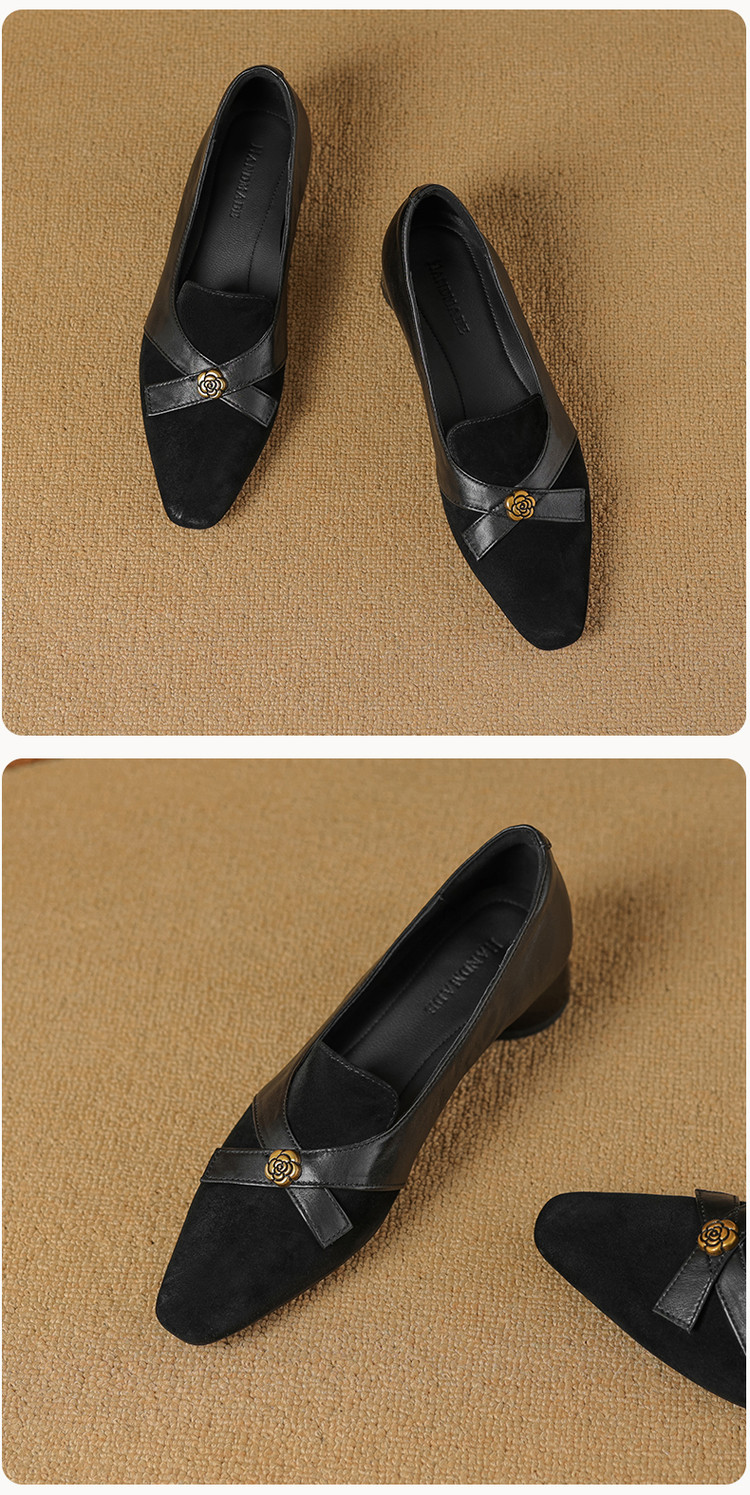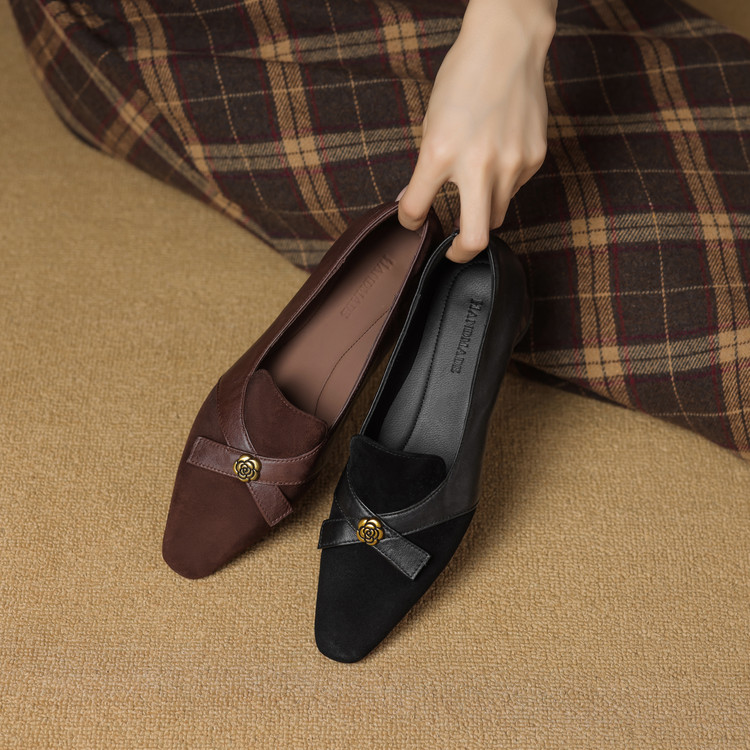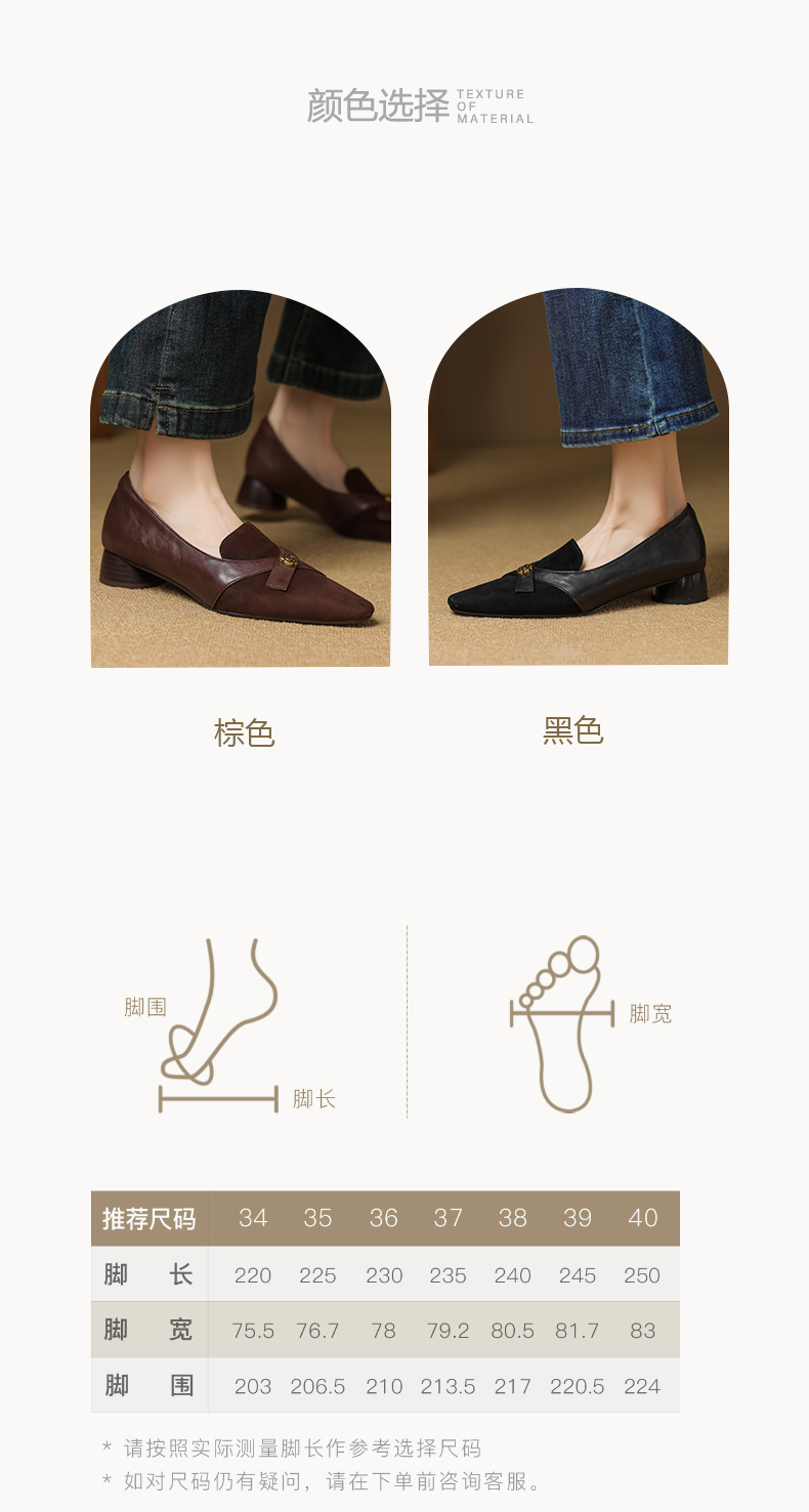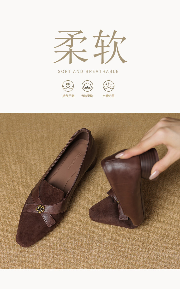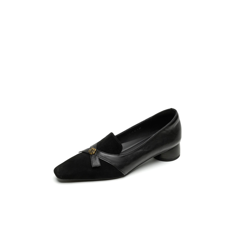 【预售5天】法式深口单鞋女春秋蝴蝶结方头低跟粗跟真皮翻毛皮乐福鞋女SSS&S9844