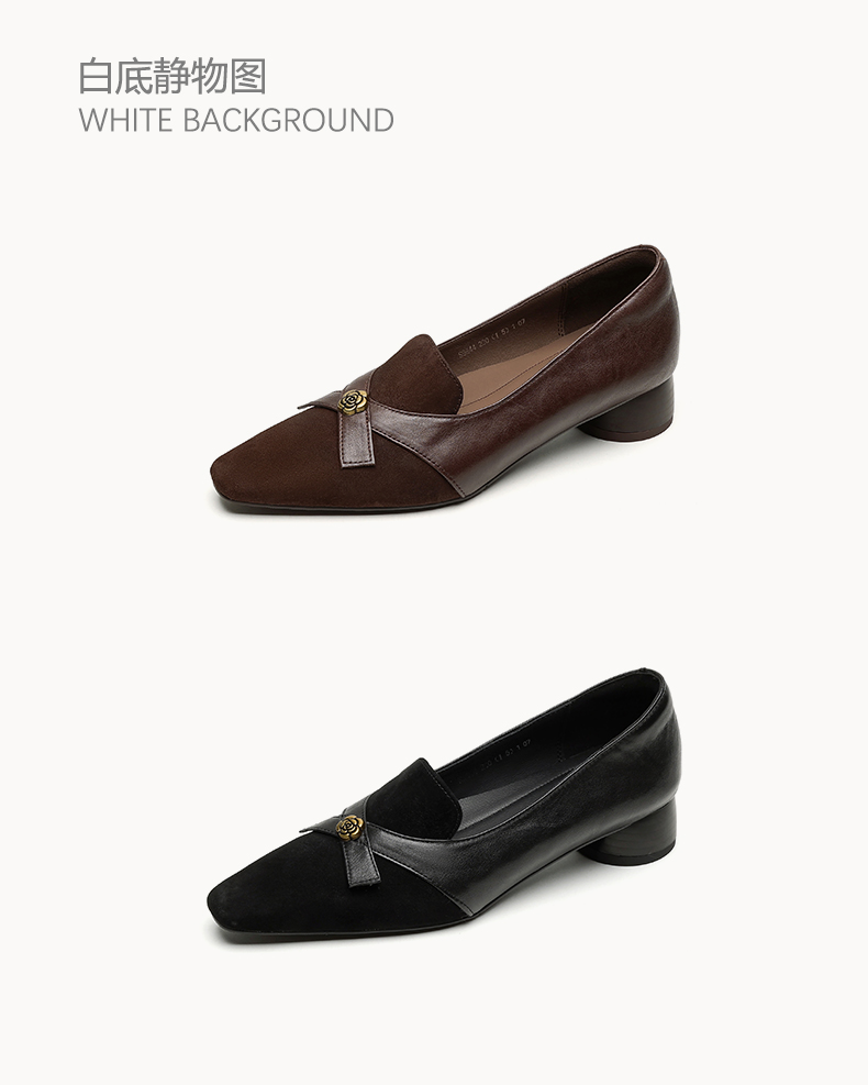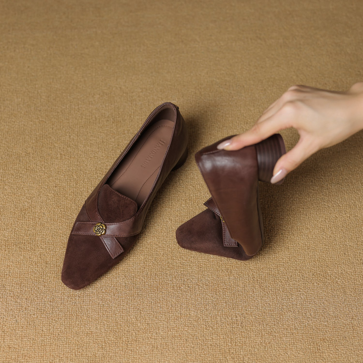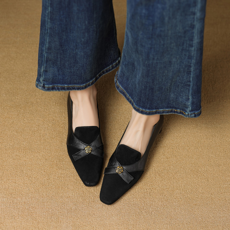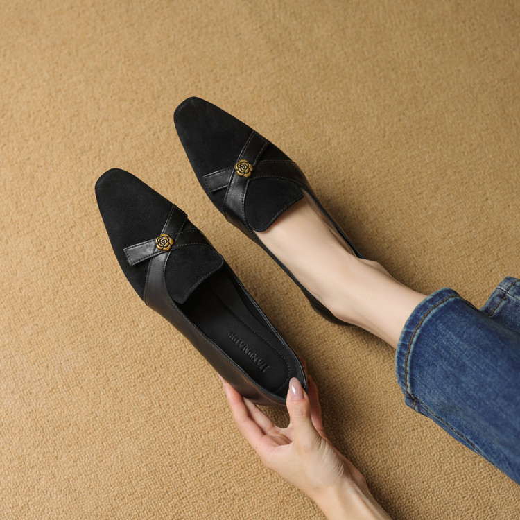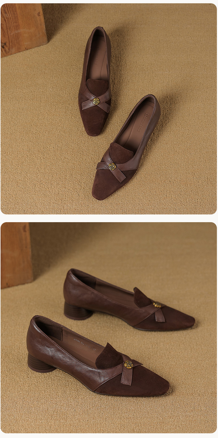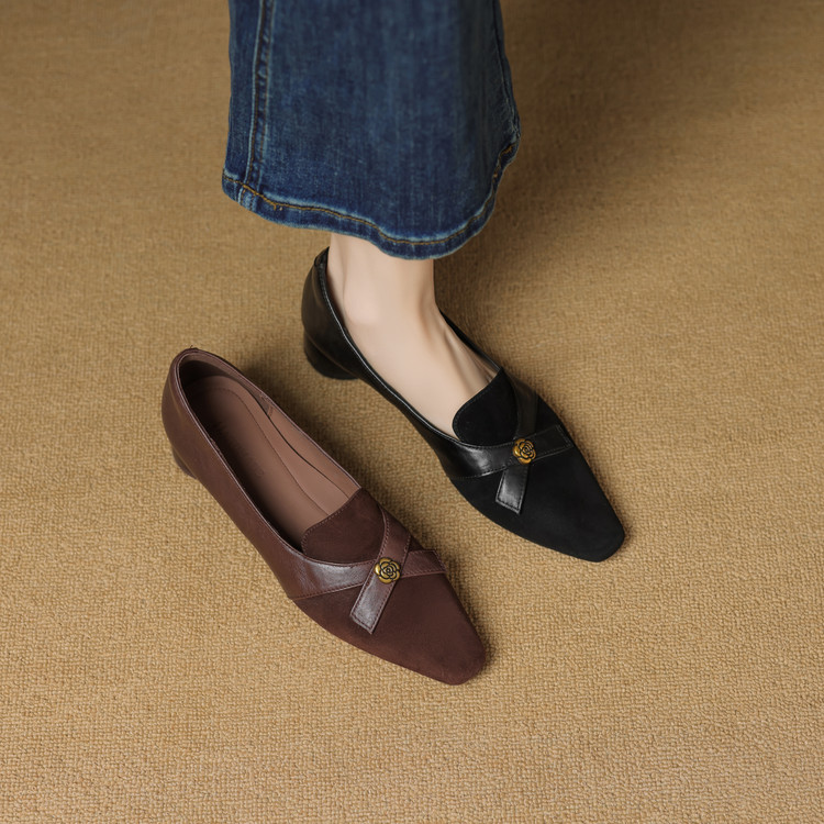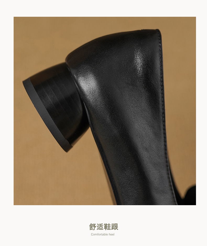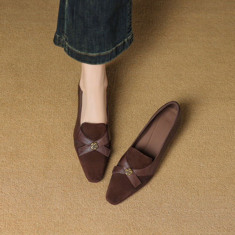 【预售5天】法式深口单鞋女春秋蝴蝶结方头低跟粗跟真皮翻毛皮乐福鞋女SSS&S9844