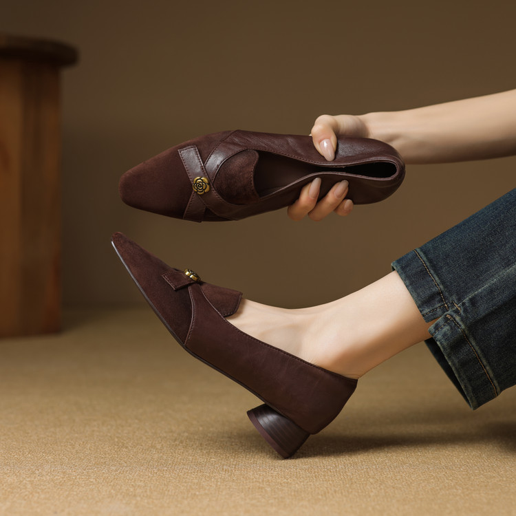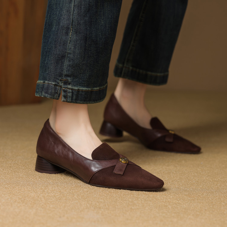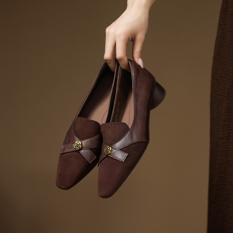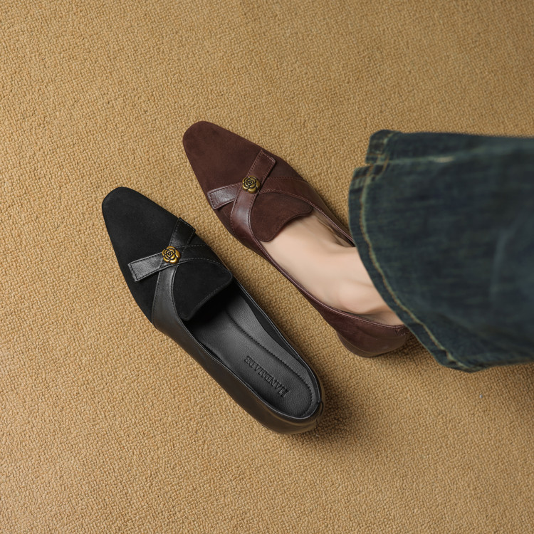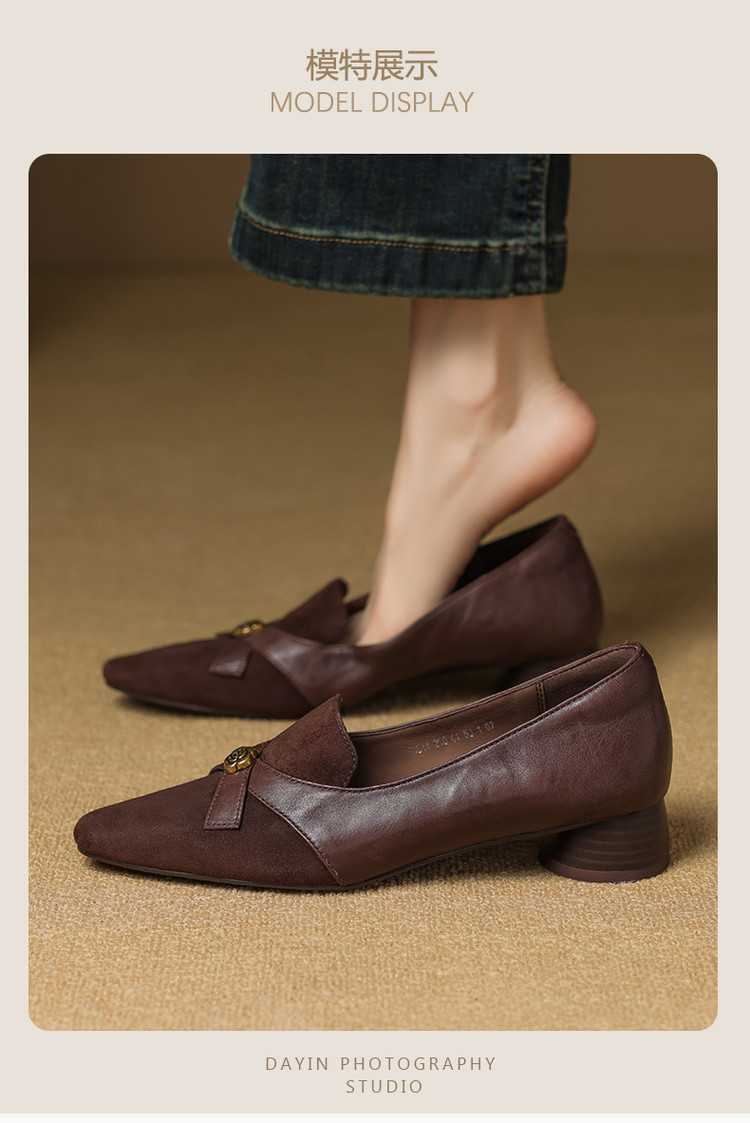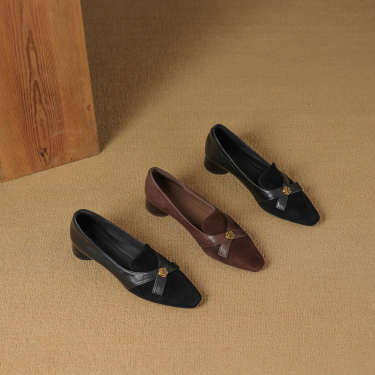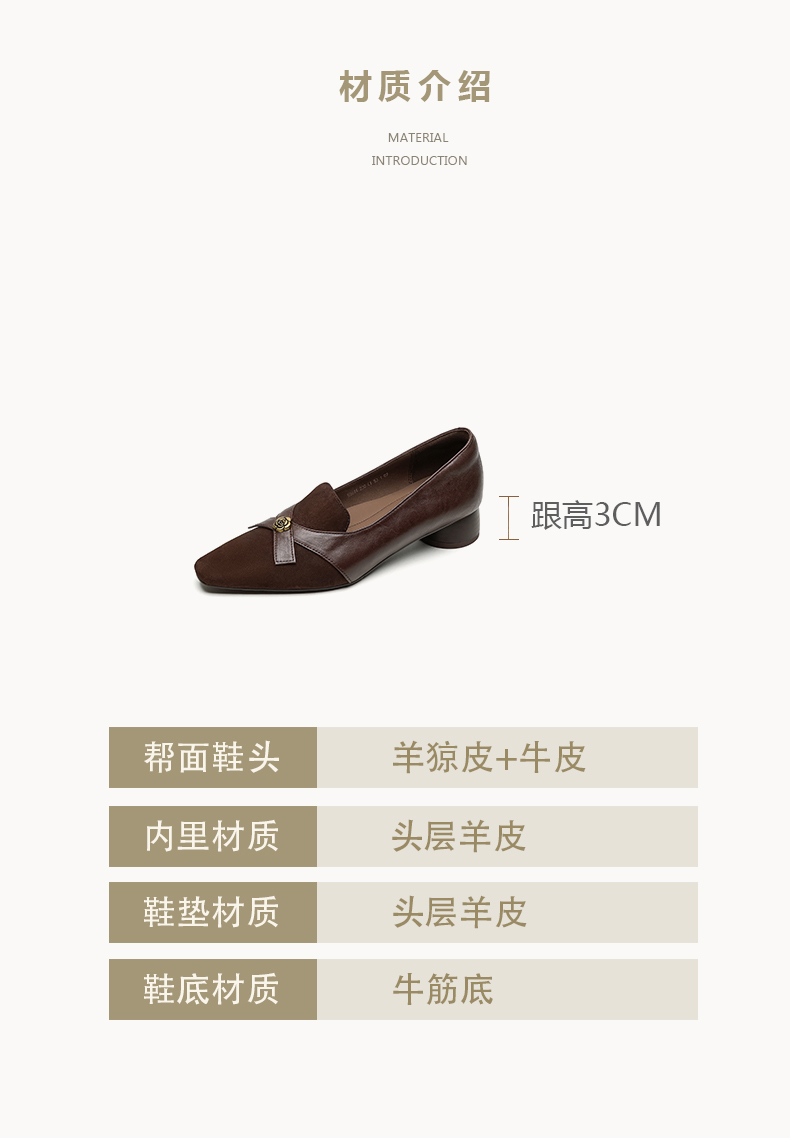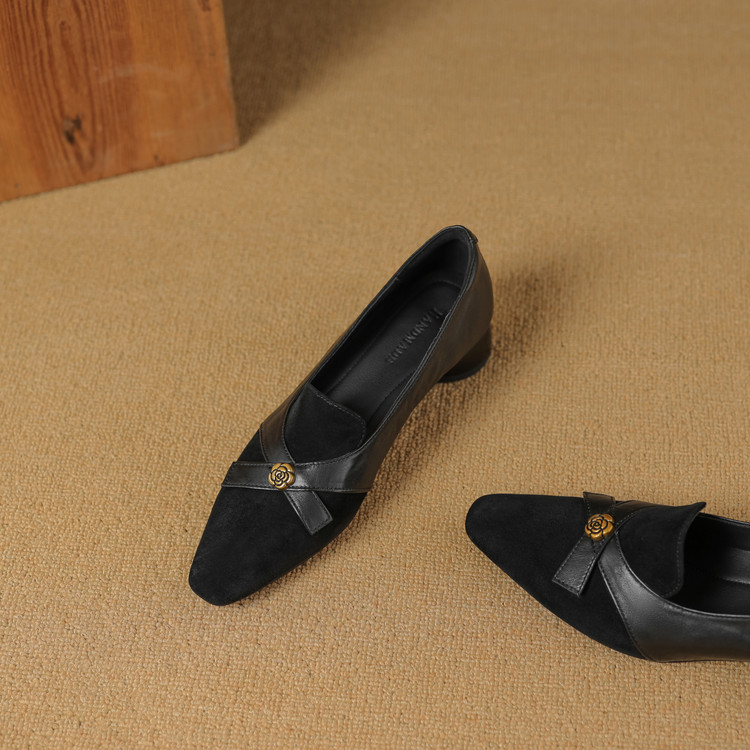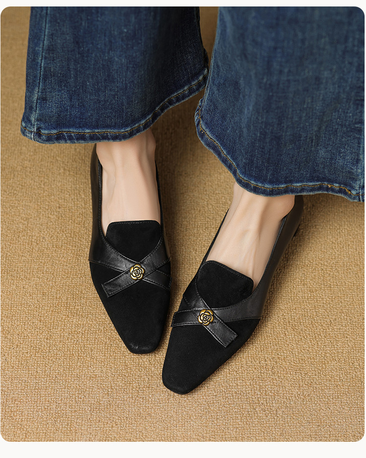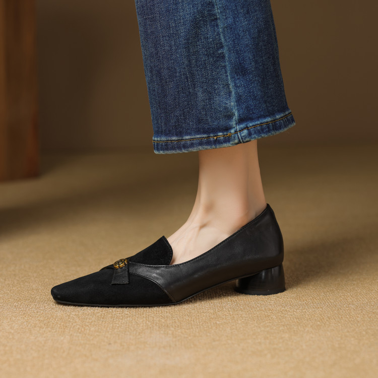 【预售5天】法式深口单鞋女春秋蝴蝶结方头低跟粗跟真皮翻毛皮乐福鞋女SSS&S9844