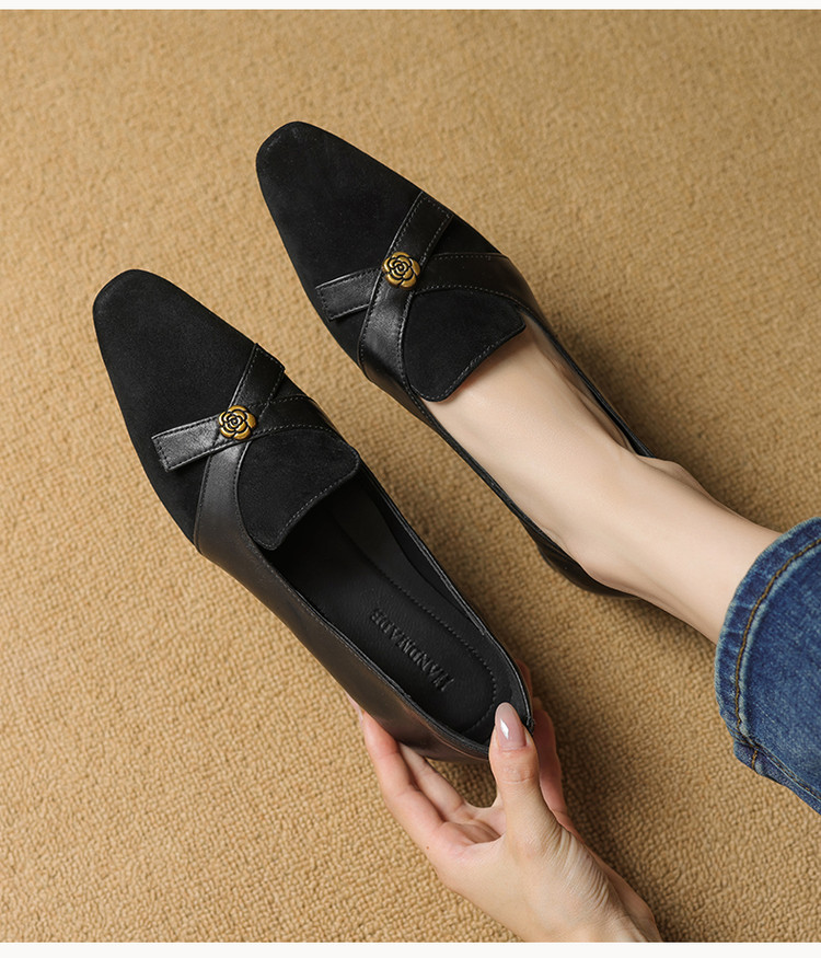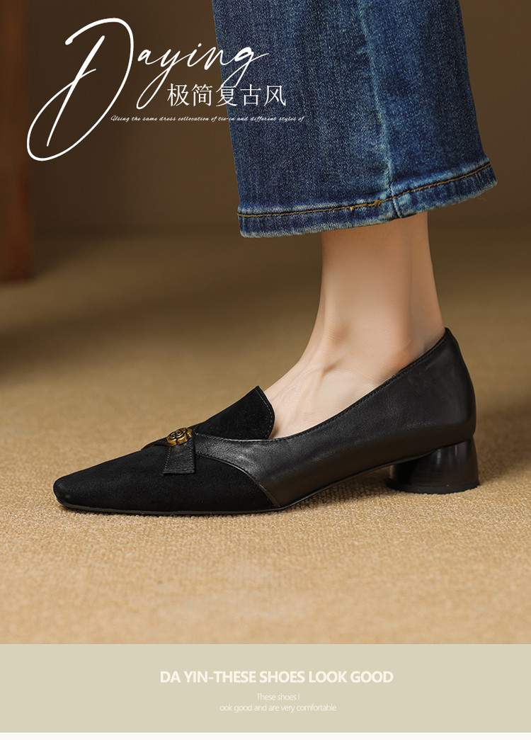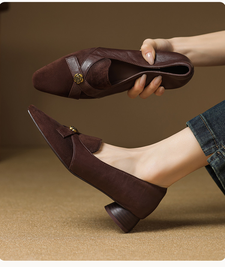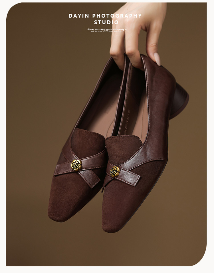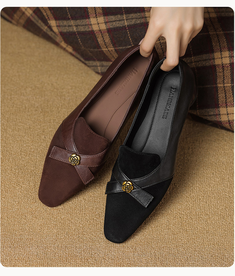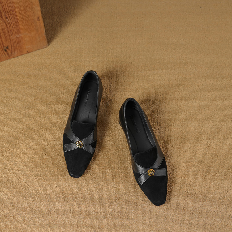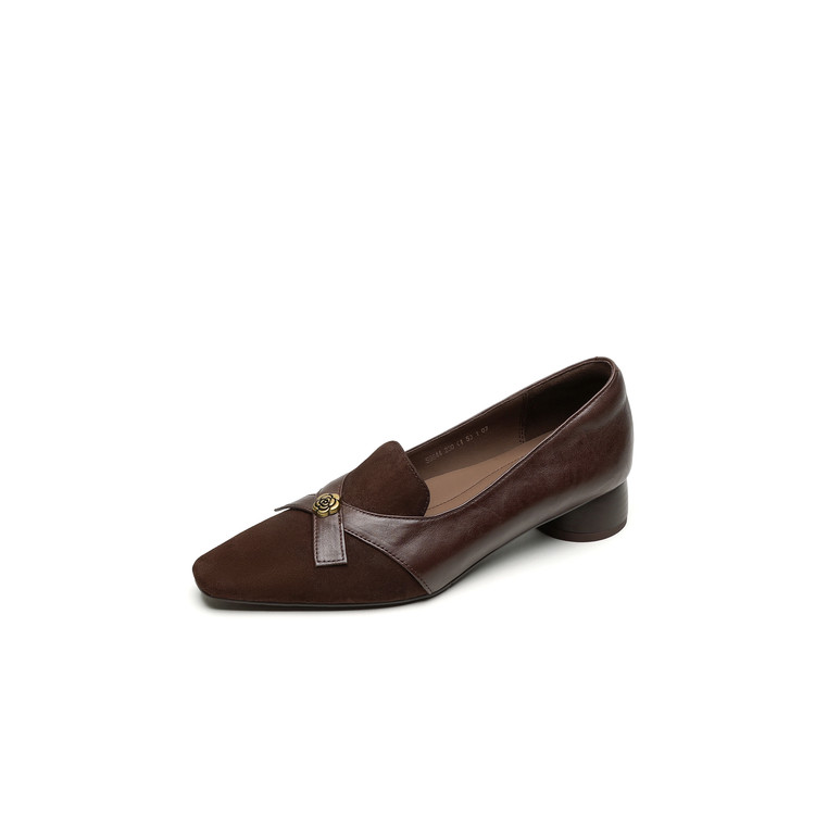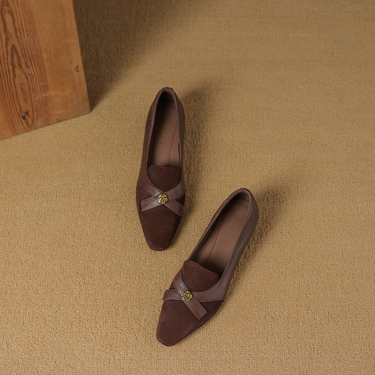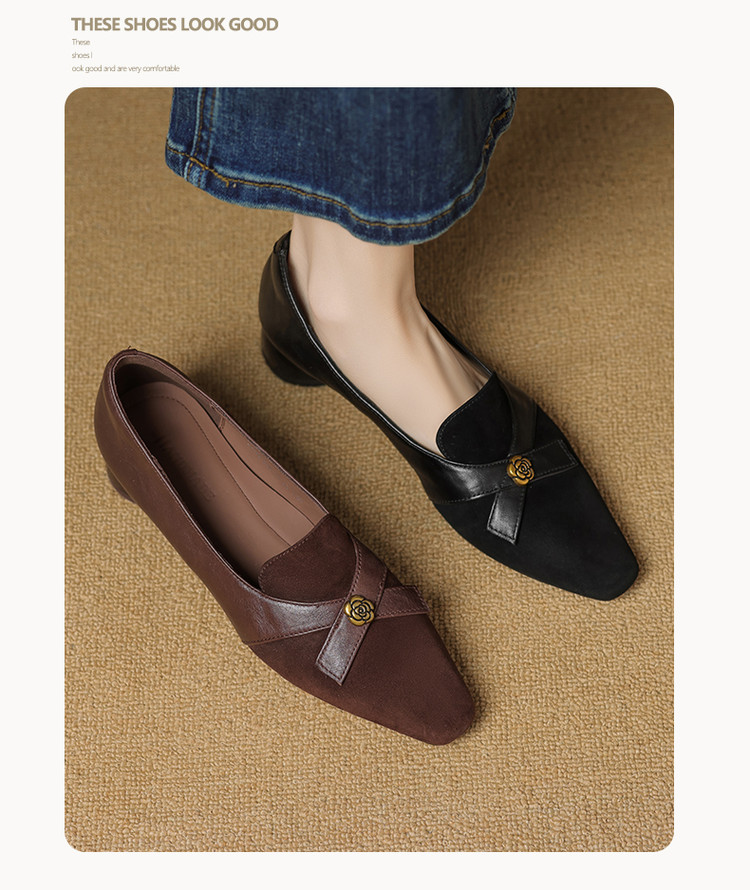 【预售5天】法式深口单鞋女春秋蝴蝶结方头低跟粗跟真皮翻毛皮乐福鞋女SSS&S9844