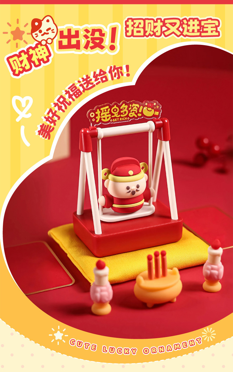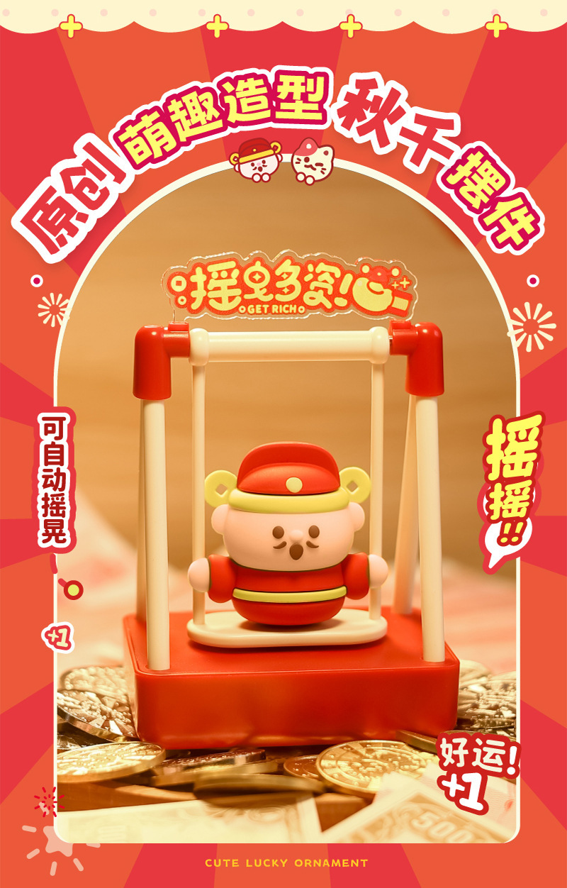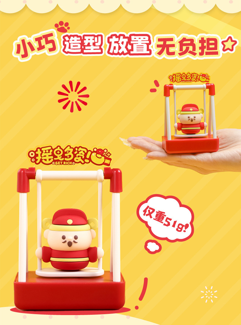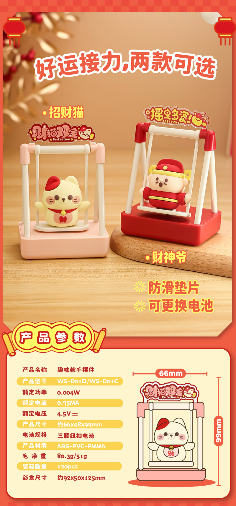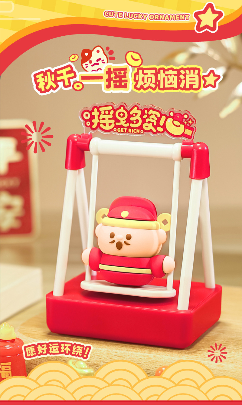 【趣味秋千摆件,秋千一摇烦恼消~】新款招财猫财神爷荡秋千摆件 办公室桌面车装饰 解压儿童礼品玩具-QQ