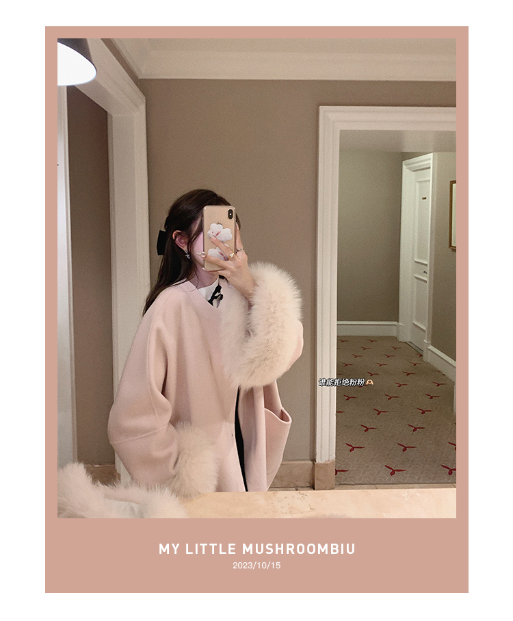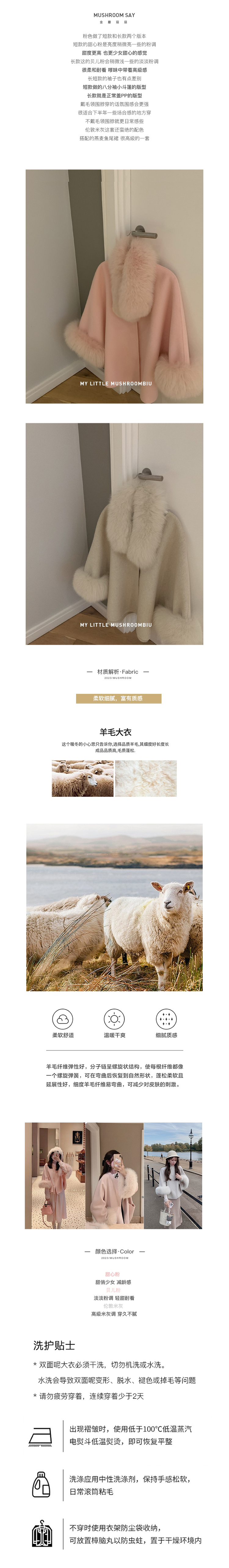 | 短款:100%羊毛 袖子:狐狸毛 毛毛围脖:狐狸毛 贝儿粉 中长款/伦敦米灰:10%羊绒90%美丽奴羊毛 内搭:100%羊毛 |