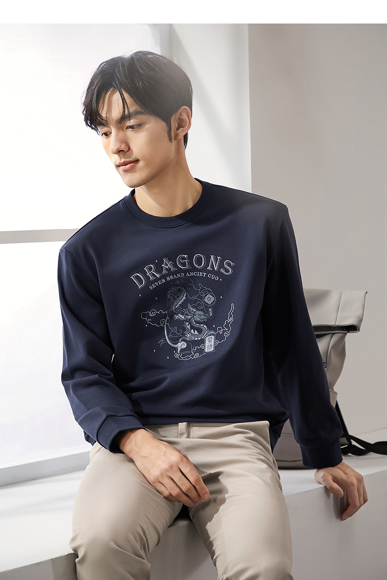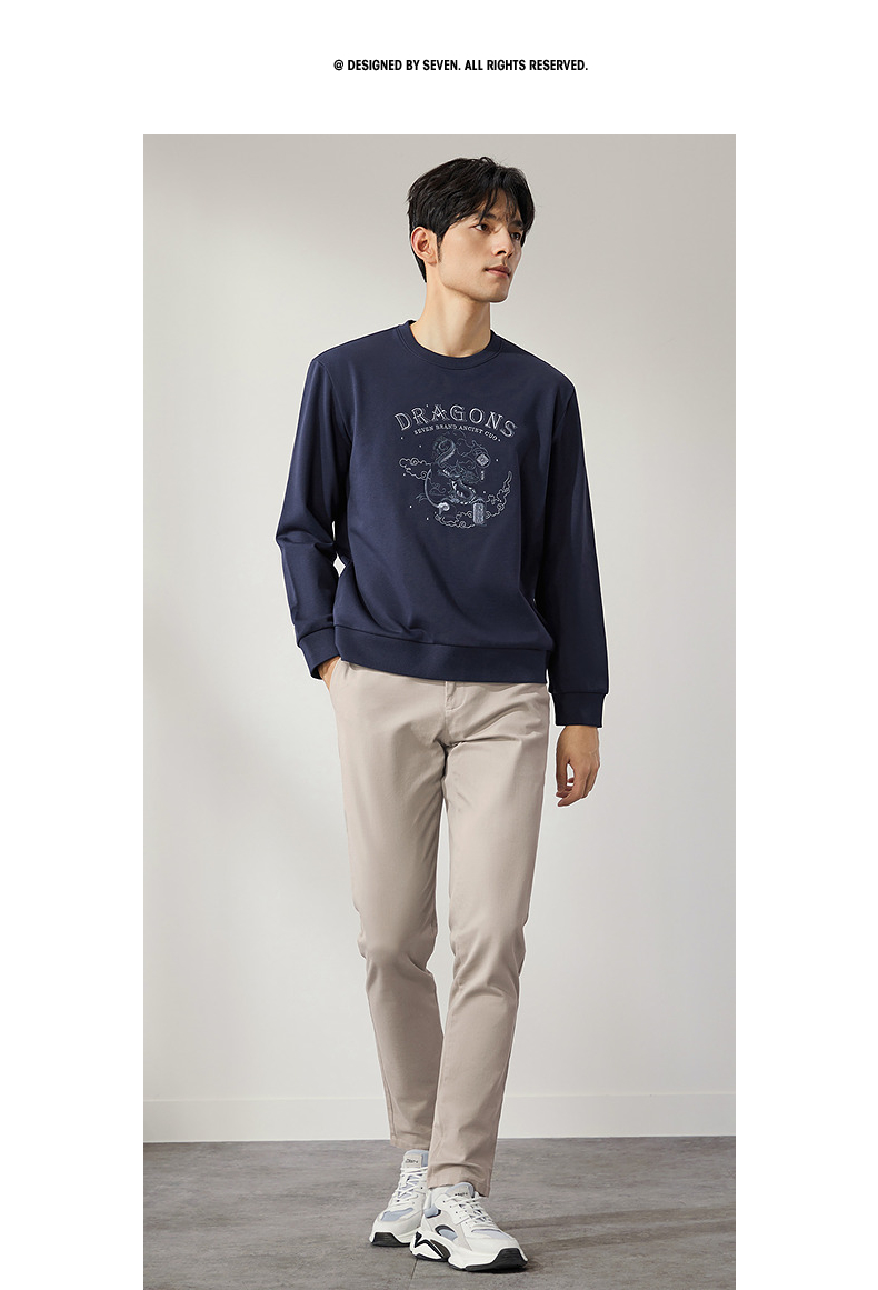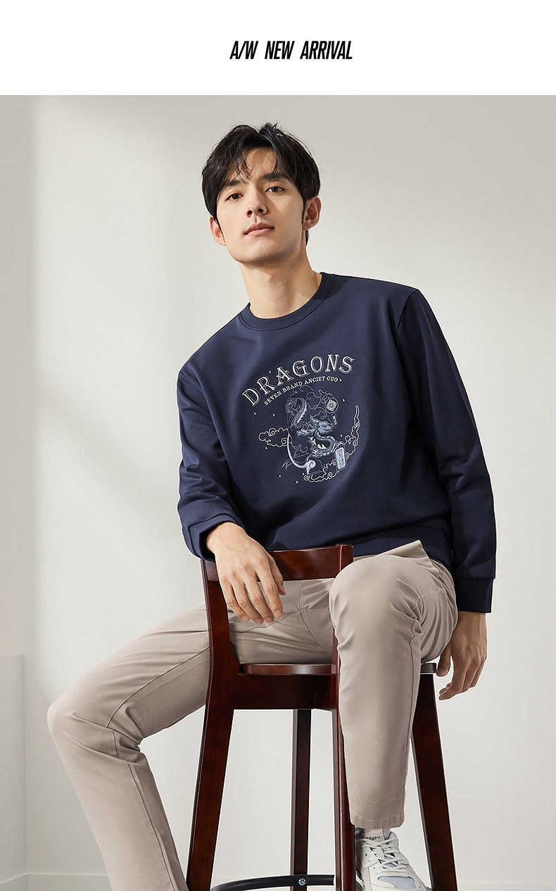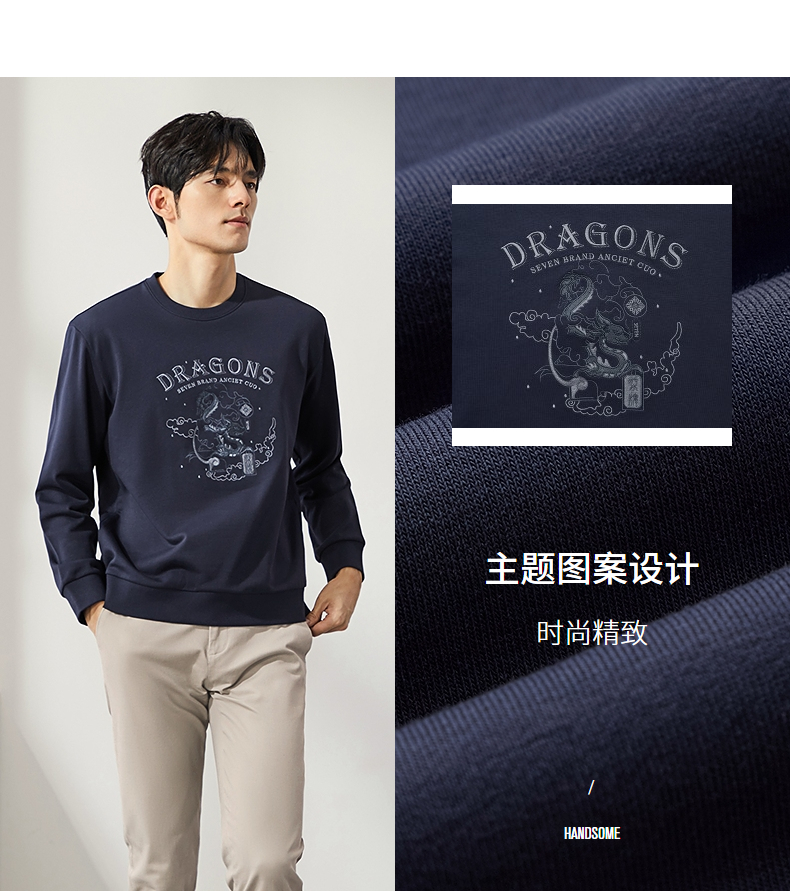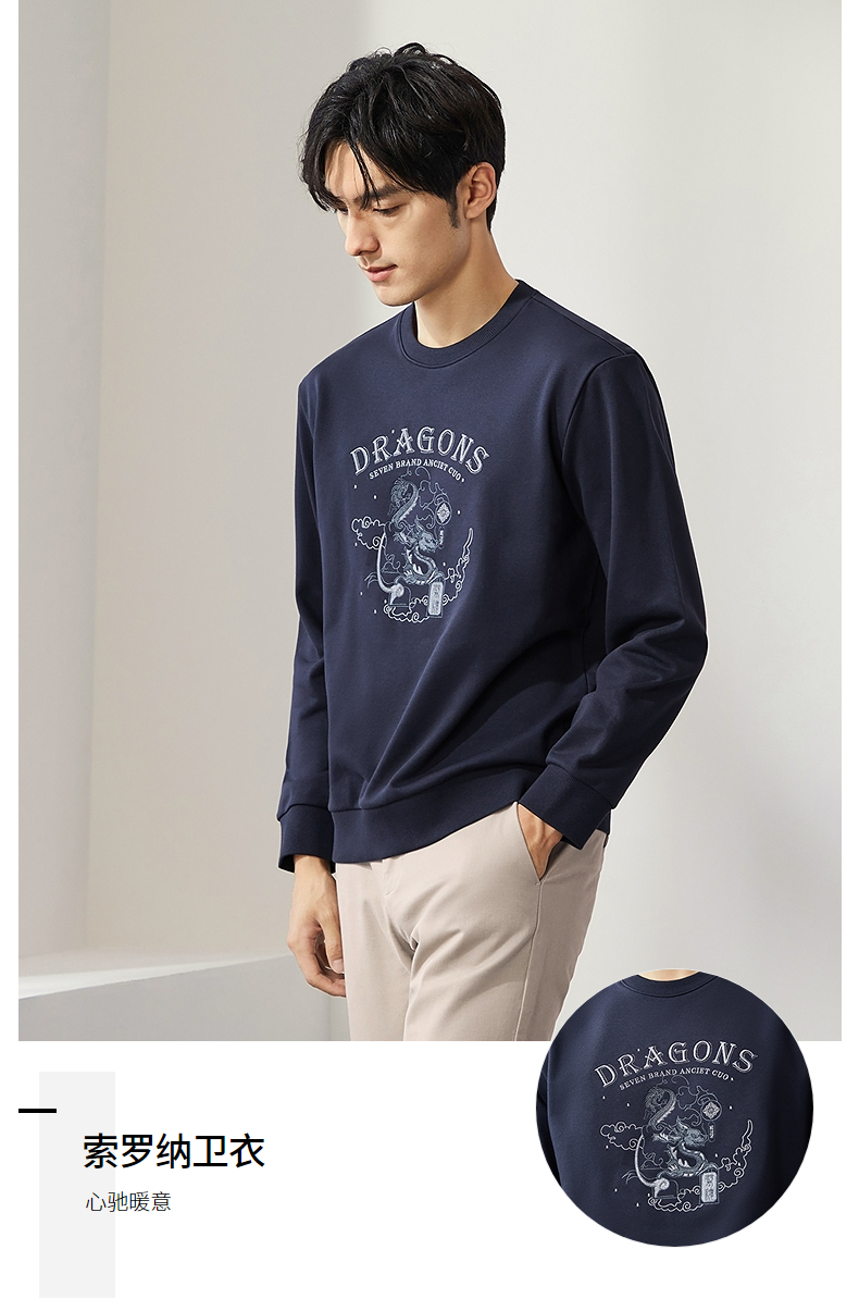 【保型索罗纳】柒牌刺绣圆领卫衣男2024秋季新款宽松休闲套头上衣 127W70350