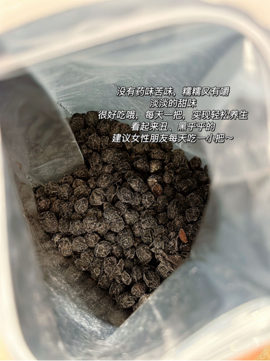 没有药味苦味,糯糯叉有嚼劲,淡淡的甜味 很好吃哦,每天一把,实现轻松养生 看起来丑、黑乎乎的 但是建议女性朋友每天吃一小把~ 当归:润肠通便、活血化瘀、调经 黑豆:清热解毒、补血养肾、抗老防衰~
