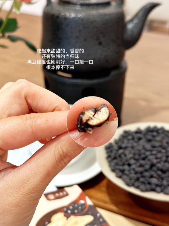 每天一小把,慢慢咀嚼入口就是当归的清香和黑豆香气 黑豆和当归是好搭档一黑一红,对女性很友好! 黑豆能够促进肠道蠕动,还能益气补shen 当归补红,两者搭配 既能养出好气色也不怕发胖