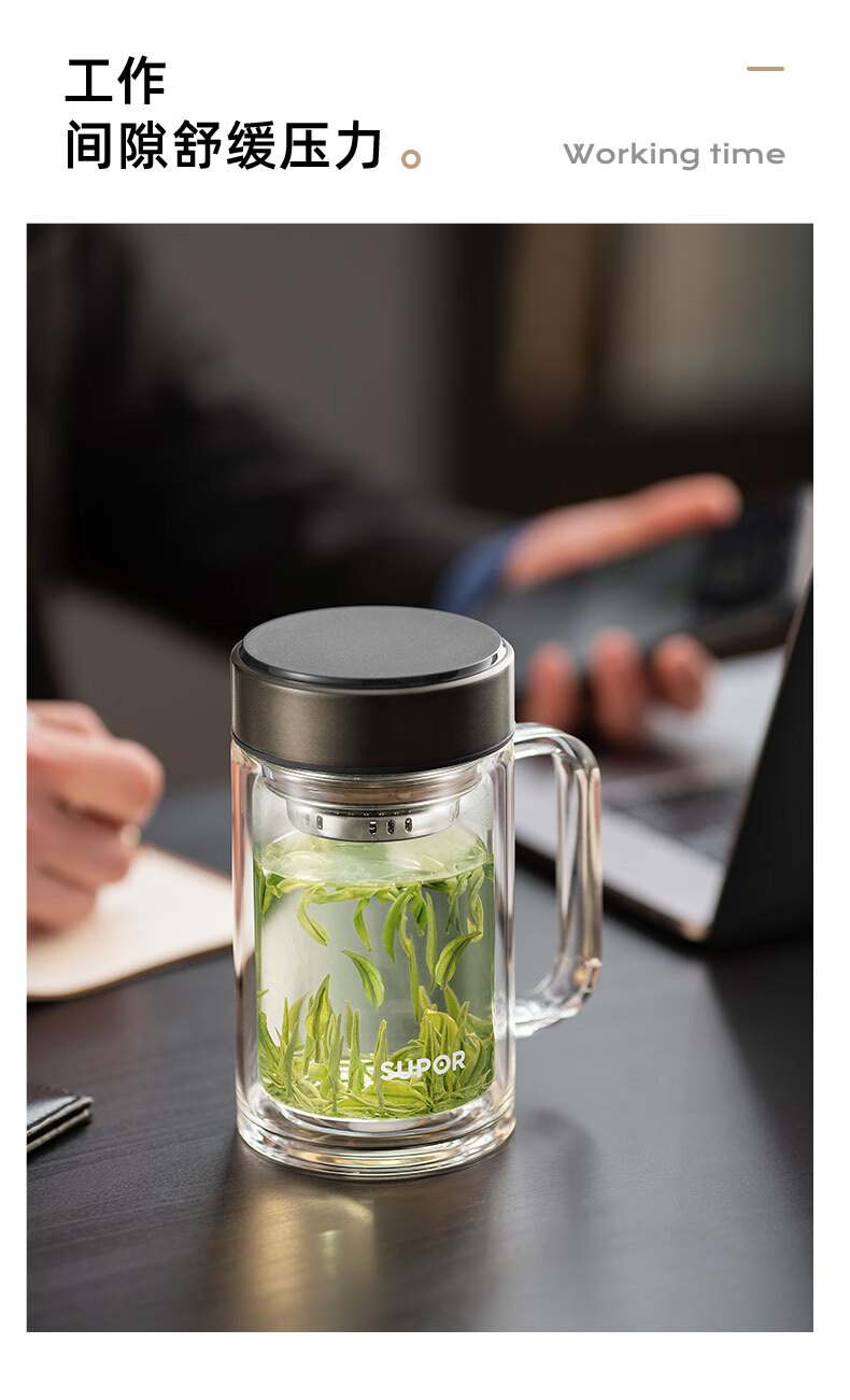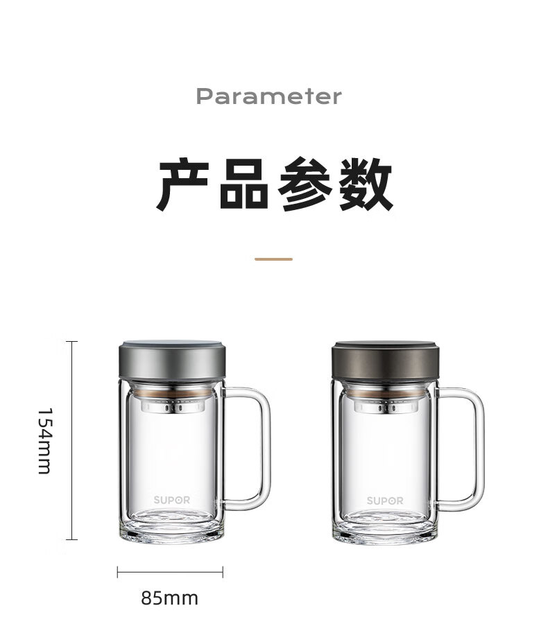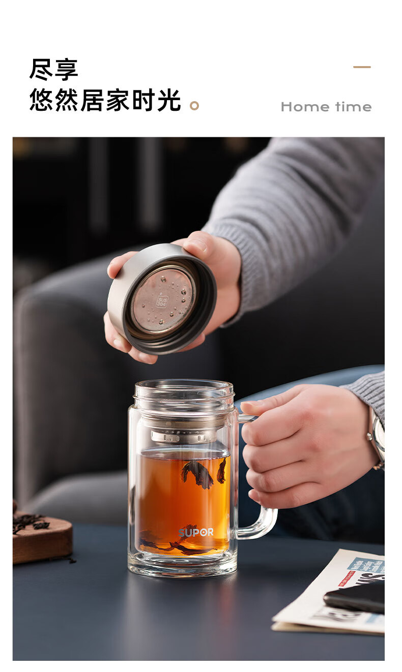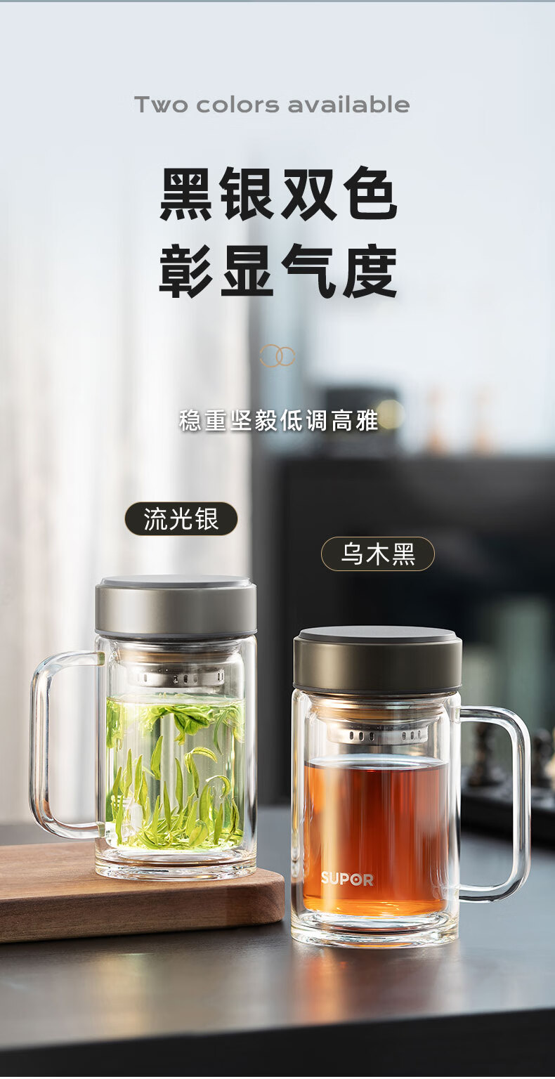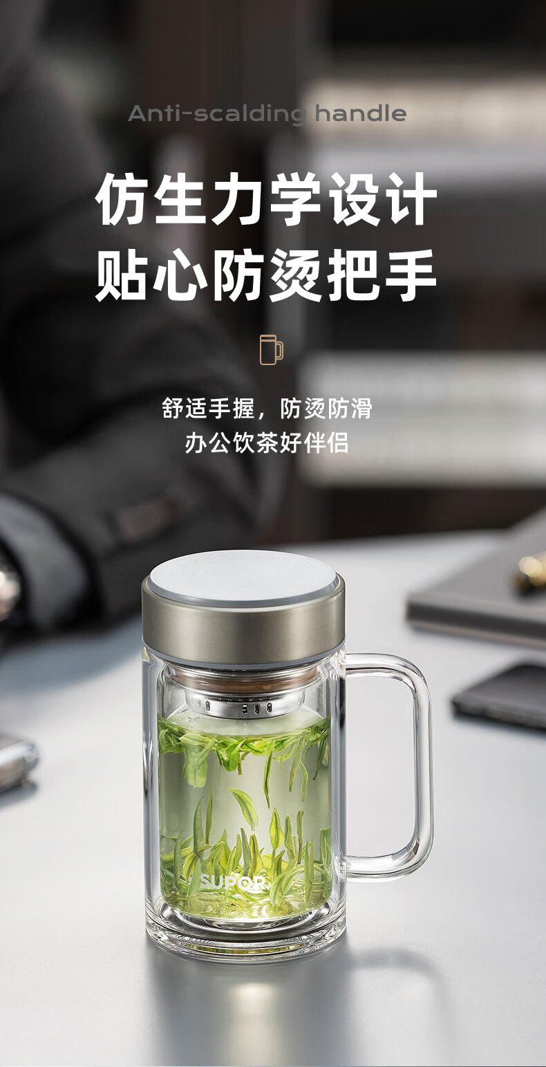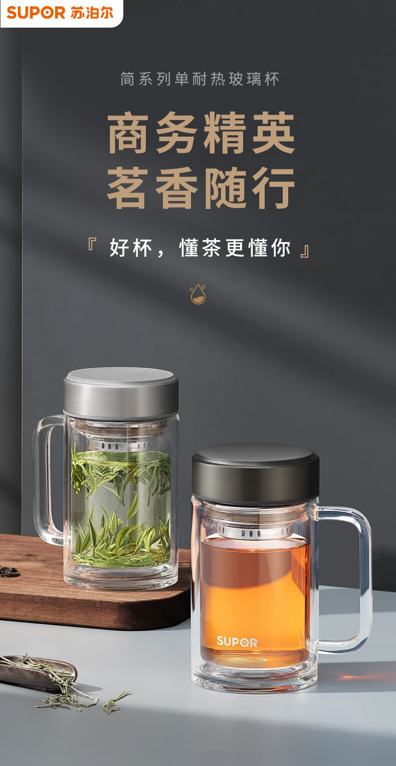 苏泊尔(SUPOR)苏泊尔玻璃杯双层耐热办公杯简系列带把手泡茶杯男女办公室大容量水杯子 KC45HK10乌木黑450ML
