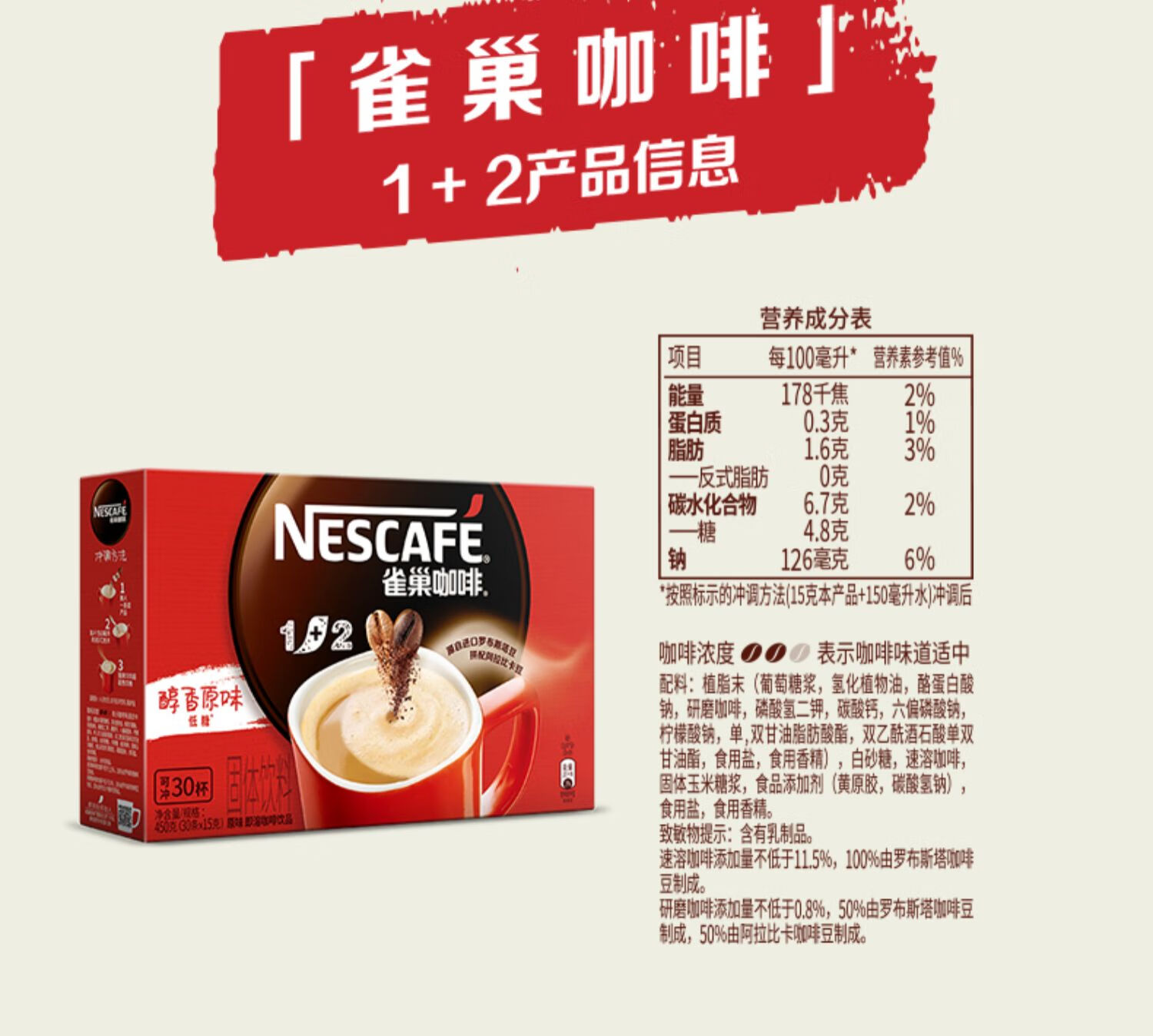 雀巢(Nestle) 咖啡1+2特浓即溶咖啡 12(30x13g) CN