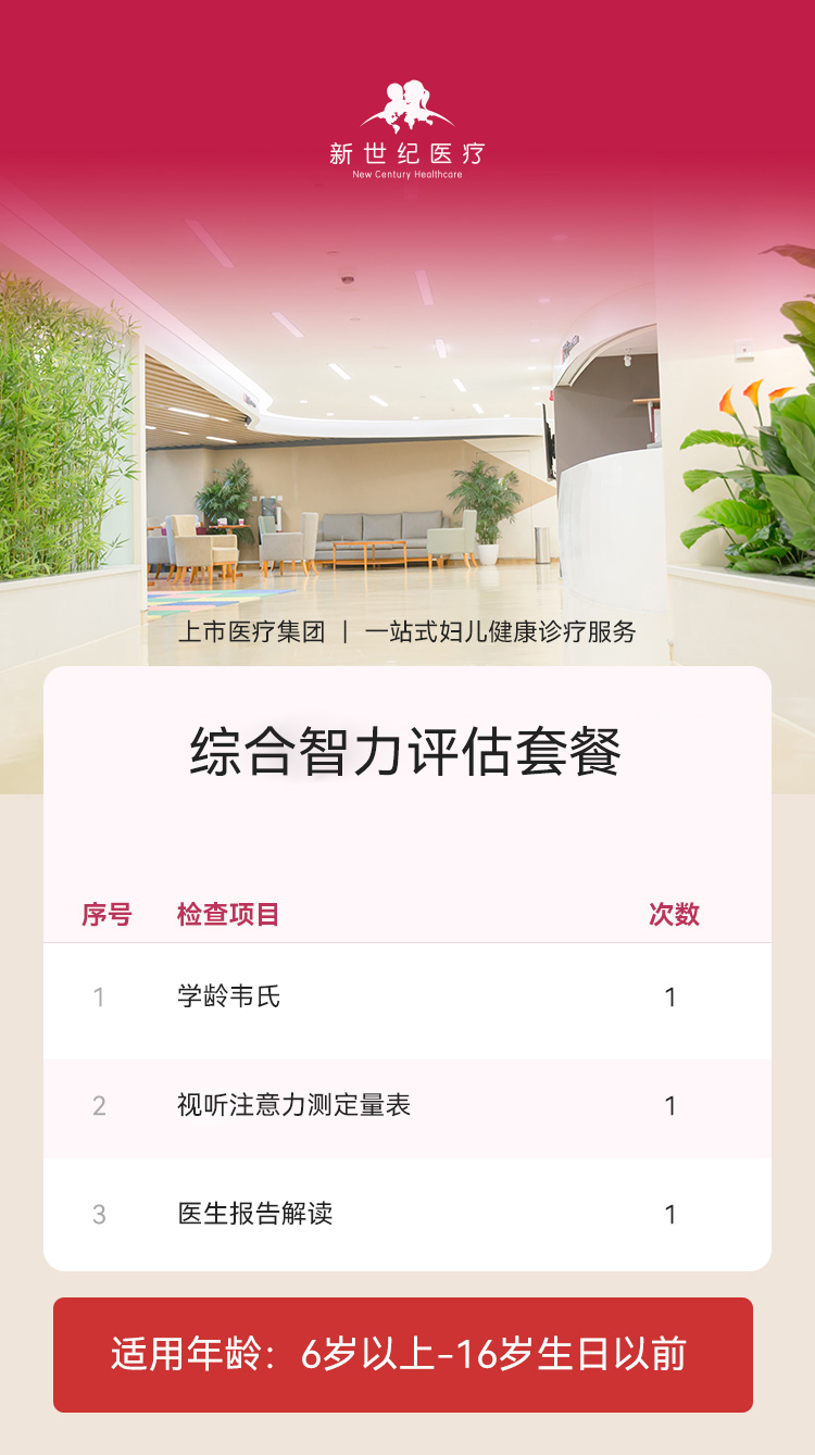 本评估为针对6-16岁儿童的综合智力评估。其中包含韦氏评估量表评估孩子智力发育水平,同时包含客观的注意力测查项目。根据结果,医生会根据不同情况给与不同建议,比如做注意力训练,转神经内科、心理咨询,或给予一对一专业指导等。