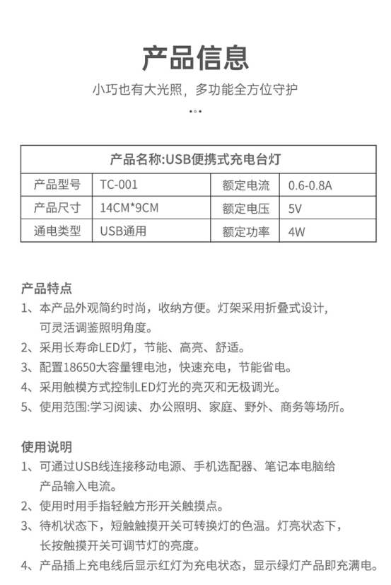 自带大容量电池设计,满足您多场景使用。USB接口输入~ 随时随地即插即用~ 灯体可多角度调节,可更具使用调节到舒适角度。满足不同场景的使用~