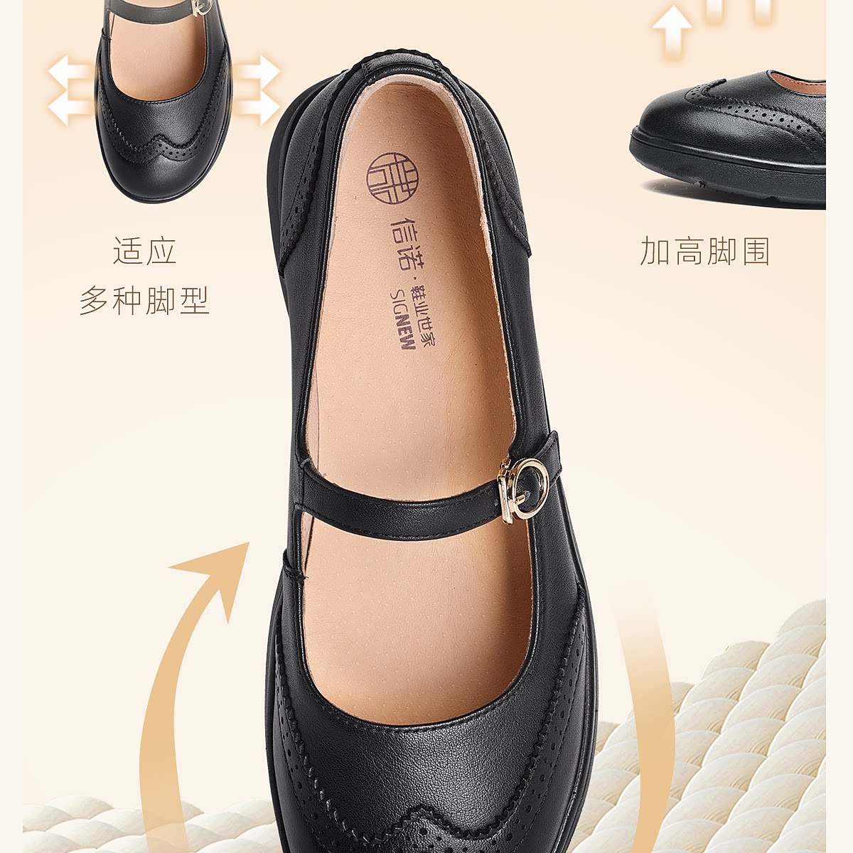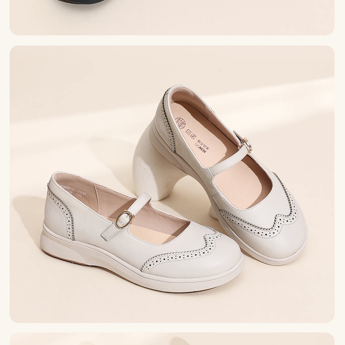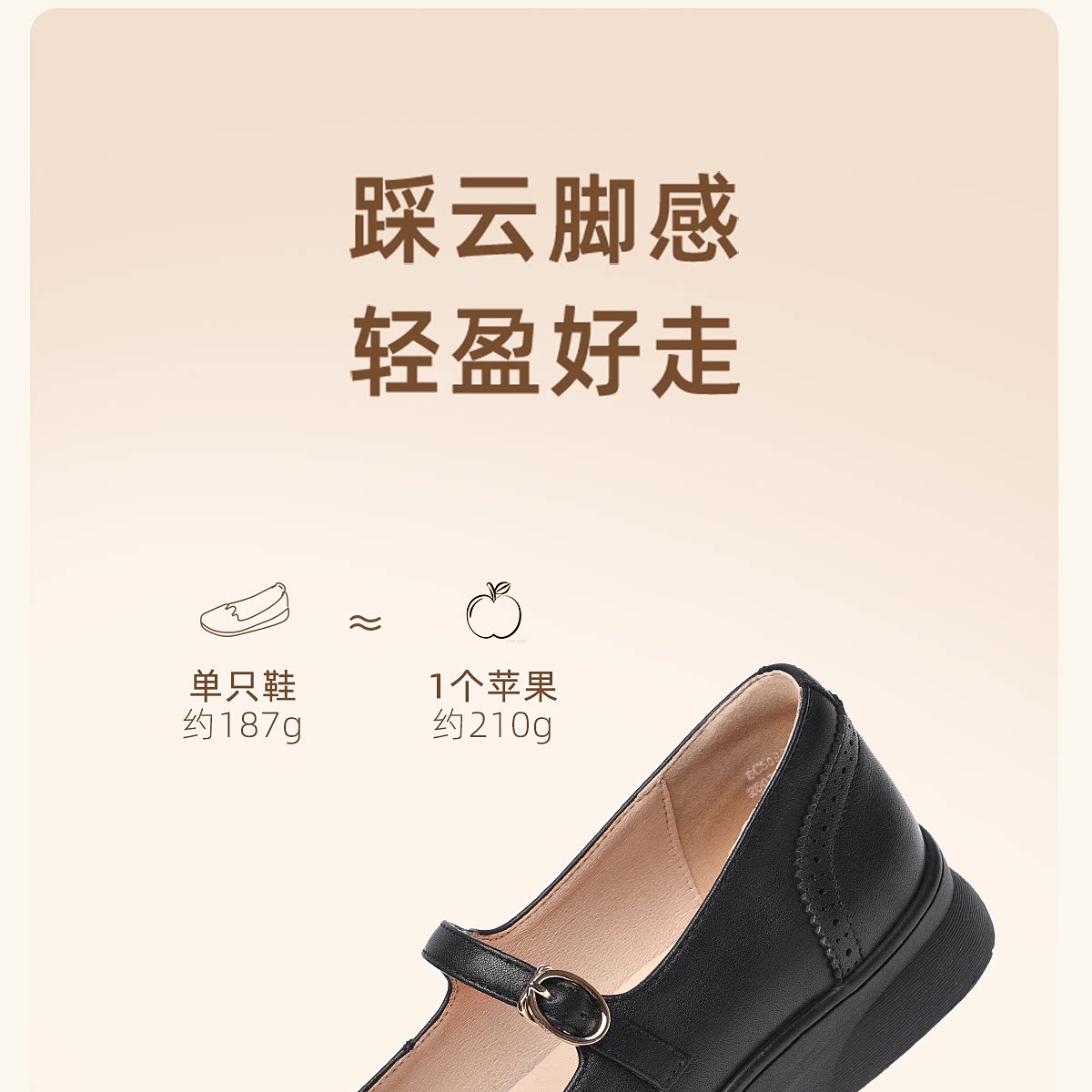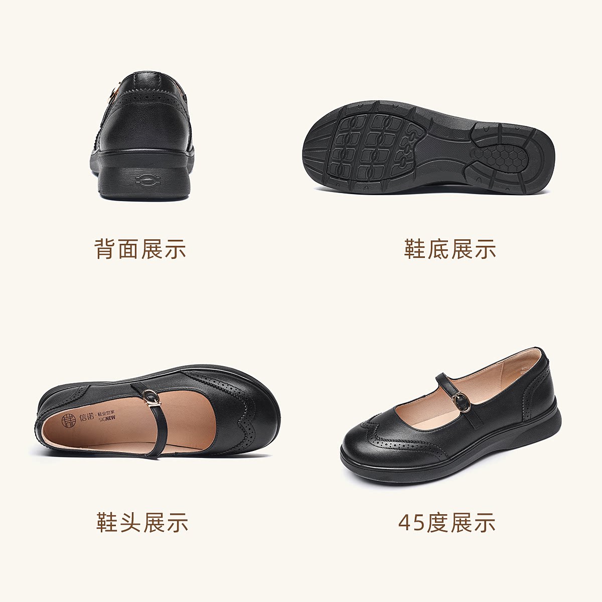 黑色真皮玛丽珍鞋女平底一字扣带雕花软底舒适单鞋6C5096-6