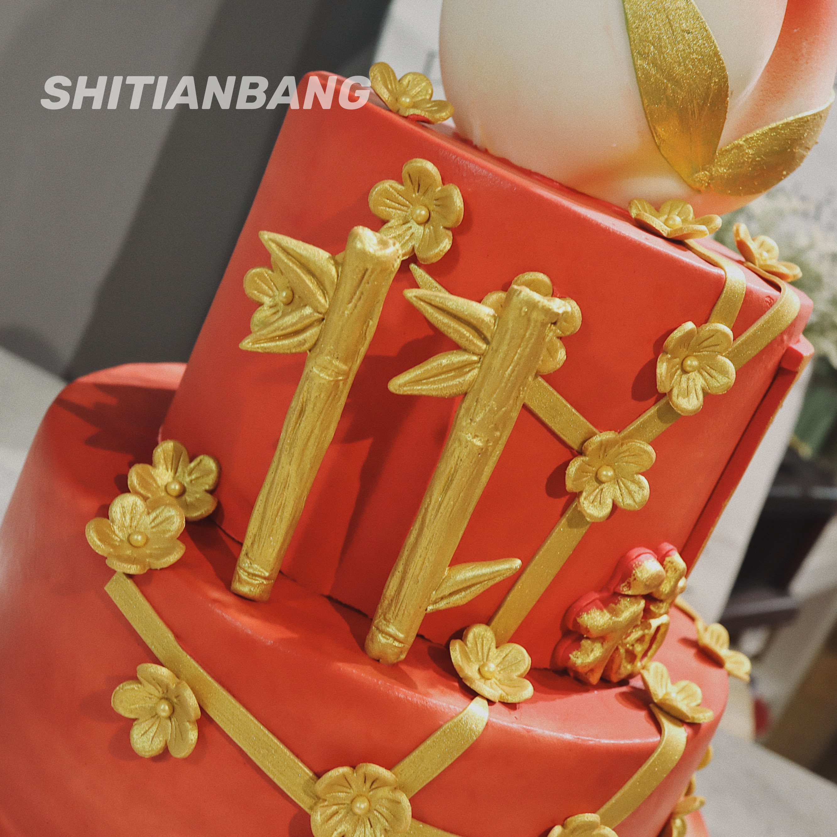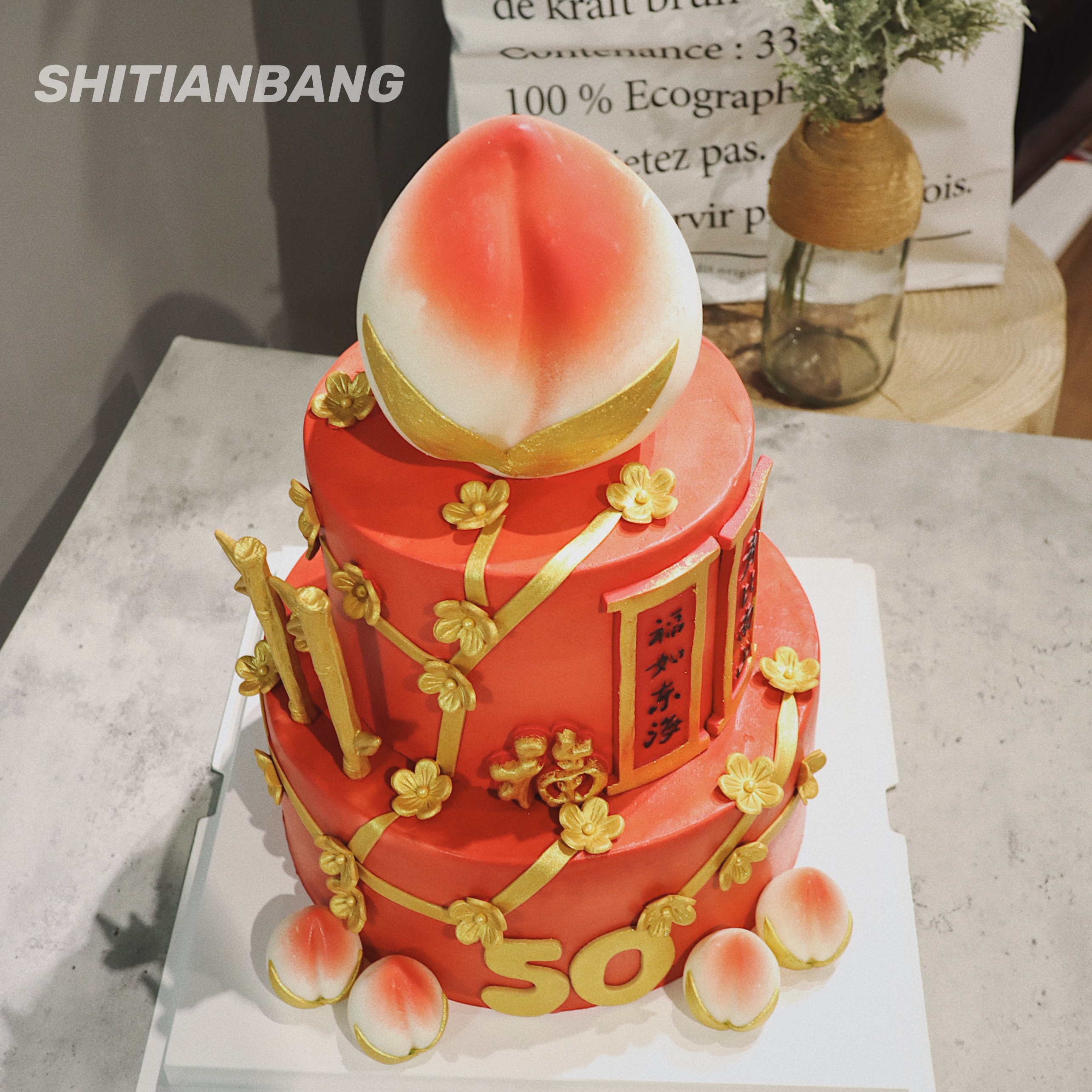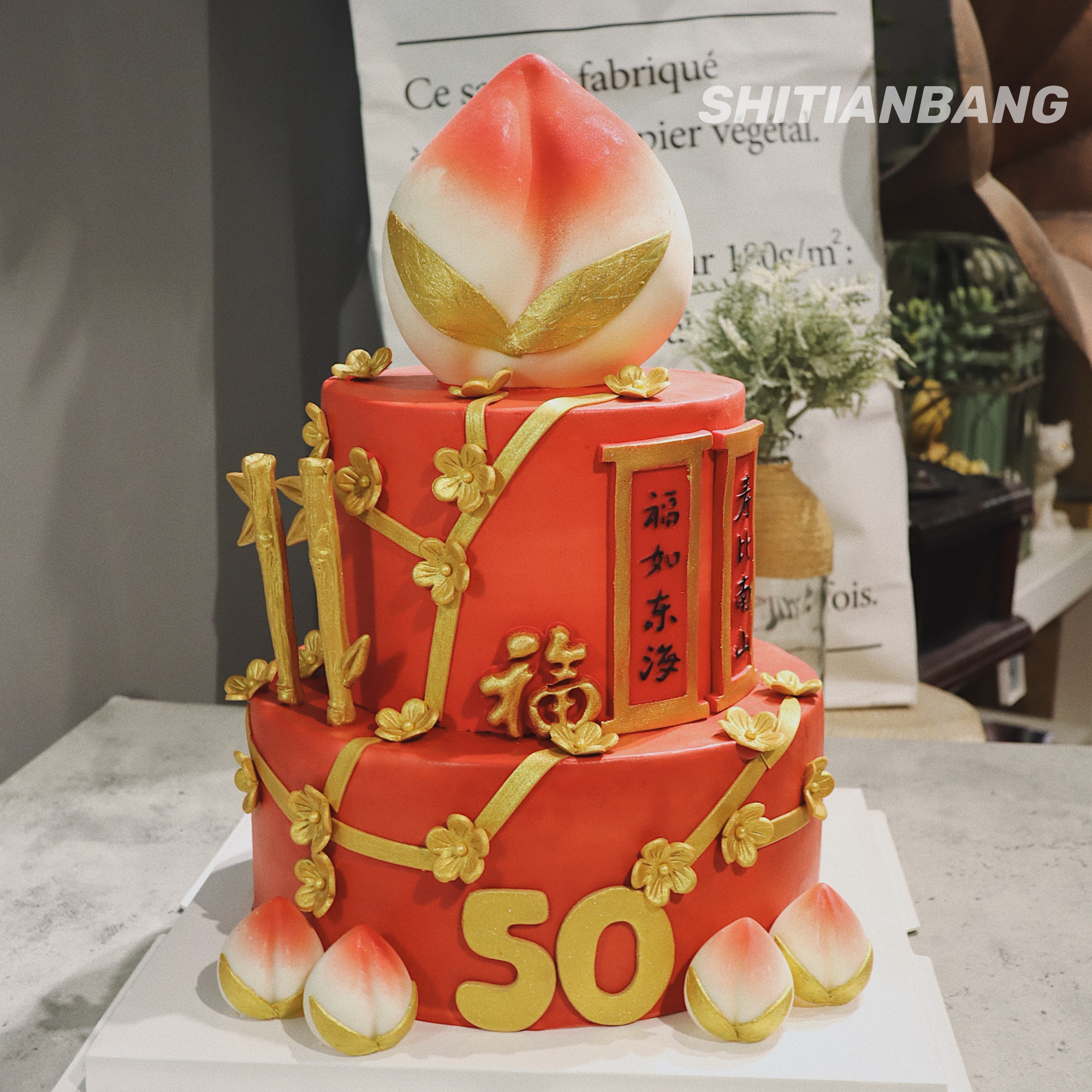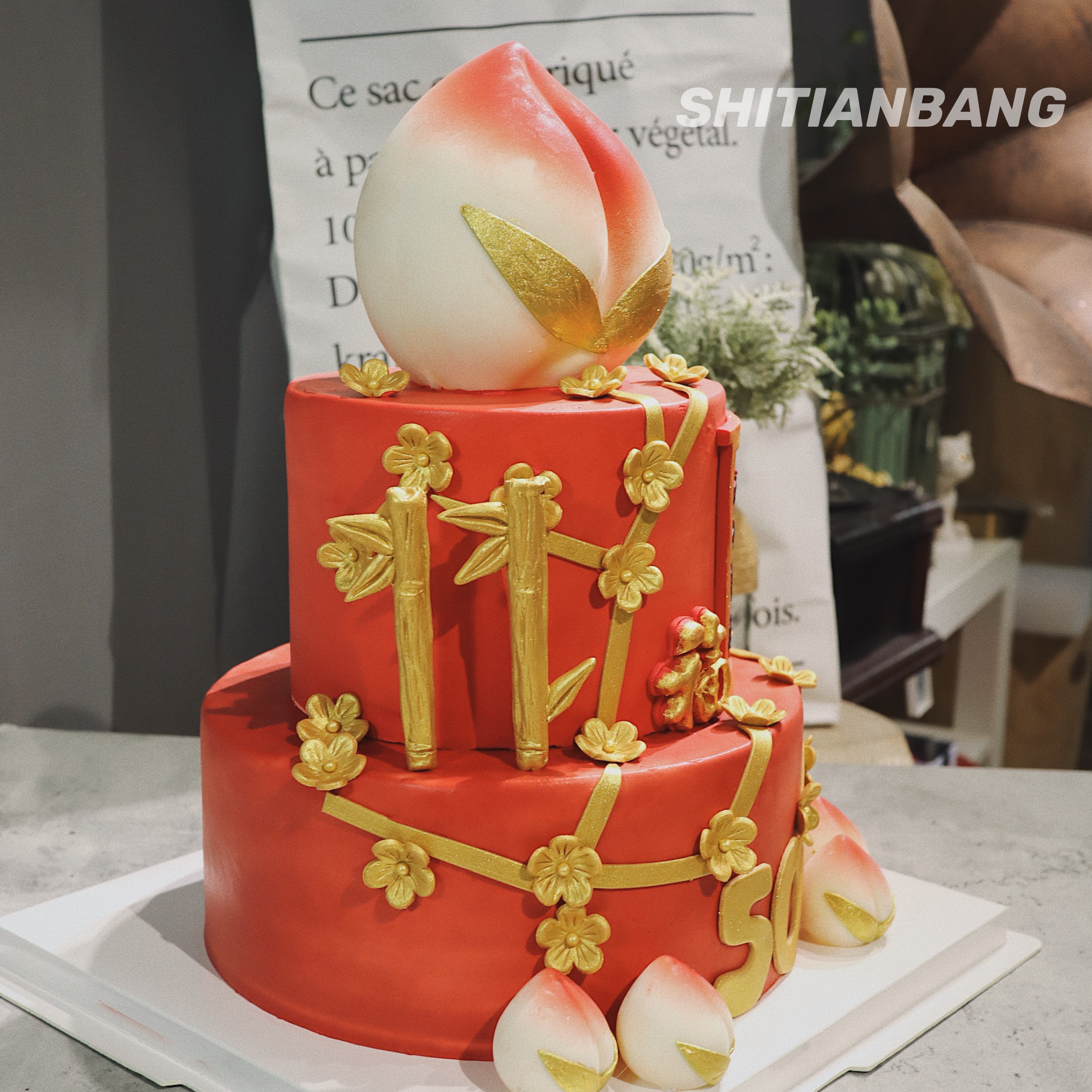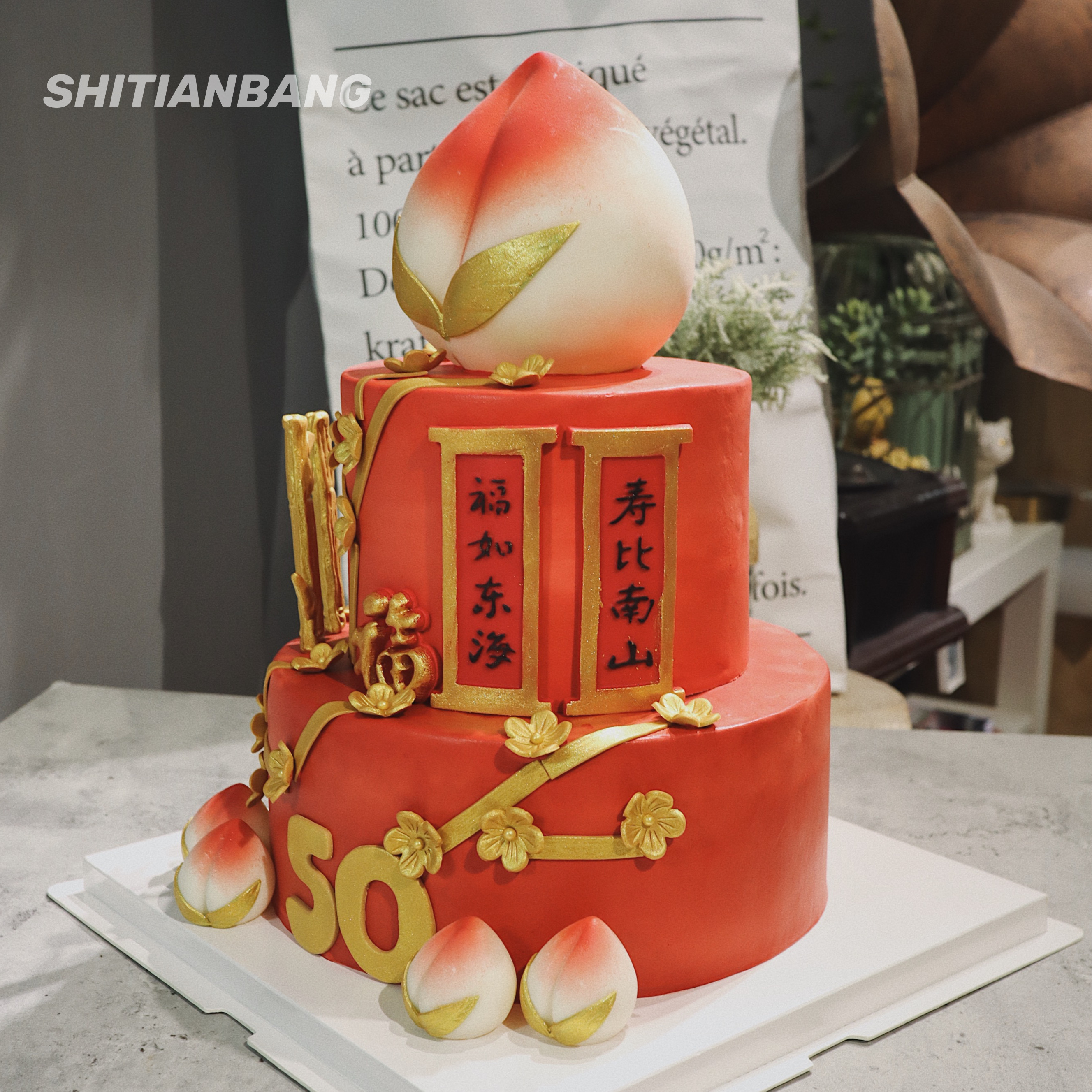 蛋糕表面装饰寿桃是巧克力做的哦!